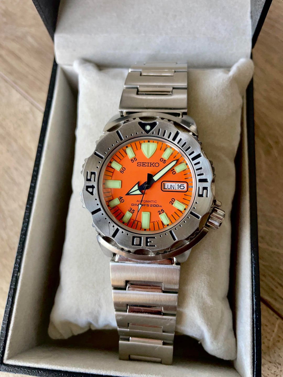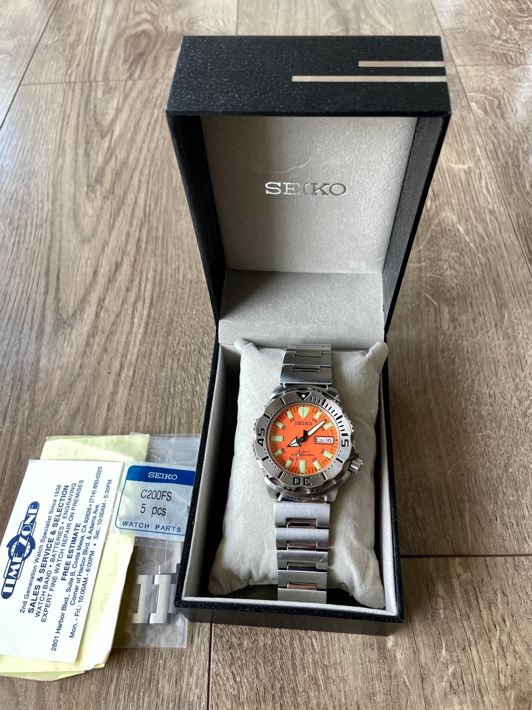 Hi all, Selling my Orange Monster Gen 1 in great condition. It’s been serviced in 2021 with box and papers. Comes on original seiko bracelet, fits 7” wrist. With additional links. **Specs**: 7S26 automatic caliber. 200 Meters. Stainless steel case 42mm. Hardlex crystal. Screw-down crown. 21 jewels. 41 hours of power reserve. 21,600 bph Runs +-8 **Price**: $425. Accepting Paypal or in person sale. Located in Albany, NY. No Trades. **Payment**: Paypal Preferred Accepting F&F, or G&S (+4.4% paid by buyer) Timestamp: https://imgur.com/a/NP5QkgM **Shipping Method**: Shipped CONUS via USPS
