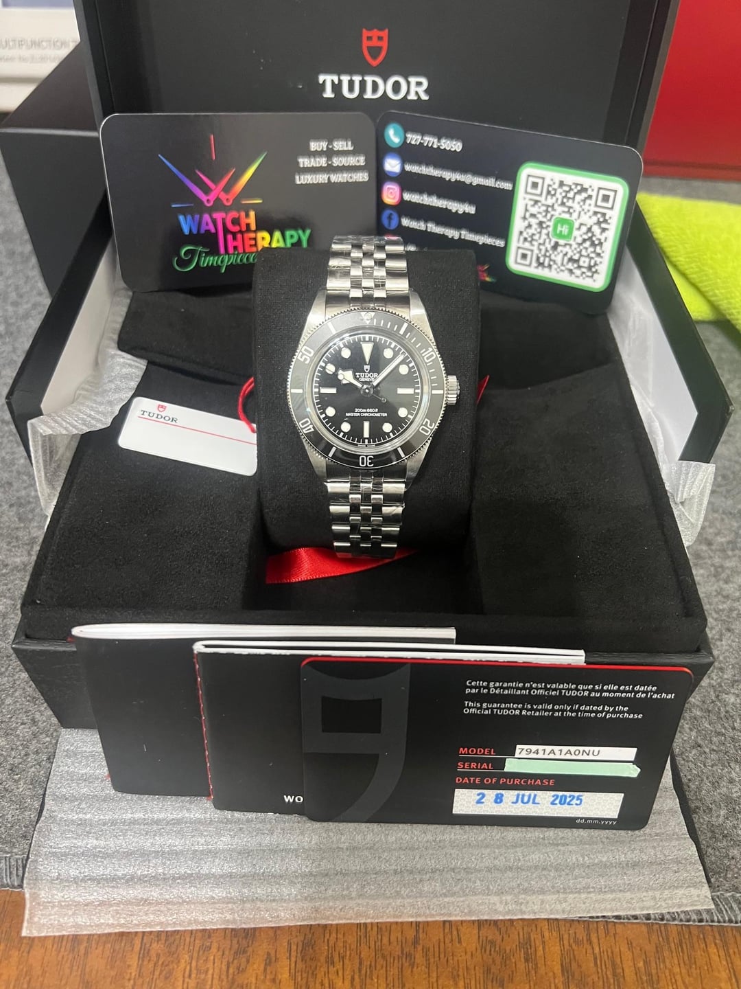 **F/S: New Tudor Black Bay 41 Monochrome Jubilee 7/25 Ref# M7941A1A0NU** **Specs:** \* Black domed dial w/silver hour markers \* Automatic self-winding \* 41mm \* Five-link Jubilee style bracelet with T-Fit clasp \* 200M Water Resistance \* 70-hour power reserve \* MT5602-U (COSC) movement **Includes**: Warranty card 7/25, double boxed, booklets, full links and tag. **Condition:** New unworn with factory stickers, bracelet mummy wrapped **Price: $4,099.00+ Insured shipping to your local FedEx for pick-up in Con US**. I am also open to a face-to-face public transaction in or around the Tampa Florida Region, within reason. I have many strong and viable references within Reddit and from Buy/Sell/Trade Watch Facebook groups. Always willing to jump on a call or meeting link to show you the watch. Thank you and please reach out if you have any questions or concerns. Florida residents may be subject to sales tax w/o a valid reseller cert. ***No Trades, TY*** **Location**: Tampa Florida **Payment:** Zelle or Wire Timestamp: [https://imgur.com/a/9cWvw8b](https://imgur.com/a/9cWvw8b) FB: Watch Therapy Timepieces IG: [@watchtherapy4u](https://www.reddit.com/u/watchtherapy4u/)