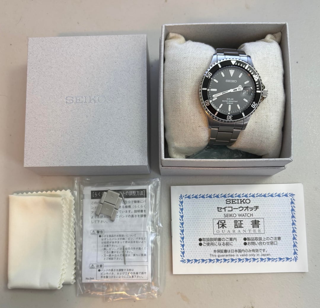 WTS this Submariner-style Japan-only Seiko diver. timestamp: [https://imgur.com/a/f0zSlnG](https://imgur.com/a/f0zSlnG) I bought this a year ago and it has served me great but I'm getting a new dive watch so have to let this one go. It's in virtually spotless condition except for desk-diving scratches on the bracelet (let me know if you want more pictures or to Facetime). 41mm diameter with a solar-powered quartz movement that keeps great time (charge lasts \~6 months). 100m water resistance. Original box, papers, extra links, and cloth included. Asking $299 shipped in CONUS or best offer. Shipment insured and tracked.