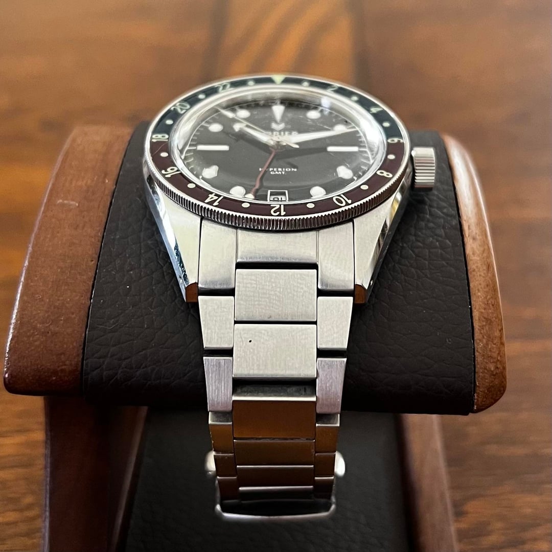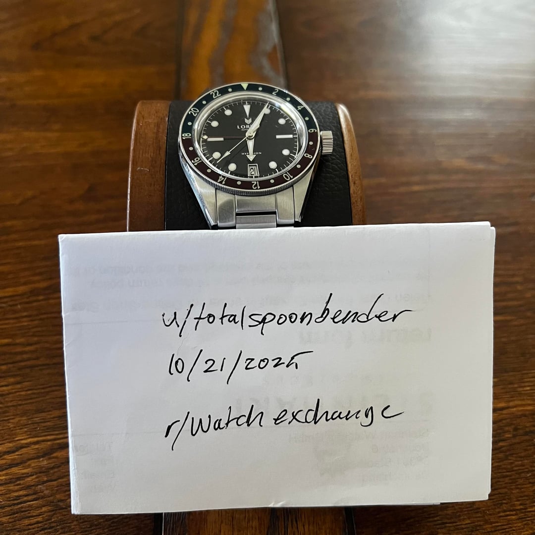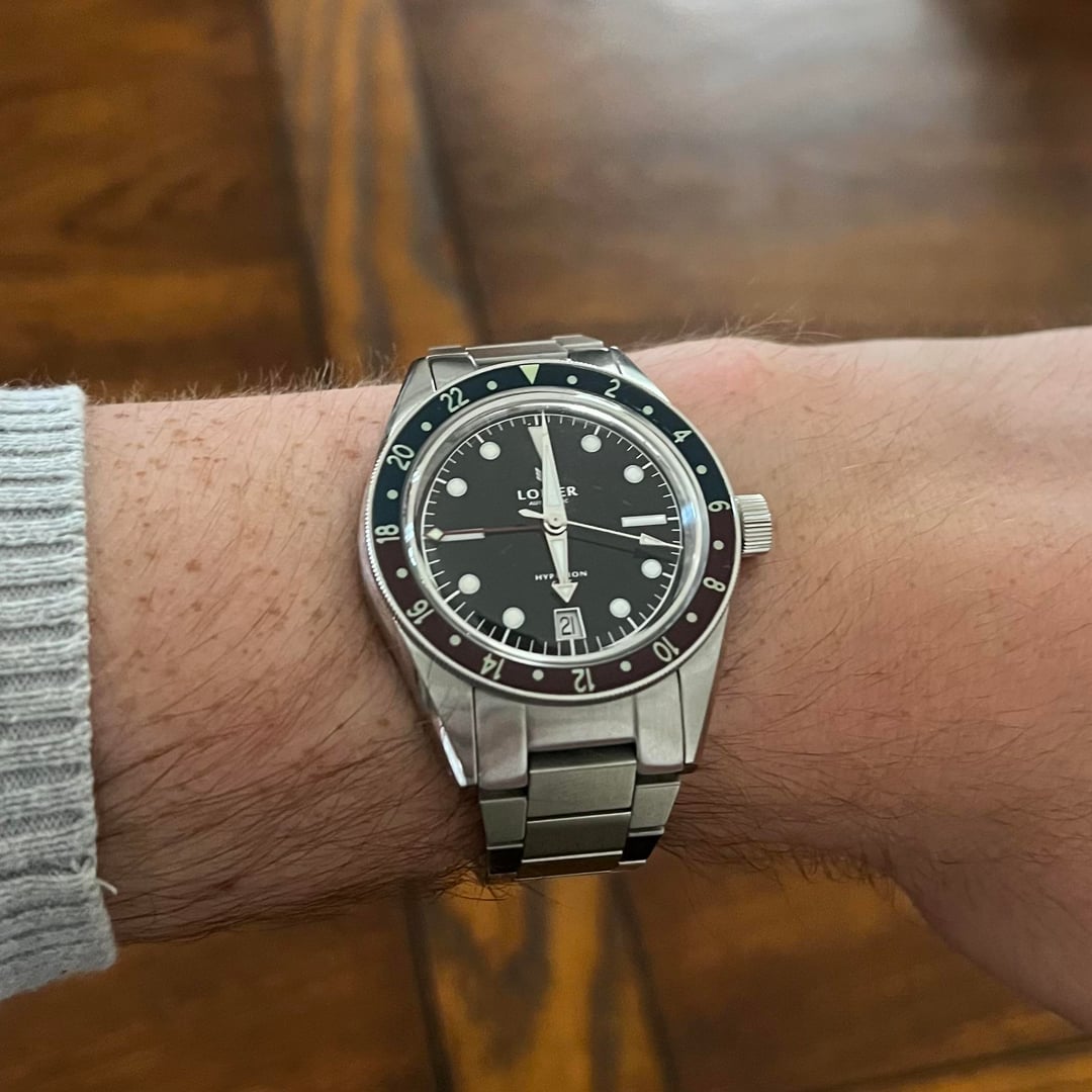 Here is my beloved Lorier Hyperion GMT Series I. I am the second owner of this piece having purchased it from its original owner in September of 2023. If you know anything about the brand, you'll know that Lorier is a fantastic microbrand from New York, NY (fantastic owners) that specializes in making watches that authentically look and feel as though they've come straight out of a time machine from the 50's and 60's - meaning they also use many of the same materials such as warm domed hesalite crystals and acrylic bezels. This caller's GMT features a 48 click bidirectional acrylic bezel that is fully lumed with C3 superluminova. The hands and indices are contain bright BGW9 superluminova and are silver, which has since been discontinued by the brand and is pretty difficult to find these days. The watch wears incredibly thin for an automatic GMT with 100M water resistance at a svelte 10.7mm - box-domed hesalite crystal included. A 47mm lug to lug with a nicely curved case profile will surely hug just about any wrist size and it's a total strap monster. This is the last edition of the Hyperion to feature the Swiss-made Soprod C125 GMT movement before they switched to the chunkier Miyota 9075. The thinness of the case makes this edition highly sought after. Although not a flyer's GMT like the current model, the accurate Soprod movement favors a quickset roulette date wheel over a jumping local hour hand and is often regarded as more top-of-the-line, hence the higher retail price upon release. Watch has hairlines and some minor scuffs to the clasp from daily wear, but the crystal, case, and bracelet are pristine. If anything this watch was built to show some wear. Includes original box, extra links, screwdriver for links, polywatch to keep that crystal like-new, Lorier travel pouch, papers and a note from the founders of Lorier to the original buyer. I’ve also included a burgundy leather single pass strap that works wonderfully with the burgundy on the bezel. Currently sized for my 6.75 inch wrist but I'm willing to size it before shipping. Lorier releases their watches in batches that tend to sell out pretty much instantly, which is why people like myself turn to the secondhand market to obtain their pieces. To my knowledge, this is the one of very few series I Lorier Hyperion GMT with silver hands and indices for sale online anywhere and it's priced fairly and ready to sell! Timestamp: [https://imgur.com/gallery/timestamp-lorier-KiIwUqO](https://imgur.com/gallery/timestamp-lorier-KiIwUqO) Price: $700 Location: Los Angeles, CA No trades please. Zelle preferred.