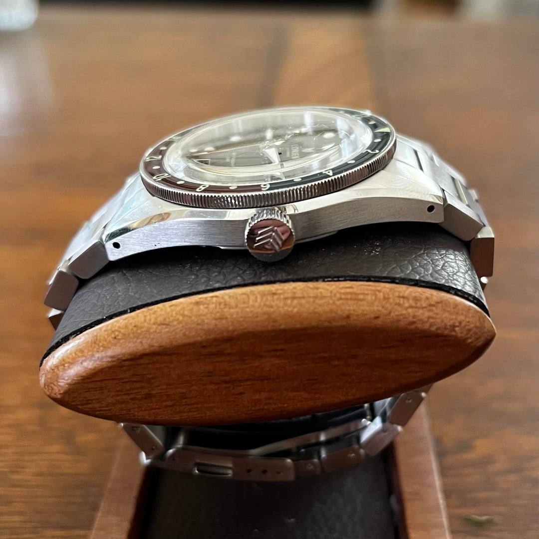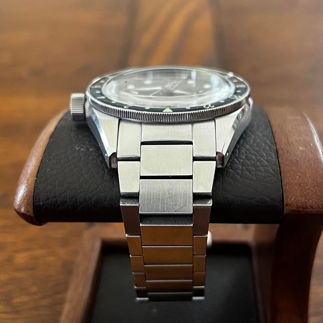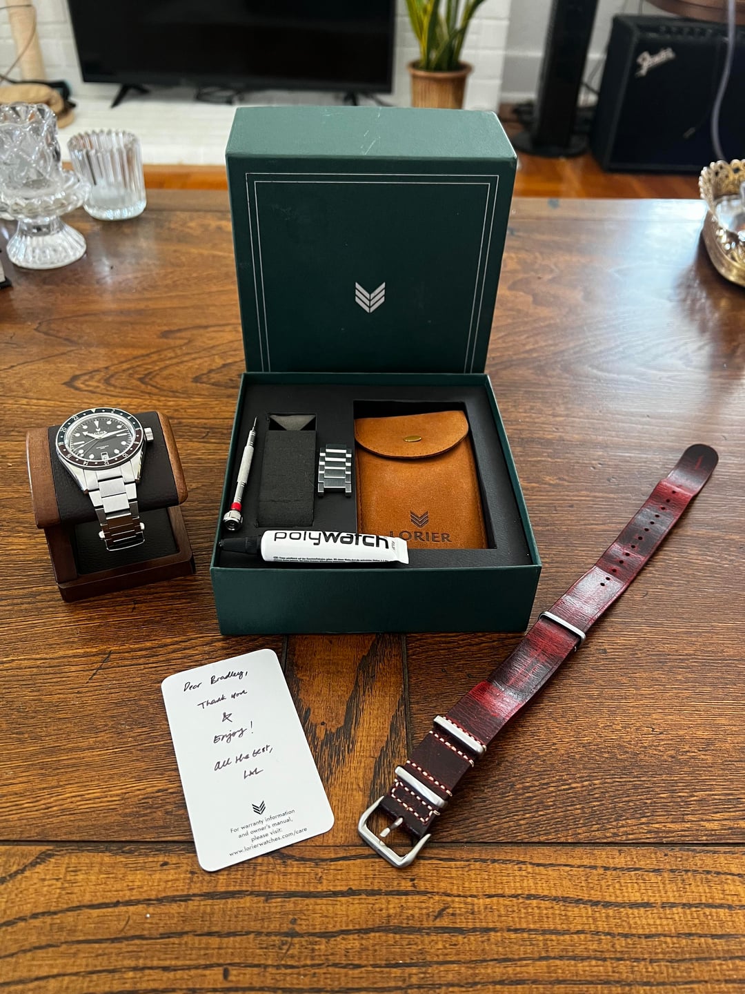 Here is my beloved Lorier Hyperion GMT Series I. I am the second owner of this piece having purchased it from its original owner in September of 2023. If you know anything about the brand, you'll know that Lorier is a fantastic microbrand from New York, NY (fantastic owners) that specializes in making watches that authentically look and feel as though they've come straight out of a time machine from the 50's and 60's - meaning they also use many of the same materials such as warm domed hesalite crystals and acrylic bezels. This caller's GMT features a 48 click bidirectional acrylic bezel that is fully lumed with C3 superluminova. The hands and indices are contain bright BGW9 superluminova and are silver, which has since been discontinued by the brand and is pretty difficult to find these days. The watch wears incredibly thin for an automatic GMT with 100M water resistance at a svelte 10.7mm - box-domed hesalite crystal included. A 47mm lug to lug with a nicely curved case profile will surely hug just about any wrist size and it's a total strap monster. This is the last edition of the Hyperion to feature the Swiss-made Soprod C125 GMT movement before they switched to the chunkier Miyota 9075. The thinness of the case makes this edition highly sought after. Although not a flyer's GMT like the current model, the accurate Soprod movement favors a quickset roulette date wheel over a jumping local hour hand and is often regarded as more top-of-the-line, hence the higher retail price upon release. Watch has hairlines and some minor scuffs to the clasp from daily wear, but the crystal, case, and bracelet are pristine. If anything this watch was built to show some wear. Includes original box, extra links, screwdriver for links, polywatch to keep that crystal like-new, Lorier travel pouch, papers and a note from the founders of Lorier to the original buyer. I’ve also included a burgundy leather single pass strap that works wonderfully with the burgundy on the bezel. Currently sized for my 6.75 inch wrist but I'm willing to size it before shipping. Lorier releases their watches in batches that tend to sell out pretty much instantly, which is why people like myself turn to the secondhand market to obtain their pieces. To my knowledge, this is the one of very few series I Lorier Hyperion GMT with silver hands and indices for sale online anywhere and it's priced fairly and ready to sell! Timestamp: [https://imgur.com/gallery/timestamp-lorier-KiIwUqO](https://imgur.com/gallery/timestamp-lorier-KiIwUqO) Price: $700 Location: Los Angeles, CA No trades please. Zelle preferred.