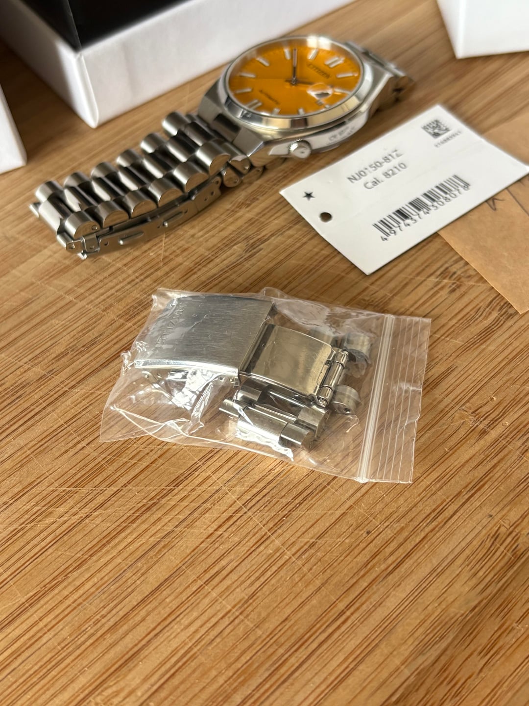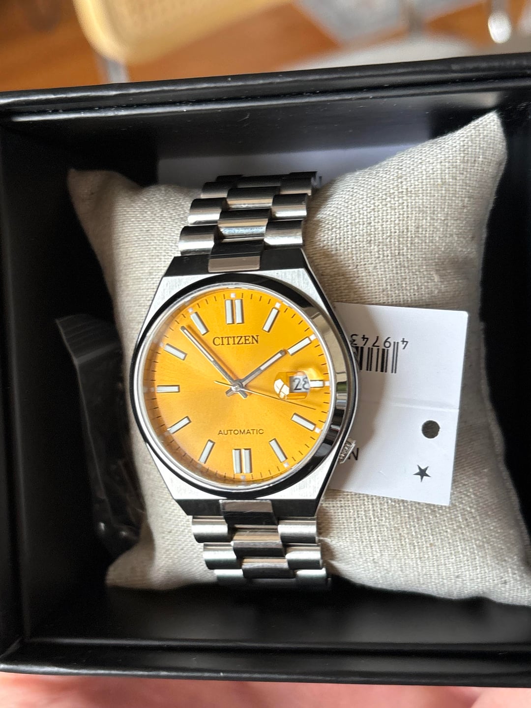Hi everyone. I have for sale today the hot yellow Citizen Tsuyosa NJ0150-81Z, sad to see it go but need to free up some space/avoid owning too many watches lol. 40mm case diameter, sapphire crystal, Miyota mechanical movement, you all know the specs. This one is upgraded to have a new machined clasp with on-the-fly micro adjust. It’s the gorgeous yellow dial, as you can see. It’s currently sized for my 7.5” wrist, but also comes with 4 extra links and the OEM clasp, all in the original box. The crystal is clean and the watch is generally in very good condition. Light desk wear but holds up to scrutiny and looks great, as depicted in the photos. Price is $220, incl. shipping within the US. Once payment arrives I’ll print a label, drop it off, and send you the USPS tracking number right away in our DM, same day. Preferred payment is Venmo/Zelle/PayPal, I don’t have cards set up, my apologies for that. Happy to answer any questions or provide extra photos if you’d like!