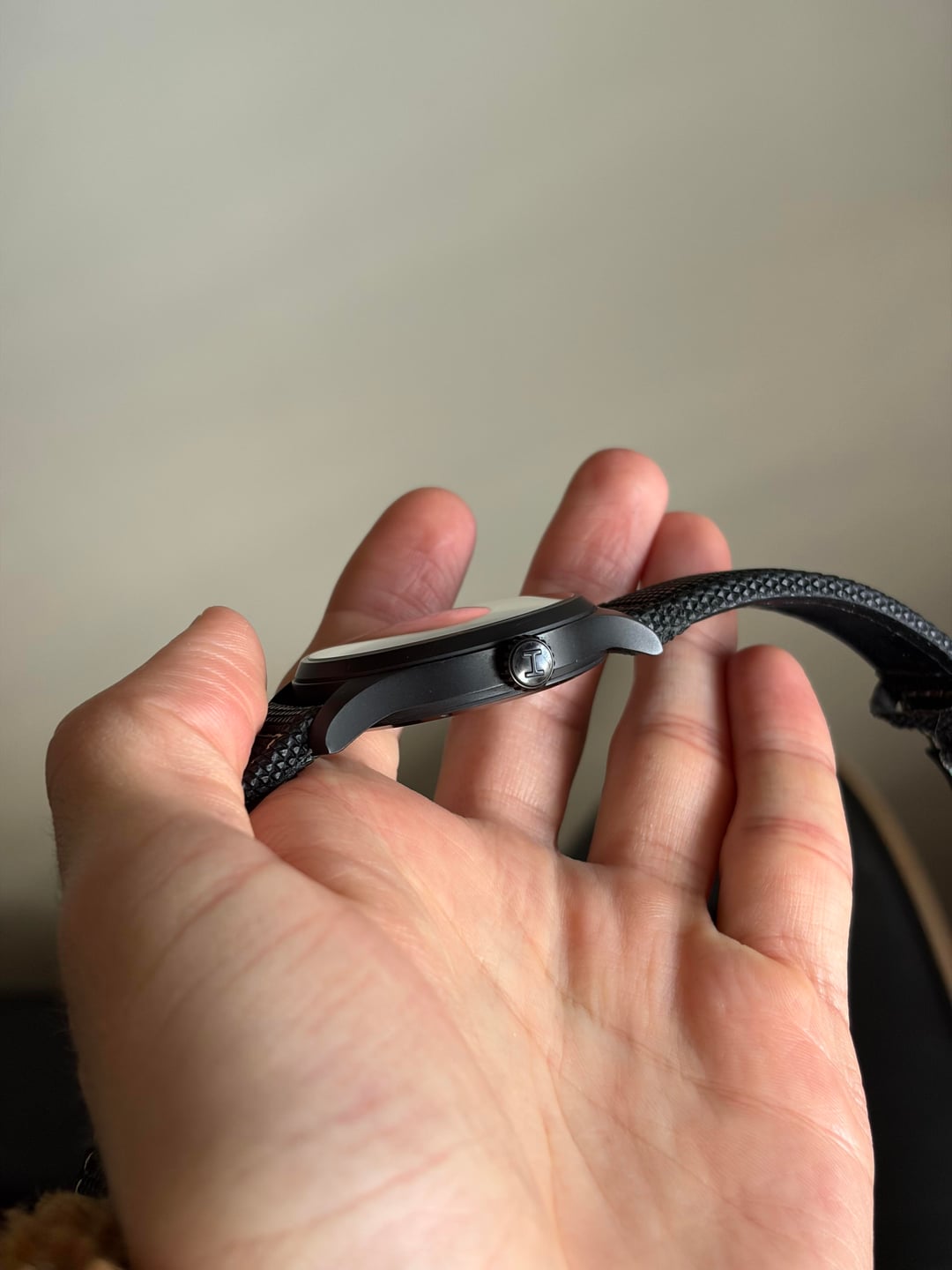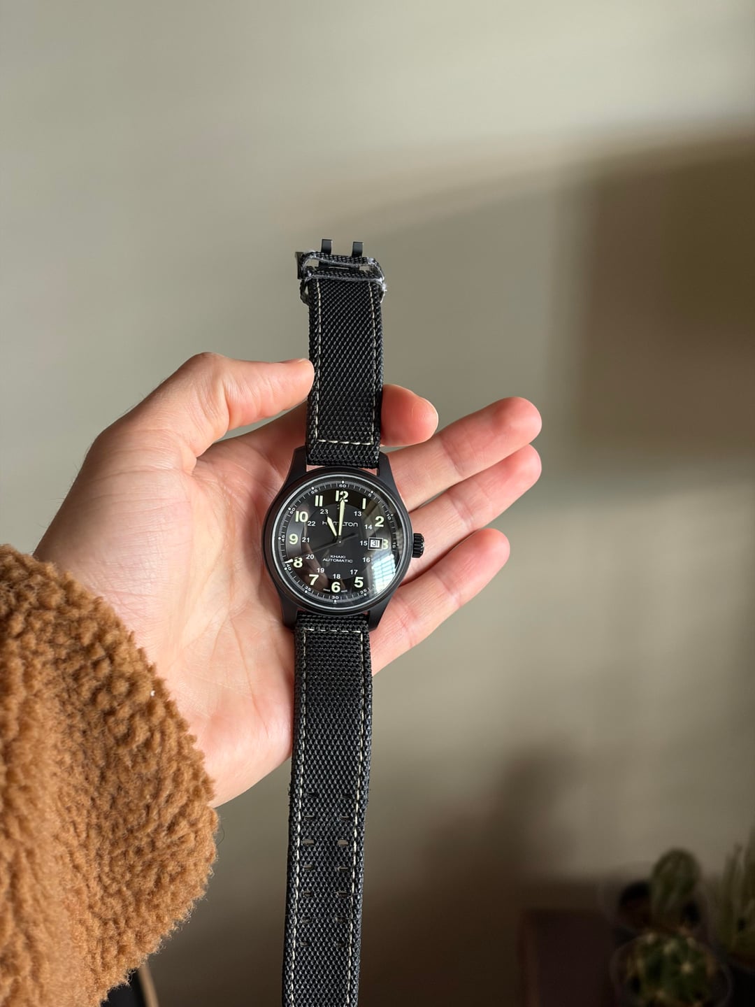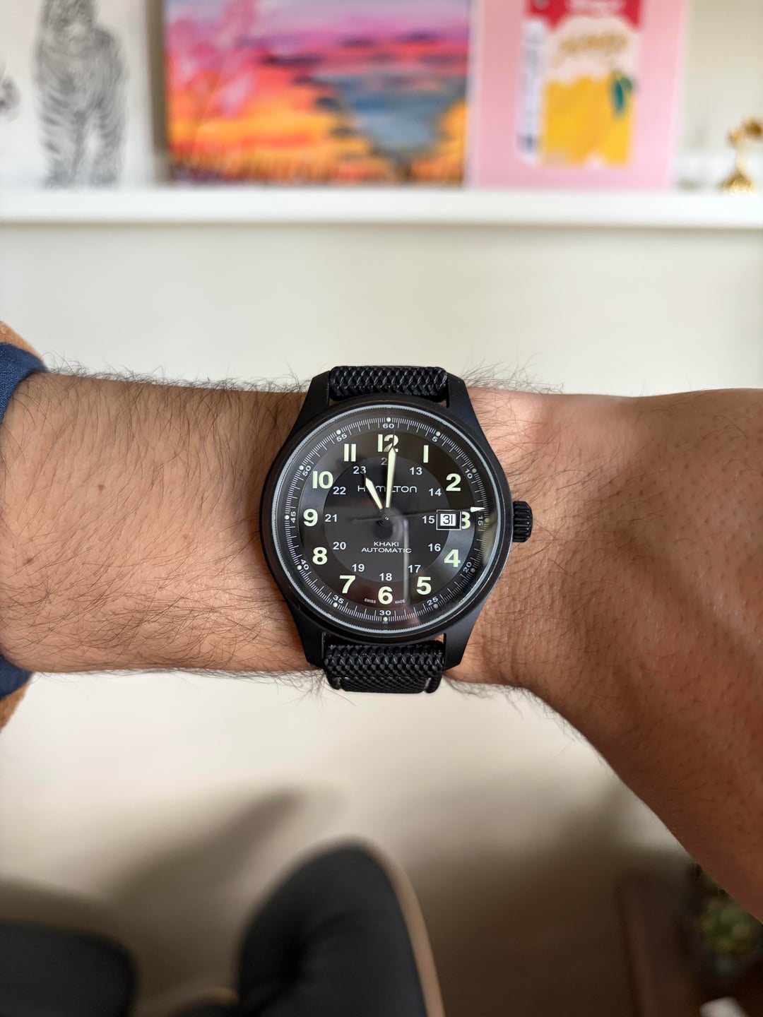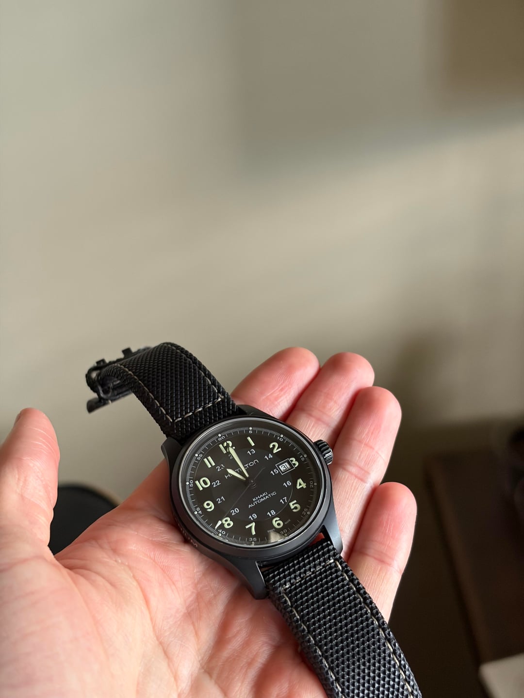 Hi Watchexchange! Today I’m looking to sell a Hamilton Khaki Field Auto Titanium PVD H705750, with a 42mm size. Super clean black on black design with date cut out of 3:00. The watch is in excellent condition overall, with the only real thing of note being a moderate scratch on the sapphire display caseback. No scratches on the dial or case that would be visible in normal wear. Tiny tiny nicks in the PVD coating that I’ve tried to capture but are pretty much imperceptible. Sold as the watch only with original strap that has definitely seen better days, but looks fire on a suedish lighter brown or milk chocolate leather strap. Wears a bit smaller than you might expect - it didn’t overwhelm my baby 6.5ishin wrists due to shorter lug to lug than other khaki fields. Titanium feels great on the wrist. This is the older model with the ETA 2824-2 movement, so shorter power reserve but ticks more smoothly at 4hz. I am asking $540 fully insured, shipped to you anywhere in continental US. I can do Venmo, Zelle, paypal, etc. Second time posting on here, but I have tons of 5 star reviews on Facebook marketplace and positive feedback on eBay. Happy to do whatever it takes to make you feel comfortable and secure!