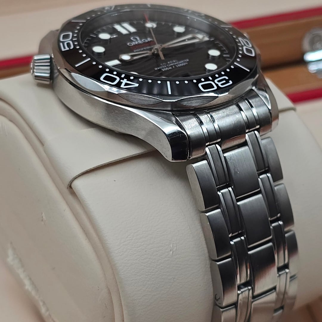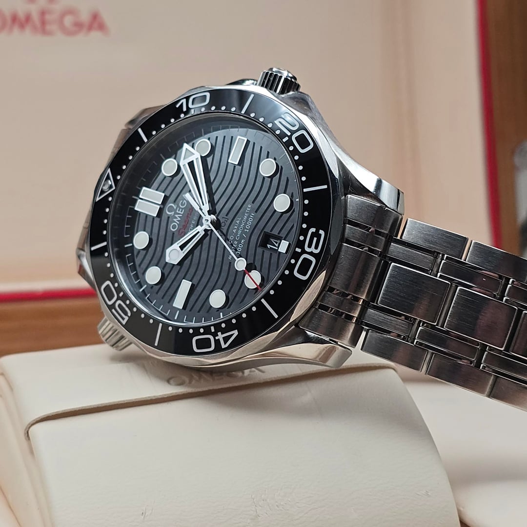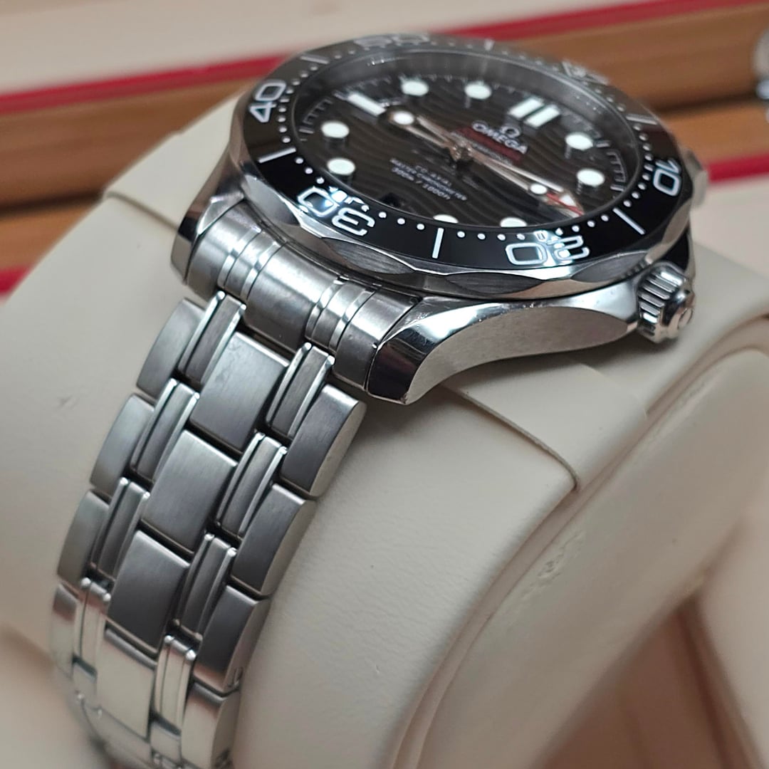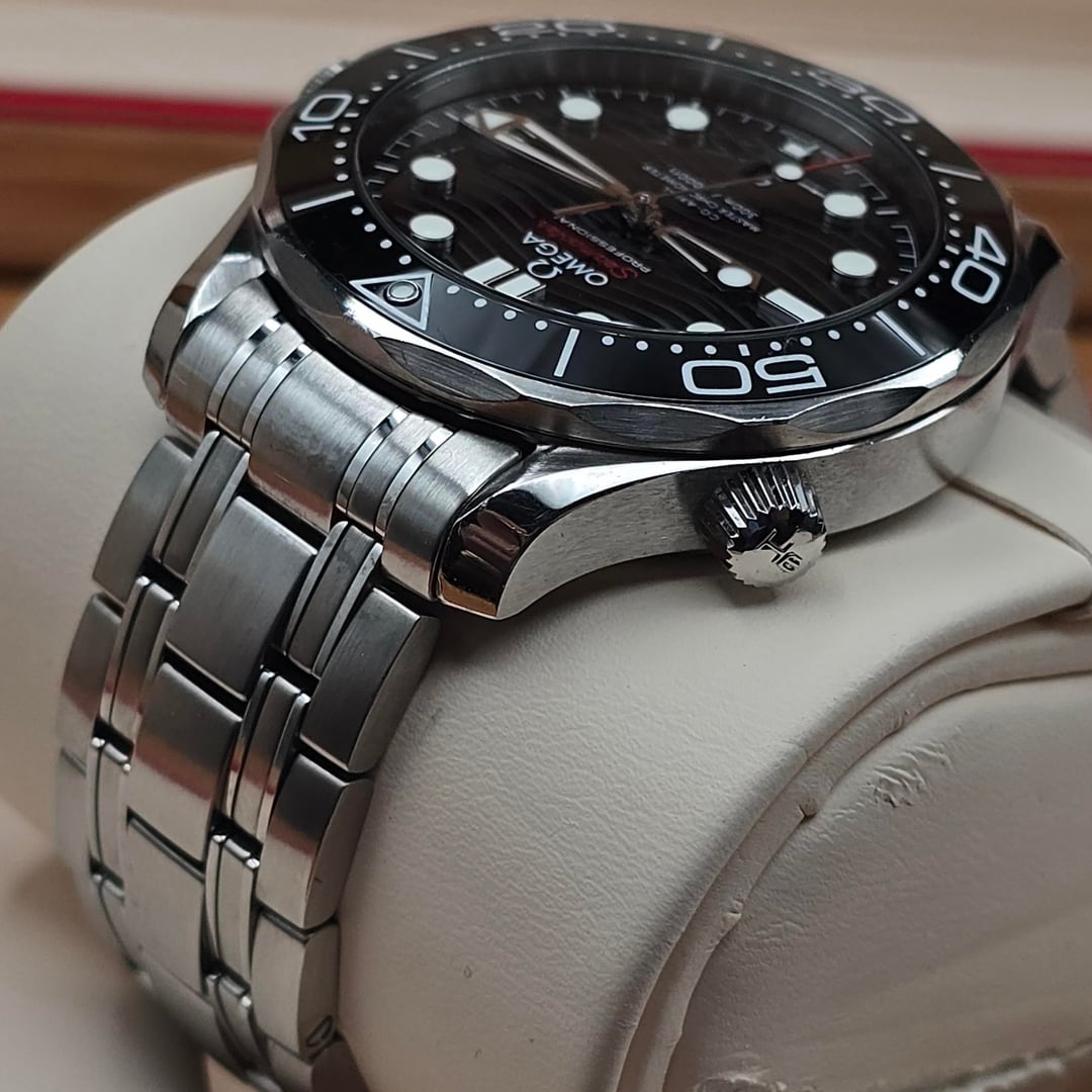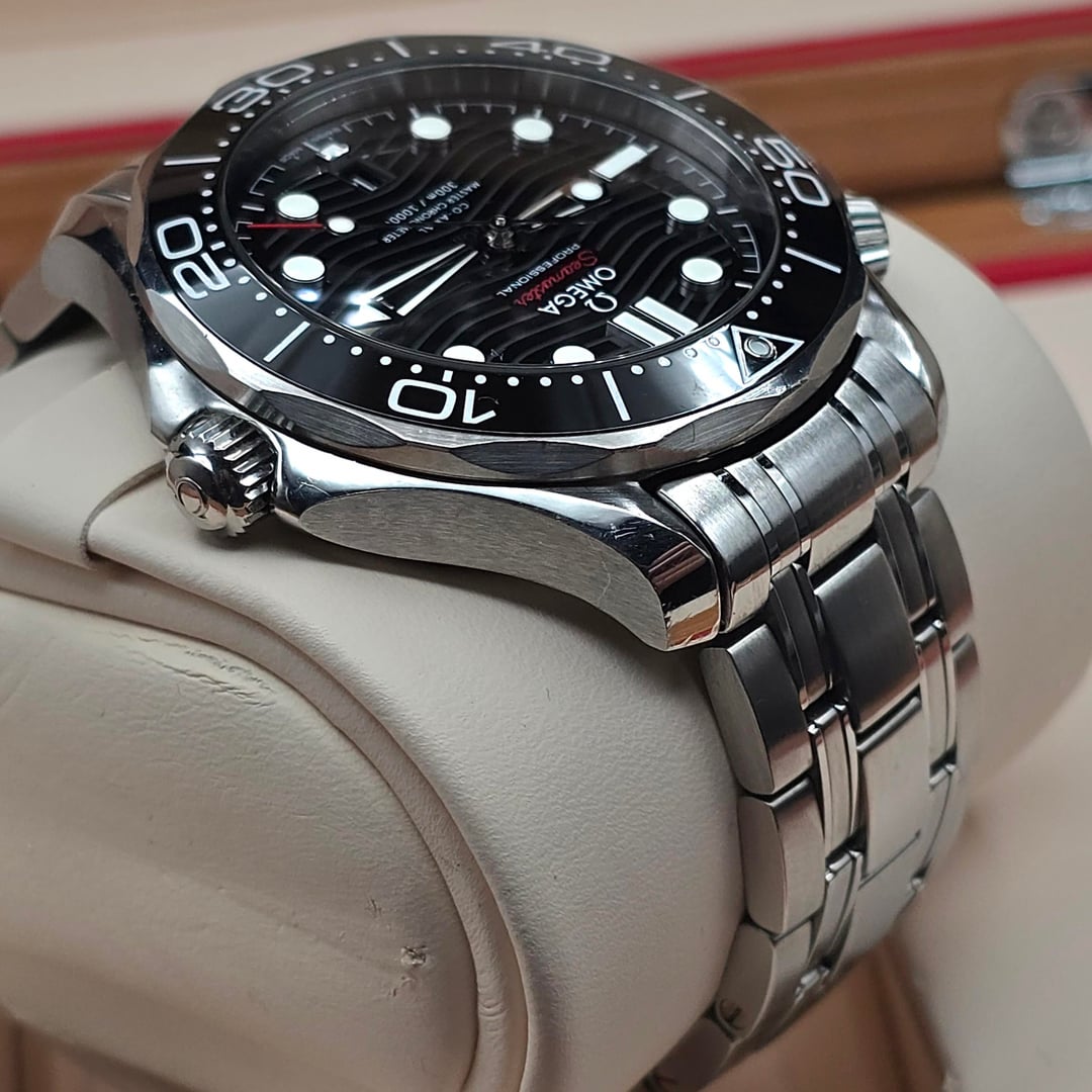 Up for sale here is a great example of the sub-killer! The Omega SMP 300 is water-resistant to 300m, has an exhibition caseback to show off the beautiful movement, a sliding adjustable clasp with diver’s extension, and of course- the wave engraved ceramic dial! Ref. 210.30.42.20.01.001. Comes as a full set with all three cards, dated in 2019. Some light signs of wear throughout, as it has been used, but never abused.  Asking price is $4,250 **All watches sold by us come with a 1 year warranty on movement, case, and bracelet functionality.** We have been trading luxury timepieces since 2017 and operate out of the southeast United States. Accepted forms of payment are wire transfer, trades for other watches, or crypto +2%. Turn your digital coins and memes to IRL assets! After payment has been received, we ship out promptly using Fedex Priority Overnight, fully covered by a private insurance company. Packages are sent to a Fedex Office or Ship Center to be held for pickup. Armored carrier or personal delivery will be arranged for pieces valued over $150k. More pictures or video available on request! Plenty of references available, so deal with confidence! We pride ourselves on customer service, communication, and will do what you need to make this a comfortable transaction. Most brands and models of luxury timepiece are accepted on trade. Rolex, Audemars Piguet, Patek Phillipe, Richard Mille, Hublot, Panerai, Zenith, Breitling, Vacheron Constantin, F/P. Journe, A. Lange & Sohne, etc. I can do cash either way or multi-watch trades for the right deal! Check out our other listings on mechanical-art . com