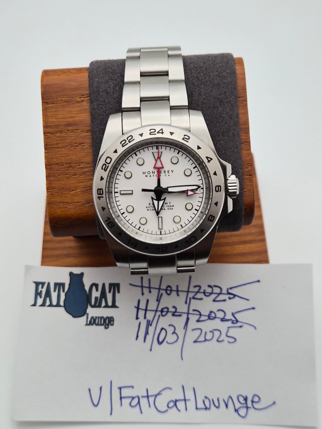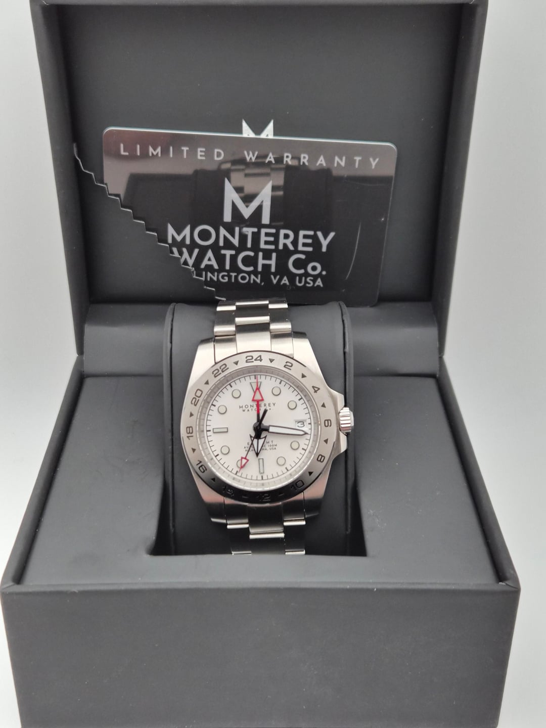 For Sale – Monterey Watch Company EBC GMT Artic White This watch is currently sold out on Monterey Watch Company's website. Condition: Pre-owned, in excellent condition. Bracelet shows signs of minimal wear. Watch details: 40mm Sapphire crystal 100m water resistant Automatic GMT movement Luminous hands and indices Solid case back Screw-down crown Stainless steel bracelet Includes: Full kit Price: $175 Shipping: Free shipping within the CONUS. Payment: PayPal F&F, Venmo F&F, or Zelle accepted. Location: Fernandina Beach, Florida Thank you for viewing my listing!