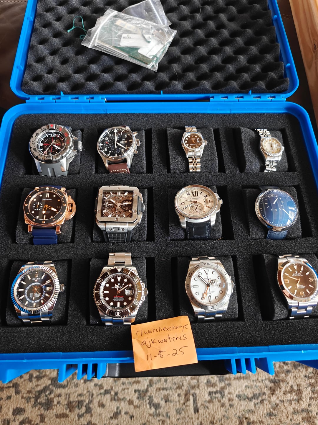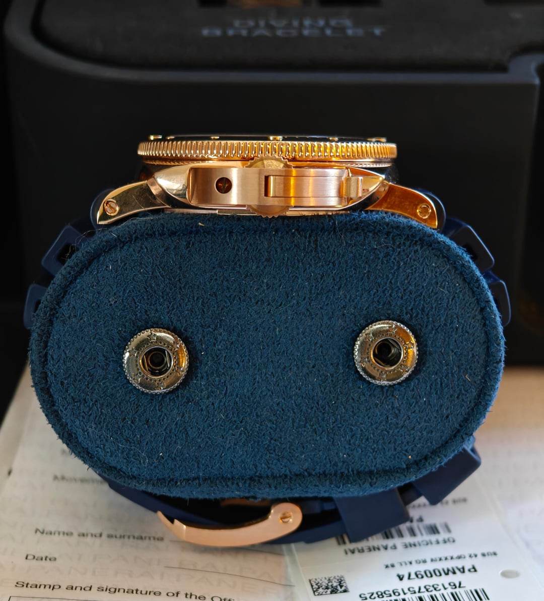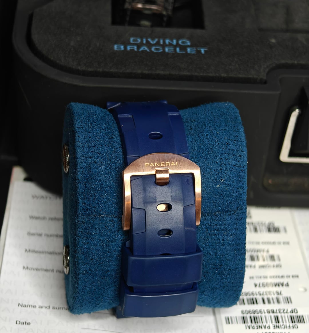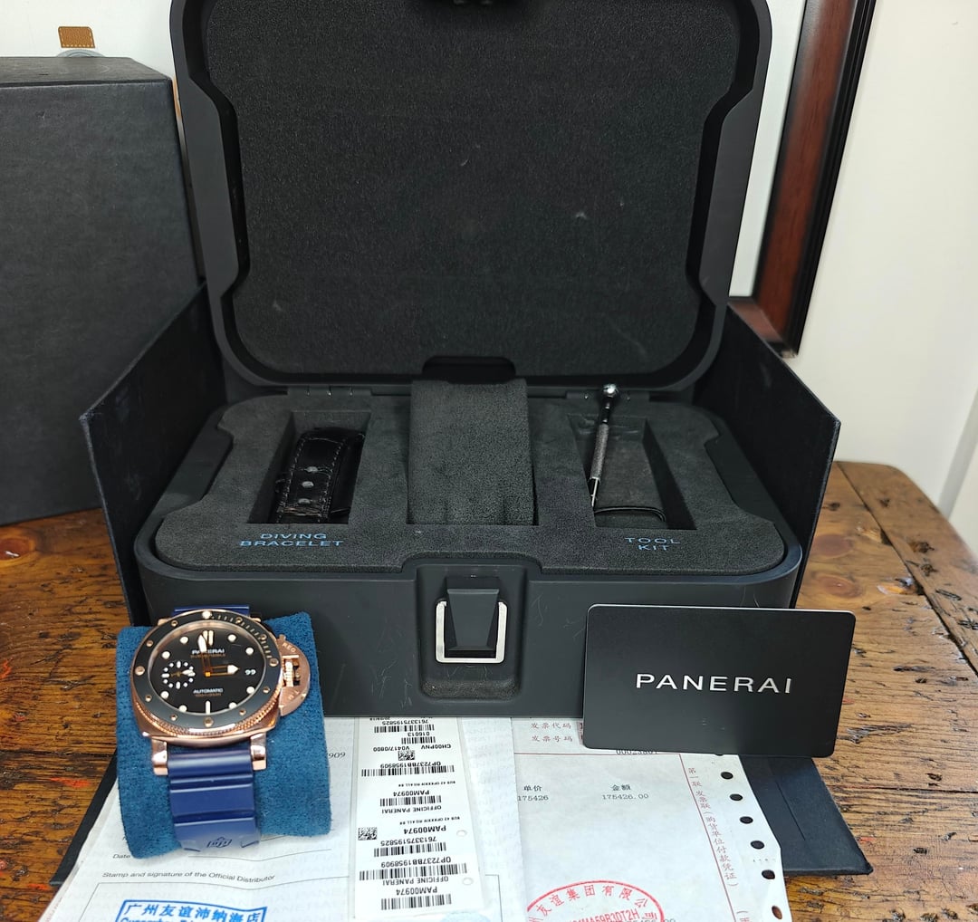 **\[WTS\] Panerai Luminor Submersible PAM00974 – 2020 – Box & Papers Up for grabs: Panerai Luminor Submersible Ref. PAM00974 — 42mm **rose gold** case, automatic movement, and classic diver styling with a luxurious twist. This 2020 example comes complete with box and papers. Currently mounted on a blue rubber strap for a sportier vibe, but also includes the original black leather strap for dressier occasions. Just professionally polished — case and bezel are crisp. Slight signs of wear remain, but overall condition is excellent. **Details:** * Reference PAM00974 * 42mm rose gold case * Automatic movement * Box & papers * Black leather strap (included) * Blue rubber strap (mounted) * Just polished — great condition 💸 16500 shipped CONUS ✅ Wire or Zelle only ✅ Plenty of references available DM with questions or for pics. Trades considered.