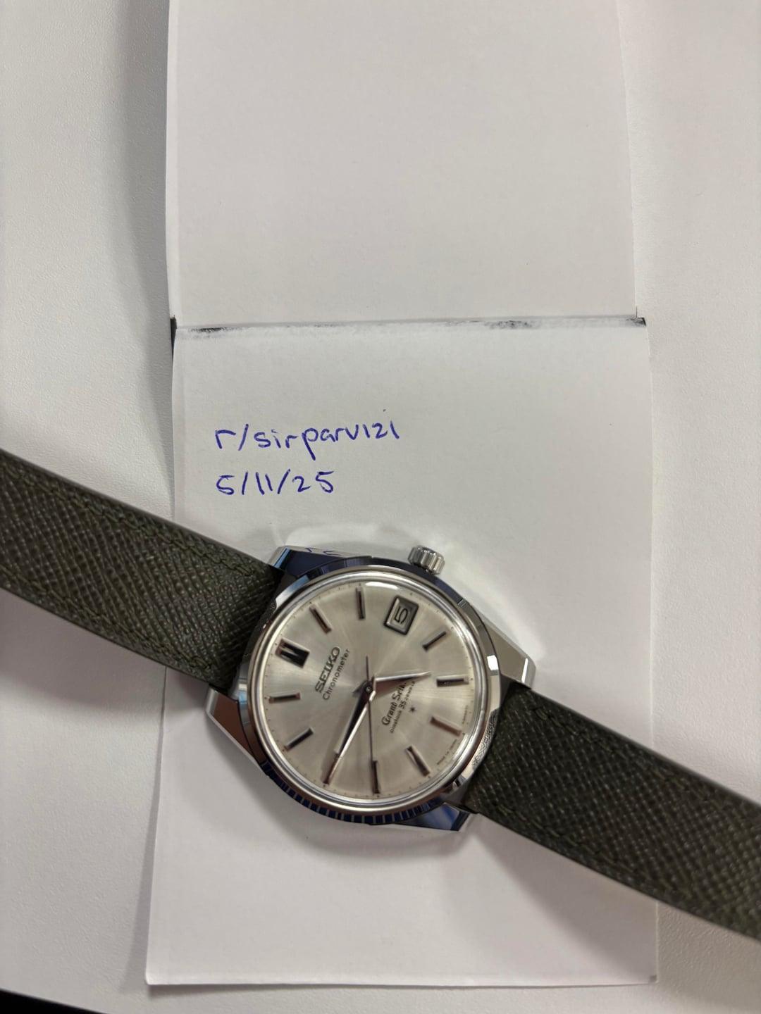 The Grand Seiko 43999 is far more than a vintage timepiece, it is a milestone in Grand Seiko’s story. Released in 1963 as the brand’s first model with a date complication, this 1964 example of the so-called “Self-Dater” represents both a technical breakthrough and a design revolution. This reference was one of the first to embody Taro Tanaka’s visionary “Grammar of Design”, the philosophy that still defines Grand Seiko today. Its broad, multi-faceted lugs, distortion-free mirror finishing, and strong case geometry gave it a modern, architectural presence that set it apart from its contemporaries. Even at 36mm, the 43999 wears larger and more substantial than most watches of its era, a key reason why it remains so highly regarded by collectors. This all original example has just undergone a complete service: • Case: expertly refinished by The Lapinist, restoring sharp lines and brilliant polish true to the original design. • Movement: manual-wind Caliber 430, freshly serviced and running with precision. • Dial: original, and remarkably well preserved. • Caseback: features the iconic lion medallion, with light corrosion but strong detail intact. The 43999 holds a special place in horological history: the first Grand Seiko with a date complication, an early showcase of the design language that defines the brand, and a watch that proved Japan could rival the best Swiss houses of its day. This 1964 Self-Dater is not only a rare collector’s piece but also a beautifully wearable expression of Grand Seiko’s enduring legacy. Asking : $2150 excluding shipping and fees Photoalbum: https://imgur.com/a/0Q7HXhV