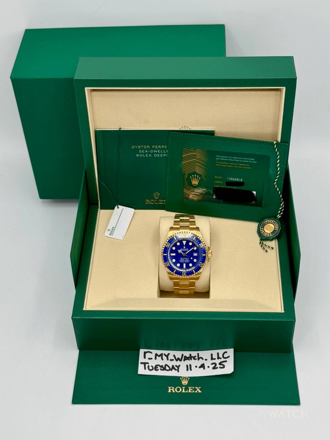 🔵**NEW 2025 Rolex Deepsea 44mm 136668LB 18K Yellow Gold Blue Dial and Oyster Bracelet** 🔵**TRADE or SELL us your luxury watch, all brands considered. Message me details.** **Includes the following:** **✔️BRAND NEW 2025 UPDATED ROLEX BOX (Double Boxed)** **✔️Box and Papers - Yes** **✔️Warranty card dated 2025** **✔️Manual and Warranty booklets** **✔️Green and White Hang Tags included** **✔️Size: 8.25inch wrist (Full Links)** **✔️Watch is BRAND NEW/UNWORN.** **✔️**[**Trades**](https://mywatchllc.com/pages/sell-rolex-watch) **welcome** Business Name: **My Watch LLC** LOCATION: Oak Park, Michigan ✔️[MyWatchLLC.com](http://mywatchllc.com/) for current inventory ✔️Google Business Listing [https://g.co/kgs/Cmd6FPW](https://g.co/kgs/Cmd6FPW) ✔️Business Hours M-F 9-6 ✔️Facetime/Video chat/calls welcome to view the watch interested. ✔️Contact: 248-422-0909 via text or call for quickest response. 🟢TERMS: Visit [MyWatchLLC.Com](http://mywatchllc.com/) for payments accepted 🟢REFERENCES/REVIEWS: We are well reviewed on all platforms from google, trust pilot, rolexforums, additionally we have 300+ reference in multiple FaceBook watch groups, reference checks welcome. 🟢SHIPPING: If you are not local, we offer Fully Insured FedEx overnight shipping in the USA for a fee. International shipping available.