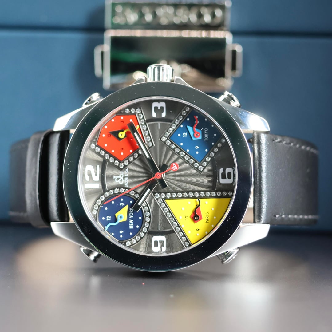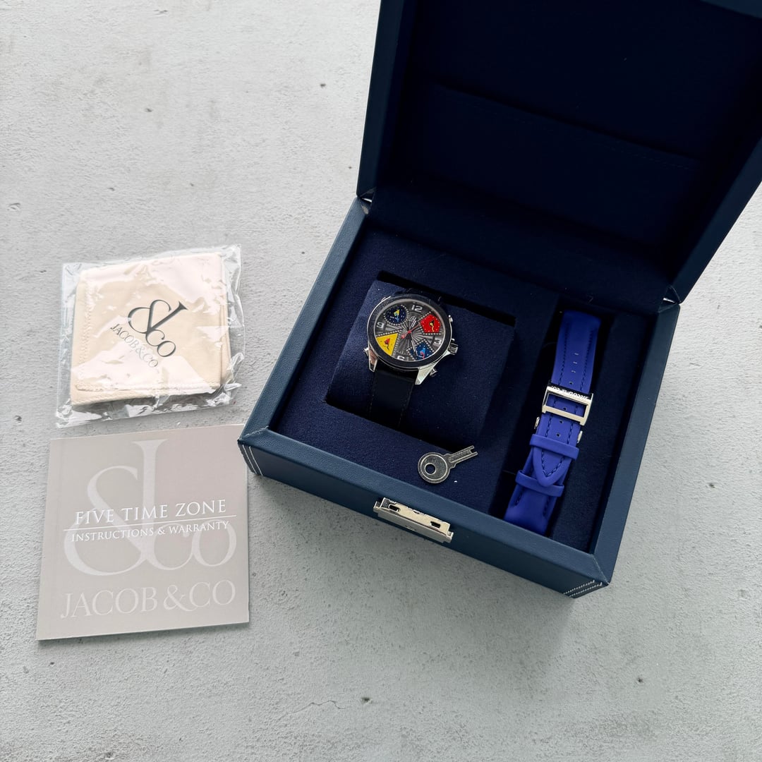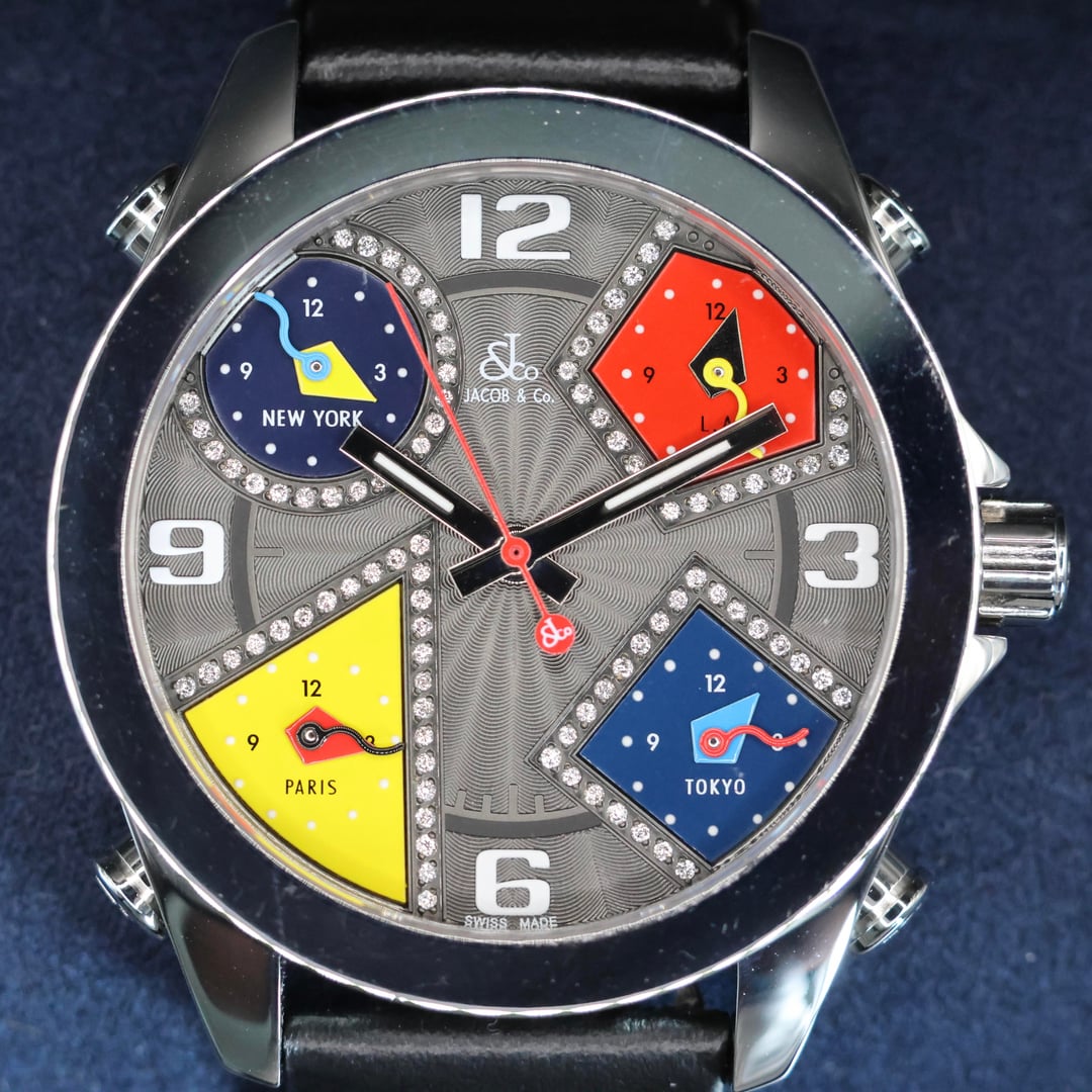 Presenting the iconic Jacob & Co. Five Timezones wristwatch, a bold statement piece that perfectly captures the brand’s innovative spirit and cosmopolitan style. This exquisite model features a diamond-set dial, adding a luxurious brilliance that complements its distinctive multi-time-zone display. Designed to track the local time in New York, Los Angeles, Paris, Tokyo, and your home city, this watch was a true innovation when first introduced, embodying the global lifestyle of the modern traveler at the turn of the millennium. The sleek stainless steel case is paired with a premium leather strap, offering both comfort and elegance. This particular piece comes complete with its original box and papers, ensuring authenticity and collectibility. More than just a timepiece, the Jacob & Co. Five Timezones represents a milestone in horological design, a fusion of fashion, function, and international flair that set a new standard for contemporary luxury watches. **THE DETAILS** * **Case:** 47 mm stainless steel case which remains unpolished and honest signs of previous wear. Any scuffs would be as expected after a few days of wear on your own! * **Dial/Hands:** Original dial which is perfect in every way. Hands are as attractive as they left the factory. * **Caseback:** Showing honest signs of previous wear * **Bracelet/Strap:** Leather with a factory Jacob & co stainless steel buckle. * **Movement:** Quartz movement running well * **Crystal:** Original sapphire crystal in attractive condition with no marks to mention * **Accessories:** This watch comes with original box, outer box, warranty card and booklets as seen in the photos Available for US$2580