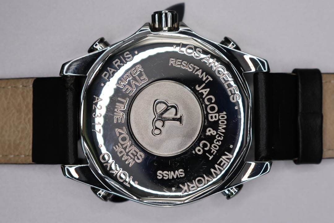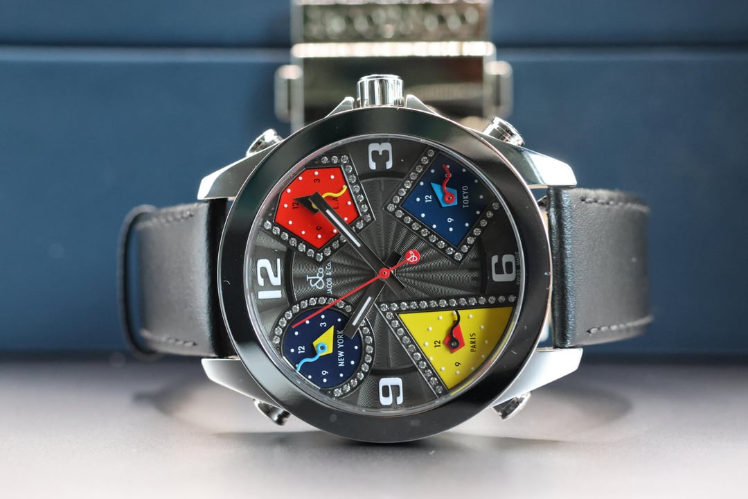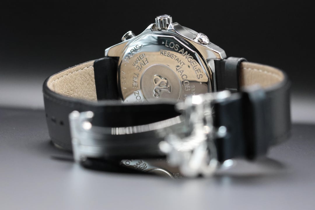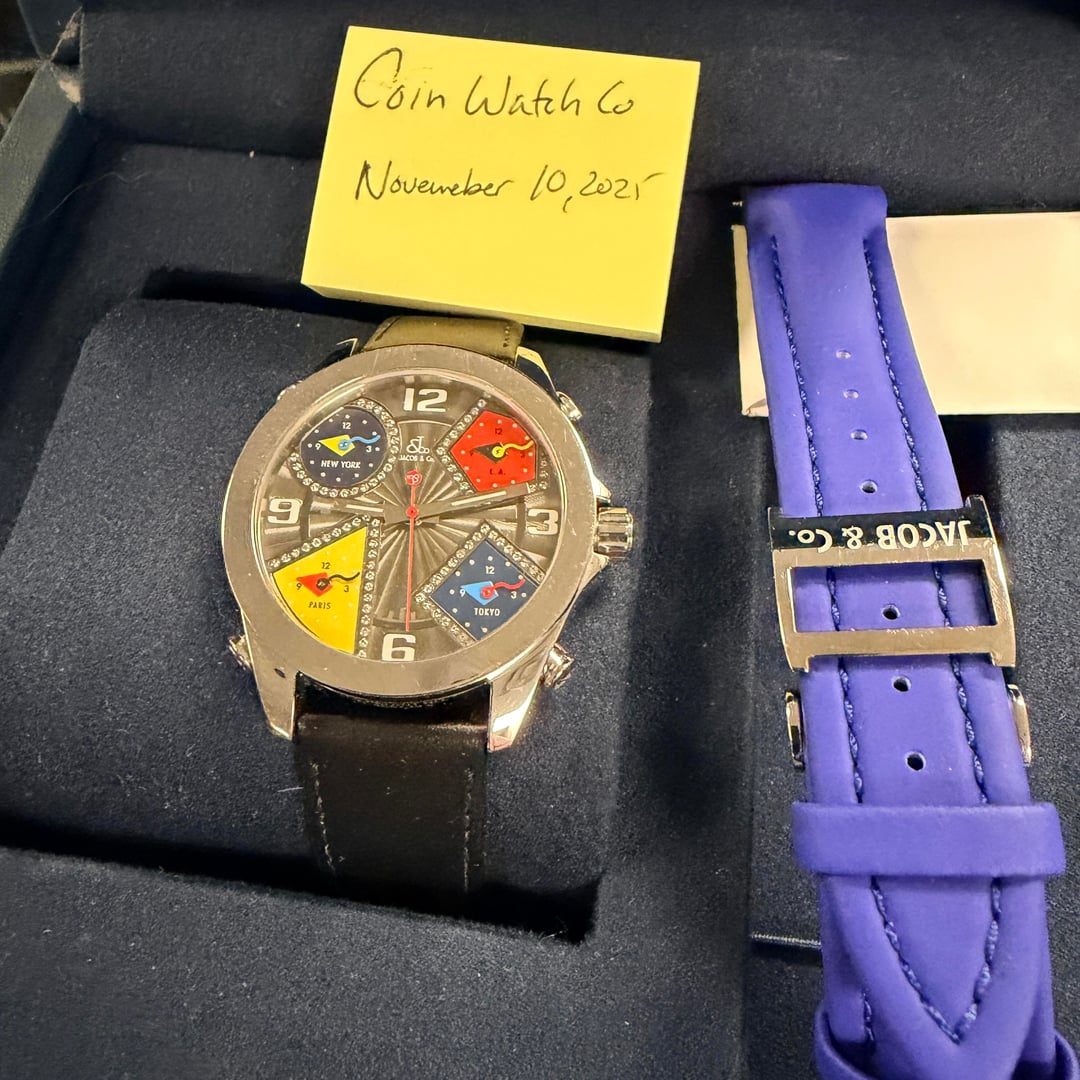 Presenting the iconic Jacob & Co. Five Timezones wristwatch, a bold statement piece that perfectly captures the brand’s innovative spirit and cosmopolitan style. This exquisite model features a diamond-set dial, adding a luxurious brilliance that complements its distinctive multi-time-zone display. Designed to track the local time in New York, Los Angeles, Paris, Tokyo, and your home city, this watch was a true innovation when first introduced, embodying the global lifestyle of the modern traveler at the turn of the millennium. The sleek stainless steel case is paired with a premium leather strap, offering both comfort and elegance. This particular piece comes complete with its original box and papers, ensuring authenticity and collectibility. More than just a timepiece, the Jacob & Co. Five Timezones represents a milestone in horological design, a fusion of fashion, function, and international flair that set a new standard for contemporary luxury watches. **THE DETAILS** * **Case:** 47 mm stainless steel case which remains unpolished and honest signs of previous wear. Any scuffs would be as expected after a few days of wear on your own! * **Dial/Hands:** Original dial which is perfect in every way. Hands are as attractive as they left the factory. * **Caseback:** Showing honest signs of previous wear * **Bracelet/Strap:** Leather with a factory Jacob & co stainless steel buckle. * **Movement:** Quartz movement running well * **Crystal:** Original sapphire crystal in attractive condition with no marks to mention * **Accessories:** This watch comes with original box, outer box, warranty card and booklets as seen in the photos Available for US$2580