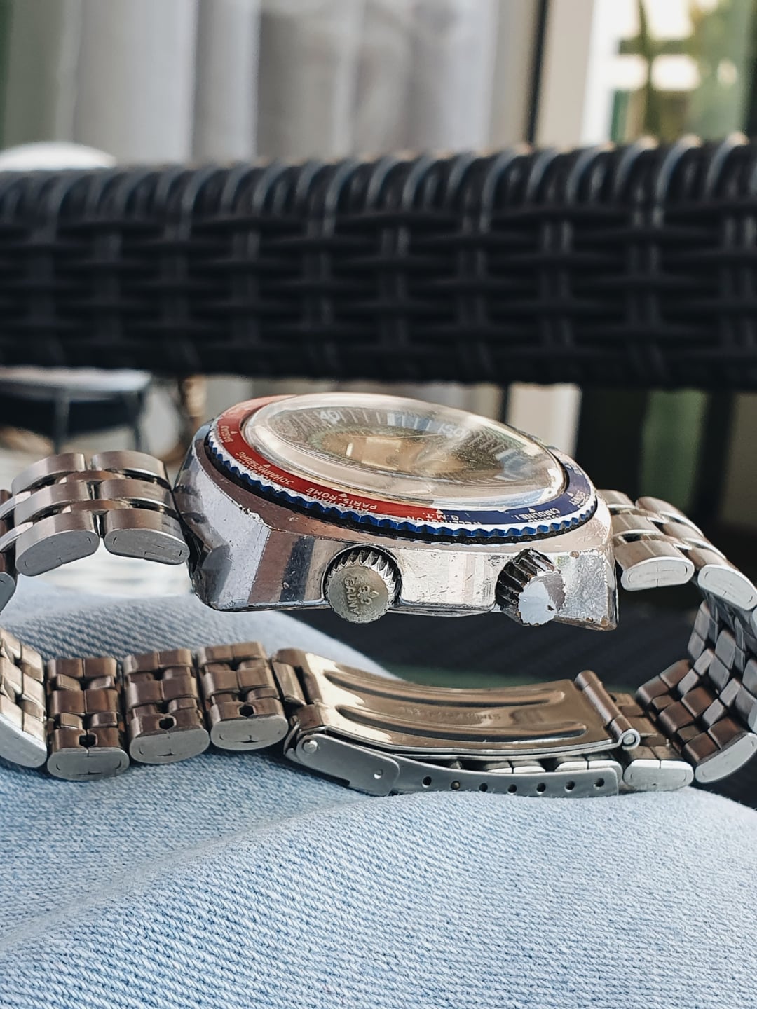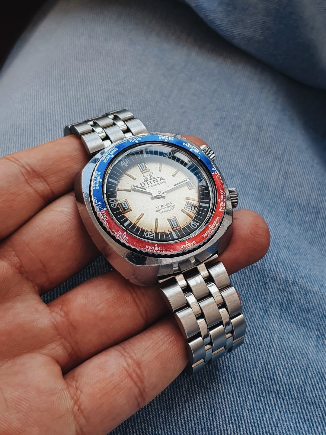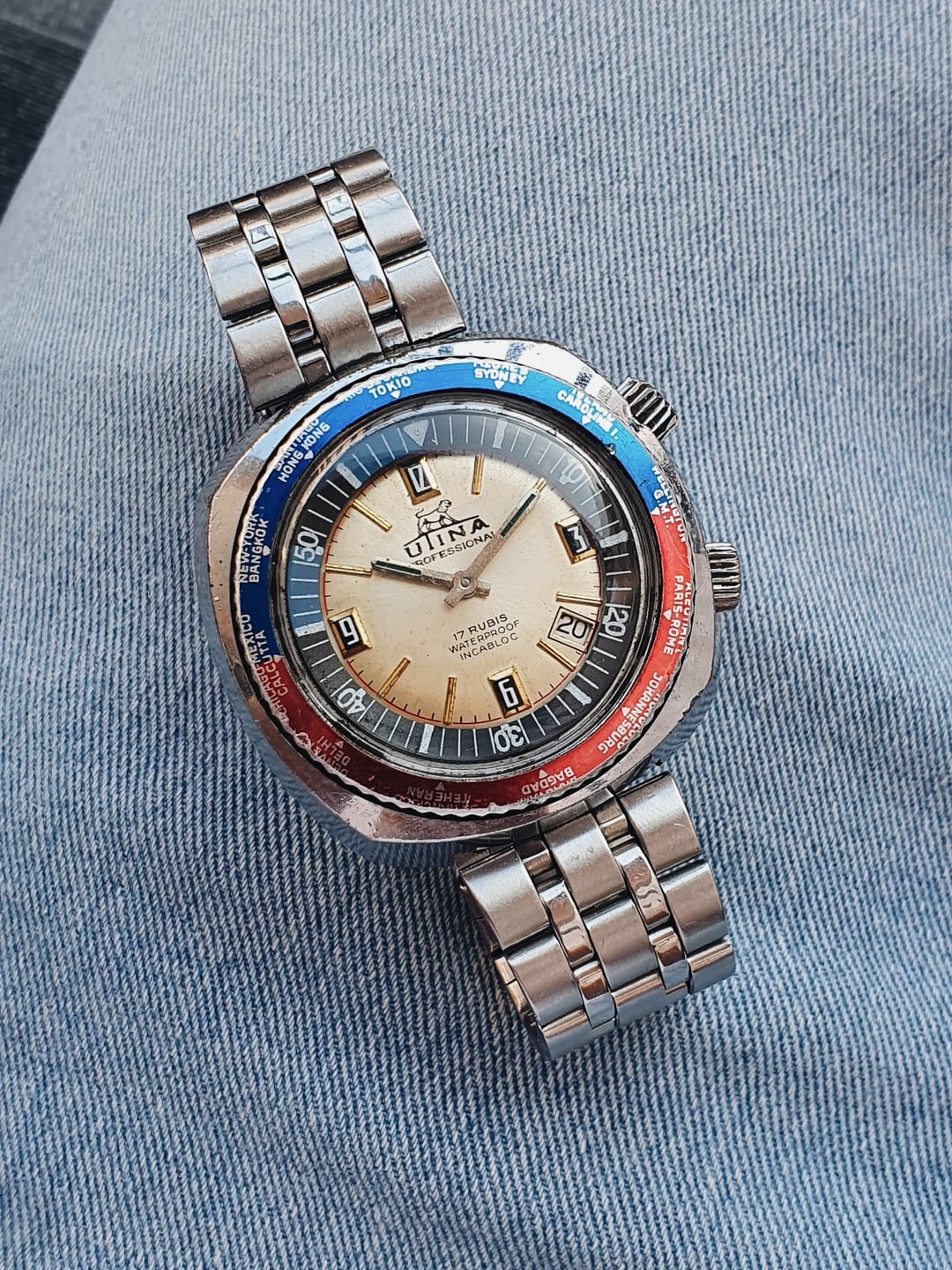 Pure 70s funkiness in this Utina Professional. The watch includes a fixed world timer bezel, and internal diving bezel, date, and a gold dial with Arabic numerals. Plus, it has a case size of 43 mm – perfect for those who enjoy vintage, chunky pieces. **Condition:** I’d say it’s a 5/10. The case has usage marks and it’s losing some of its plating around the edges. The dial has some aging. See detailed photos for full condition and clarity. **Case Size:** 43.3 x 41.7 chrome-plated case with a thickness of 14mm and a lug width of 20mm. **Crystal:** Acrylic **Movement:** It seems to have a FE 233-69 movement, with 17 jewels. I don’t know its service history, but everything is working as it should. **Price:** Asking $110. Please add $20 for worldwide shipping. Payment methods include Wise, ACH transfer, Revolut, Bitcoin (On-Chain or Lightning), or PayPal G&S for buyers with solid references. Add +7.5% for currency conversion fees on the latter. Portugal has suspended all shipments to the US, but I can still ship to other countries. Established seller with over 220 transactions – buy with confidence! Make sure to follow me on Instagram (@daily.worn) to check out the newest additions. Happy to answer serious inquiries. No trades, no lowballs. [Pictures](https://imgur.com/a/LHpPIxz) [Timestamp](https://imgur.com/a/Vmulp8C)