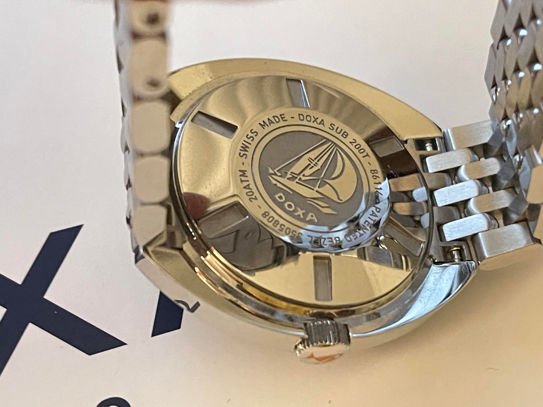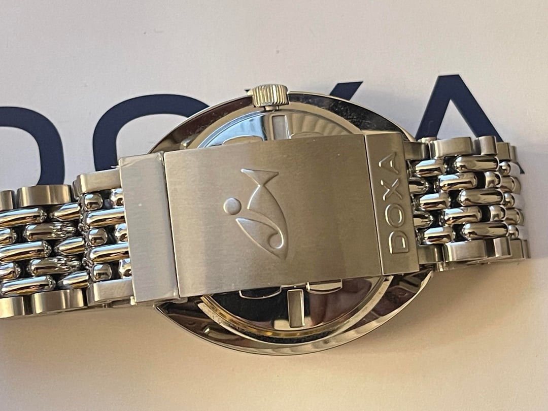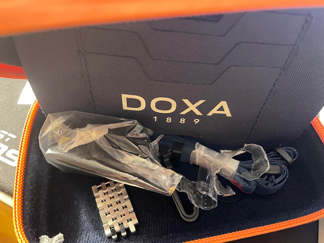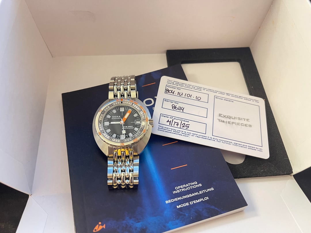 Hello [u/Watchexchange](https://www.reddit.com/user/Watchexchange/) Condition: EXCELLENT. All accessories in the picture included with the watch= FULL SET. * Material Stainless steel with unidirectional rotating bezel * Caseback Solid * Case Diameter ⌀ 39mm * Lug to Lug 41.5mm * Thickness 10.70mm * Glass Sapphire Crystal * Crown Screw-down * Water Resistance 200m * Shape Cushion * Functions Hours, Minutes, Seconds, Date * Movement Type Automatic * Movement Description Mechanical Automatic, Swiss Made, Power reserve 38 hours, Frequency 28,800 vph (4.0 Hz), Decorated by DOXA * STRAP * Type Steel bracelet * Material Stainless Steel, Beads of Rice * Buckle Type Folding Clasp With Ratcheting Wetsuit Extension Price: $1100 USD + shipping CONUS ONLY Payment: Zelle or Venmo Feel free to reach out with any questions!
