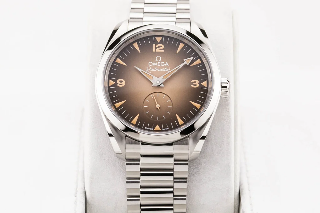 Up for sale is a brand new Omega Seamaster Railmaster 38mm Brown Dial with Small Seconds, reference # 235.10.38.20.13.001. It comes complete with all boxes, papers, booklets, hang tag and Omega Warranty Card dated June 2025.