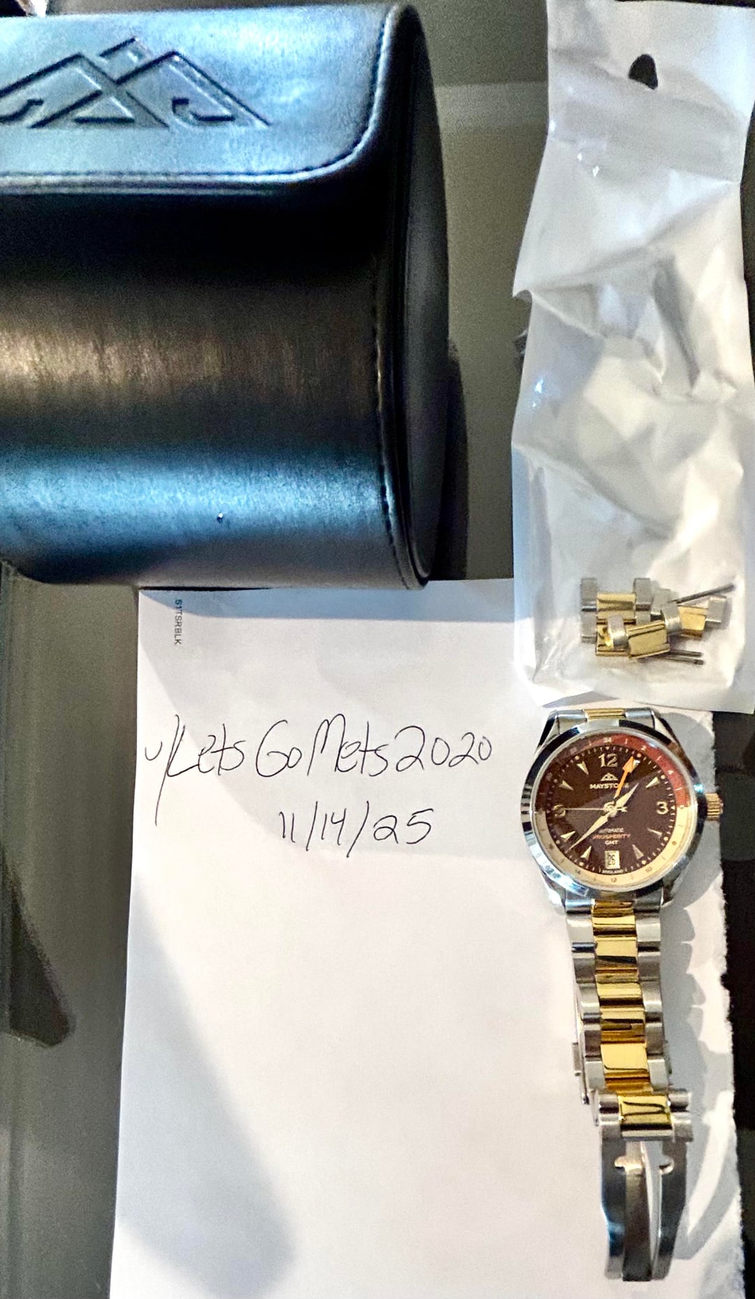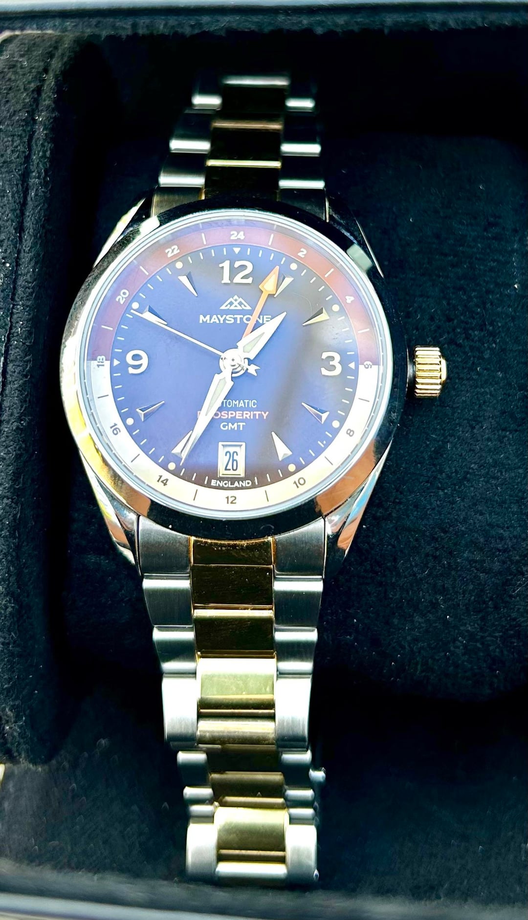 Selling the Maystone Prosperity Golden Eagle GMT purchased in June 2025. Comes with leather watch roll and extra links (I have it sized to a 7.5 wrist). Specs: - 38 mm case - 46mm lug to lug - 20mm lugs - 11.5 mm thick - Sapphire crystal - NH34 GMT movement - 100m WR Currently on preorder for $599, but I’m selling for $400 shipped to CONUS. Willing to provide extra photos/videos before purchase. Please reach out with any questions.