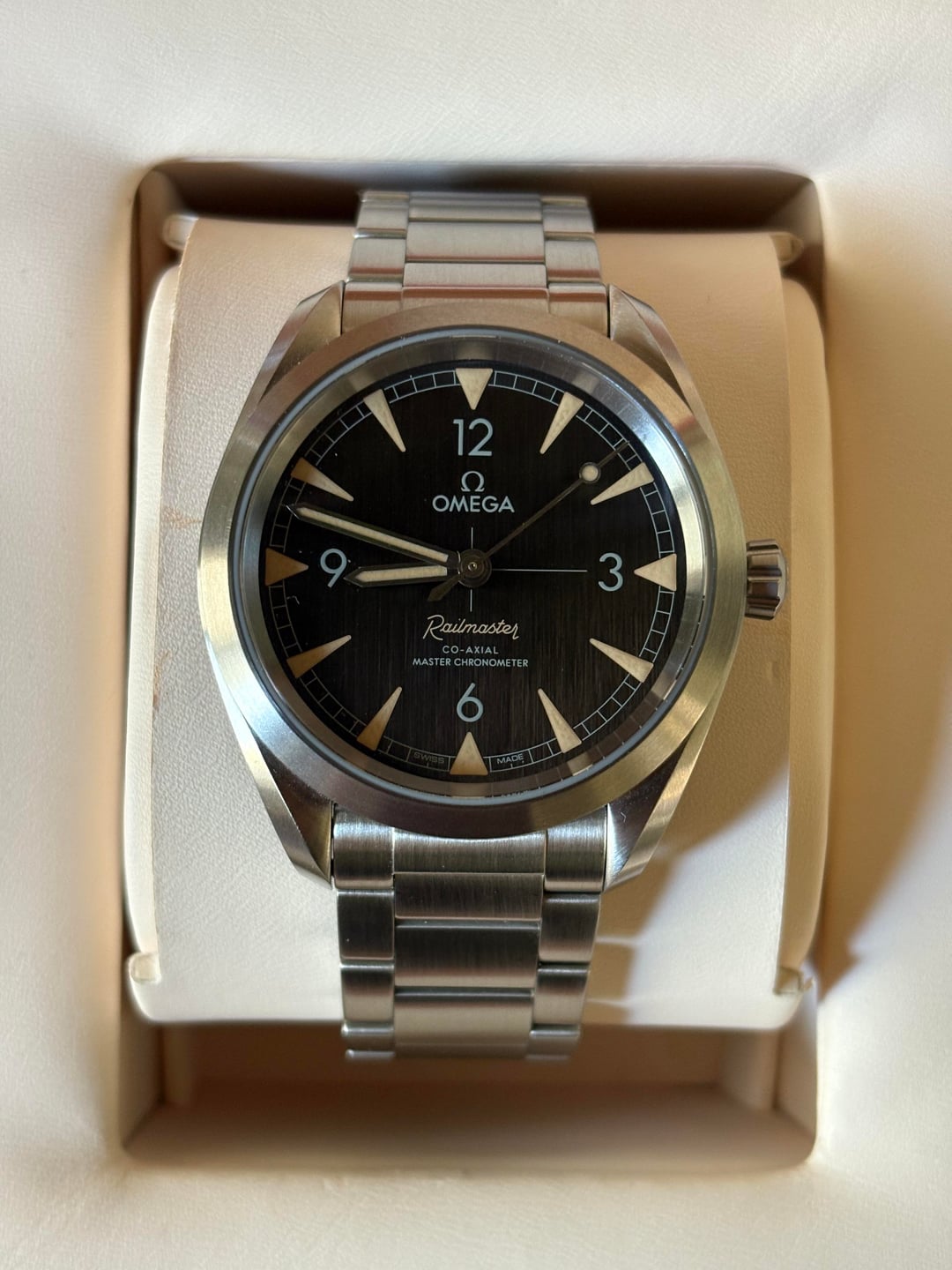 Omega Seamaster Railmaster Ref Number 220.10.40.20.01.001 Recently discontinued Includes full kit, undated warranty card, original box. Small mark near 1 o'clock on case Price: $3000, NO TRADES PLEASE Venmo, Zelle, or PayPal F&F Shipping: $30 FedEx 2 Day, CONUS only Please comment here first before PMing! Thanks for looking!