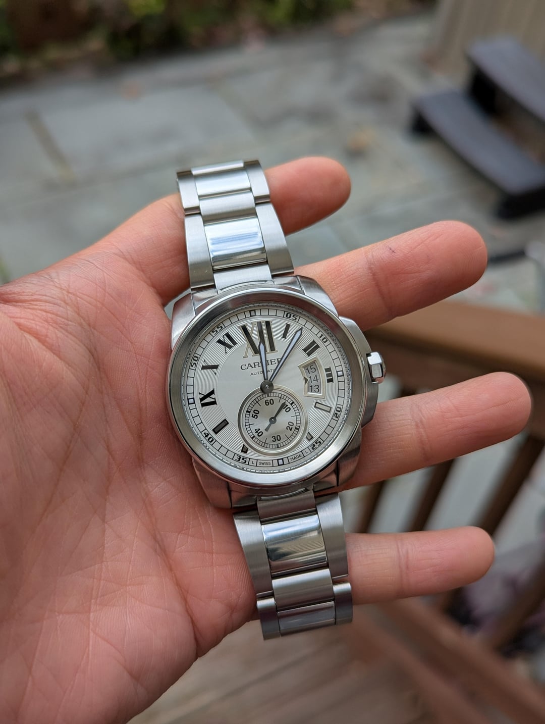 Hey folks, up for trade or sale is my 2010 Cartier Calibre de Cartier W7100013, Cartier full service in 2024. I'm mainly looking to trade for something similarly sporty / dressy in this tier (Medium Santos, GS Elegance GMTs come to mind, but I'm open to trades up / down / sideways). Trade value 4,100. Specs: 42 mm diameter, 48.3 mm lug to lug, 9.8 mm thick, 23mm lug width Notes: * [Album with video and timestamp](https://imgur.com/a/qFoIFMe) * This is the reference W7100013 which originally came on strap; the previous owner bought a Cartier factory bracelet for it, making it identical to the W7100015 (but you also get the strap) * As pictured, watch comes with papers, lightly worn leather band, Cartier clasp, and full links; I can also include a generic watch box at no cost if desired * I can share photos of the service papers for serious inquiries * You'd be surprised at how well this wears for a 42 (and I say that as a picky dude with a 6.5 inch wrist) - super curved lugs, under 10 mm thick, an ergonomically curved bracelet all help it to wrap around the wrist and sit planted Happy to get on a video call or meet up in the DC area to show the watch. Will ship CONUS, payments if any via Paypal, Venmo, or Zelle - thanks for taking a look!