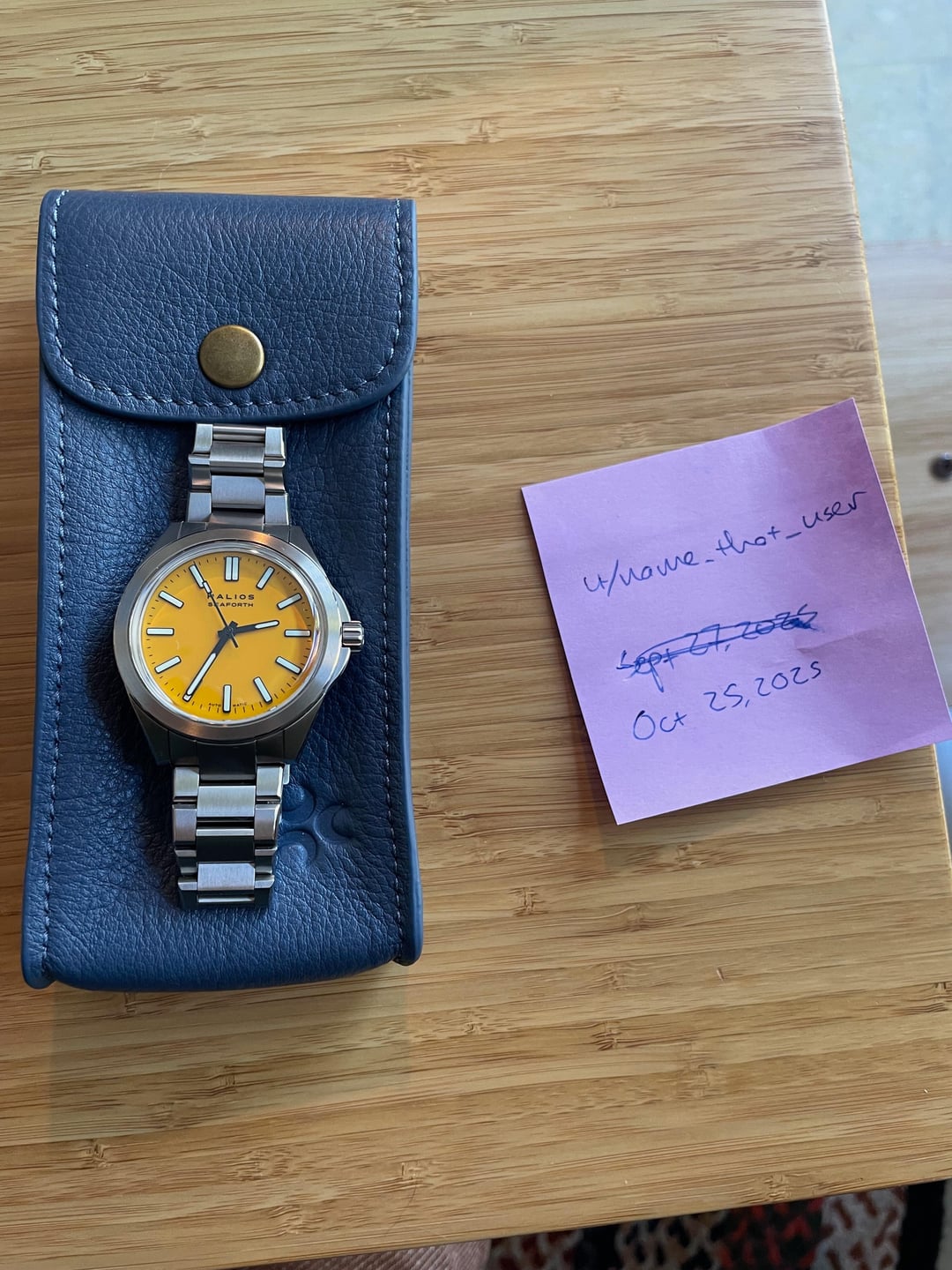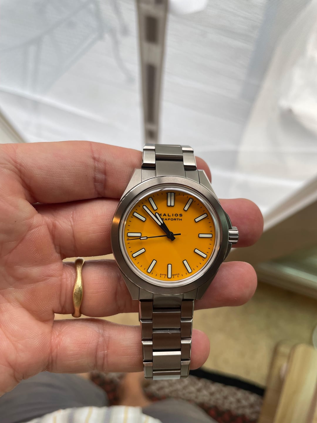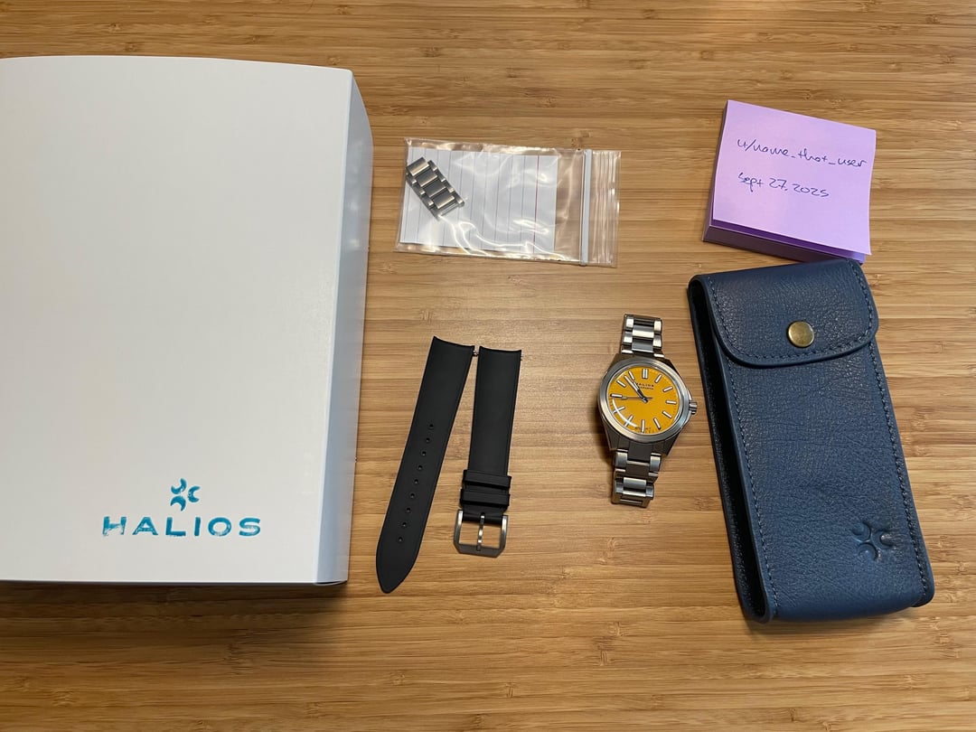 **\[WTS\] Halios Seaforth IV Titanium Bahama Yellow w/ Bracelet** · **Price:** $725 (shipped to CONUS). * **Condition:** Nearly new, worn once. Some light scratches on the clasp from the desk, and a very small blemish on the bezel at 11 o’clock. * **Details:** 40mm, 12.4mm thick, includes amazing titanium bracelet with quick-adjust clasp and Halios black rubber strap. The color of this yellow is amazing, it’s just a bit too big for me. * **Payment:** PayPal (+3% for G&S), Zelle, or Venmo. * **Shipping:** CONUS, FedEx. Let me know if you have any questions!