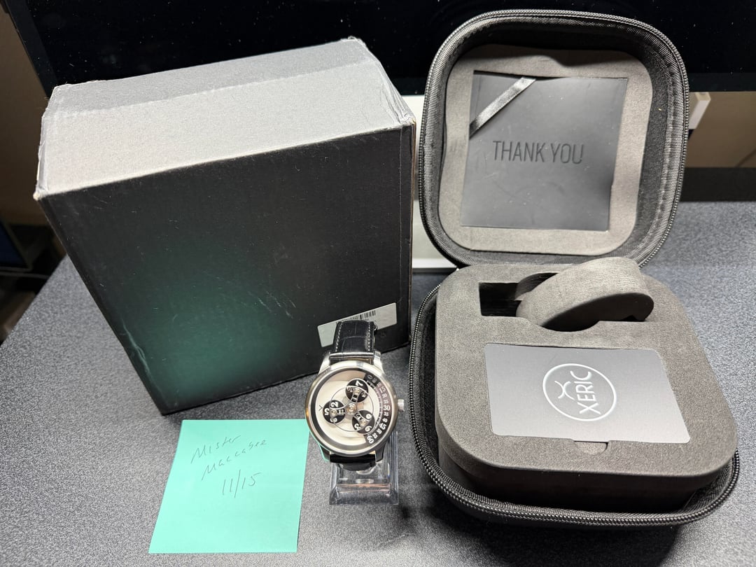 Hey folks Very cool wandering hour from Xeric. Sought after PANDA version. Good condition, not original owner, wore it a couple times mostly inside. See pics for condition. Full kit. Retails for $1200 $775 shipped conus PayPal F&F or Zelle. I have 55 positive transactions on watchexchange with good feedback so please read them. Also have an eBay store with hundreds of sales and hundreds of positive feedback so read them as well (offtherakcollectibles) Sale only, no trades. Ships from NYC so if you're in area can meet up locally. Please leave a comment here so I can view your transaction history and then message me if you're interested. Thank you! \----------------------- **Movement**: Proprietary Xeric Caliber X2.3 Movement built on a Miyota 9039 **Case Material**: Stainless Steel **Case Size**: 42 mm **Case Thickness**: 11.6 mm **Lug to Lug**: 50 mm **Crystal**: * Sapphire **Band Material**: Italian Leather **Band Width**: 20 mm **Water Resistance**: * 5 ATM **Watch Weight (g)**: 90.7 g **Limited Edition**: 500