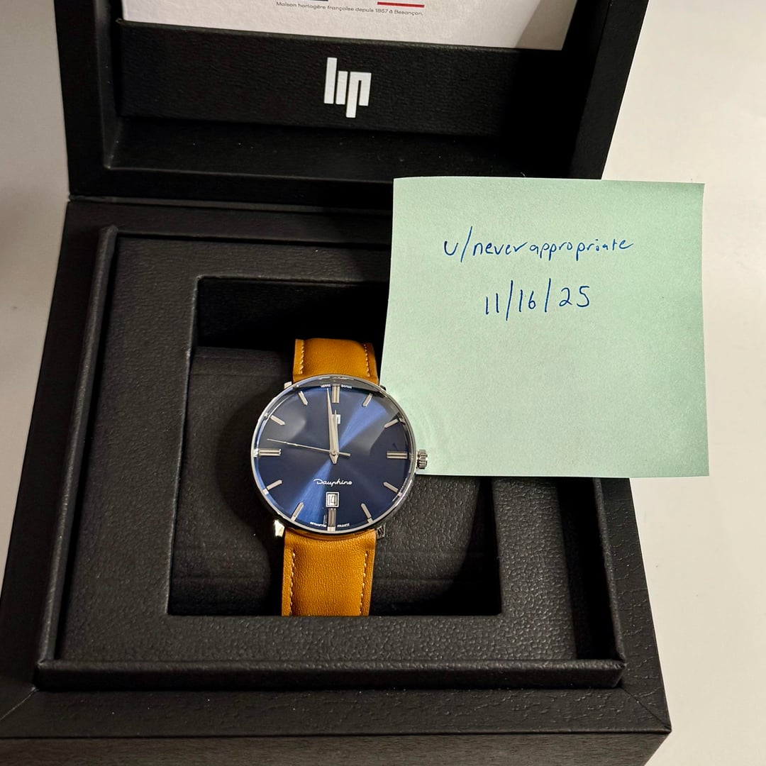 **\[WTS\] LIP Dauphine - $99** **Description:** * Model: Dauphine * Diameter: 38mm * Lug width - 20mm * Movement: Ronda 715 quartz * Crystal: Sapphire * Dial Color: Blue * WR: 50 meters **Condition:** Never worn - Like new condition. **Contents:** Full Kit [https://conteenium.com/product/lip-dauphine-38mm-671429](https://conteenium.com/product/lip-dauphine-38mm-671429) **Payment:** PayPal F&F or Zelle Preferred: $99 PayPal G&S: $104 total to cover fees Price includes Shipping via USPS in CONUS from Tallahassee, FL. **Trades:** No trades at this time as I am looking to reduce my collection.