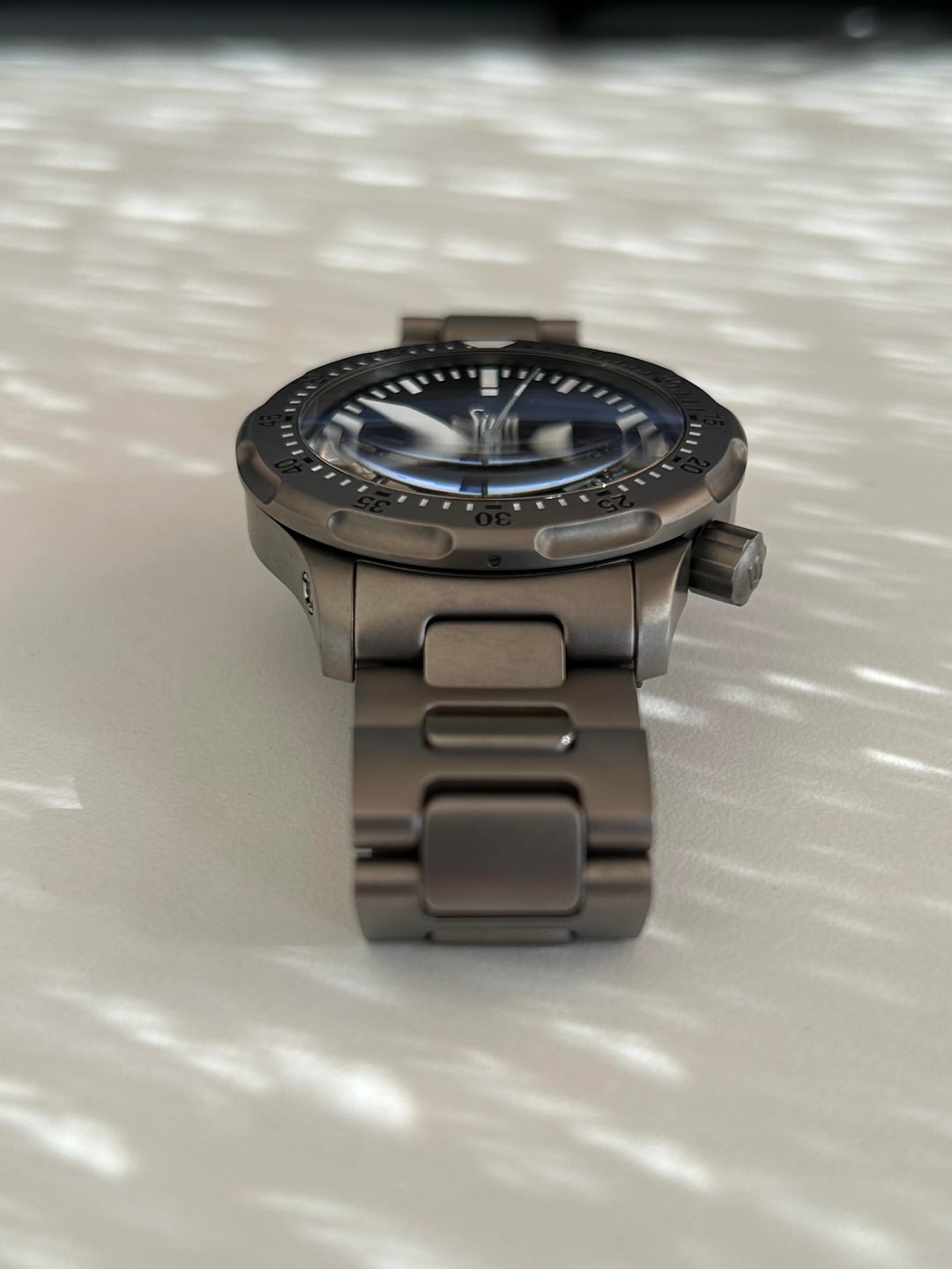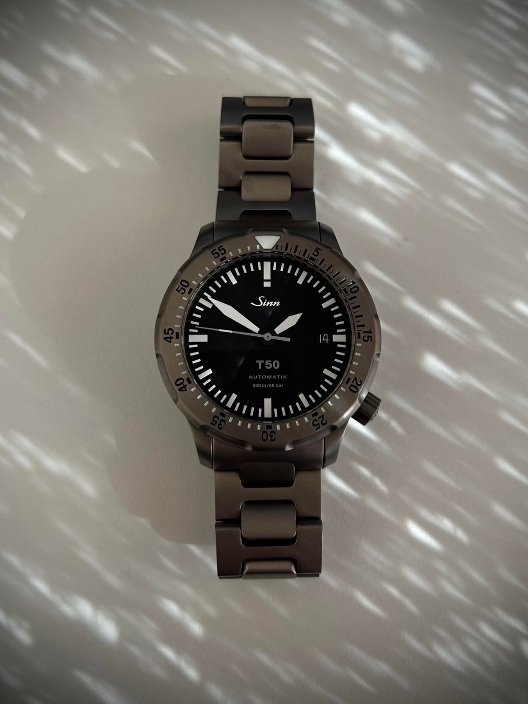For sale is my Sinn T50 with a watchbuys 10/24 sales date. The watch comes with full Ti bracelet (dive extension removed but easy to put back on), rubber strap with Ti buckle (cut for a 6.5 wrist), and all contents. Watch keeps excellent time, about +2 sec/day. Condition: zero marks to case that I can see, a very small scratch to buckle/clasp toward the side, and a small mark on the AR coating at 10 o’clock (see pic in album/close up). Selling to make space so NO trade offers please. Payment by PayPal FF or Zelle only. Ships usps in the USA. $3000 Time stamps: https://imgur.com/a/hBuRAza Album: https://imgur.com/a/gFBoeCS Wrist roll: https://imgur.com/a/XeyRTvZ