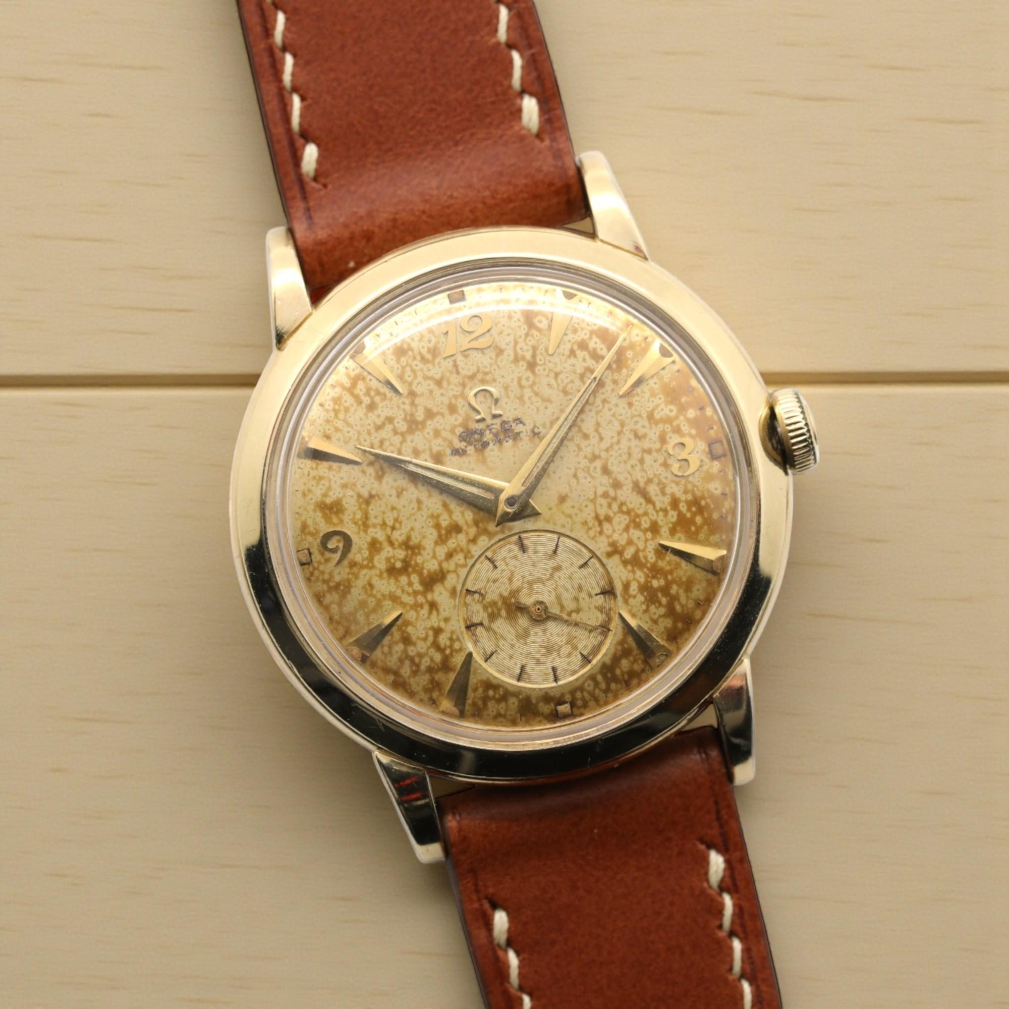 Such a stunning tropical 'lava' dial with Breguet numerals. Brand: Omega Movement: Cal. 342 (bumper) Reference: F6231 Case: 14k gold filled Size: 34mm Lug to Lug: 40mm Box/papers: No Location: Los Angeles Price: ONLY $999! Web/IG: [keepiece.co](http://keepiece.co/) Pictures/Timestamp: [https://imgur.com/a/V4XQUPy](https://imgur.com/a/V4XQUPy) CONDITION & SERVICING \-The dial has changed to a stunning tropical 'lava' color. \-Hands are in very good condition, both being even in color. \-The case is in very good condition, overall a nice package. \-Service history is unknown.