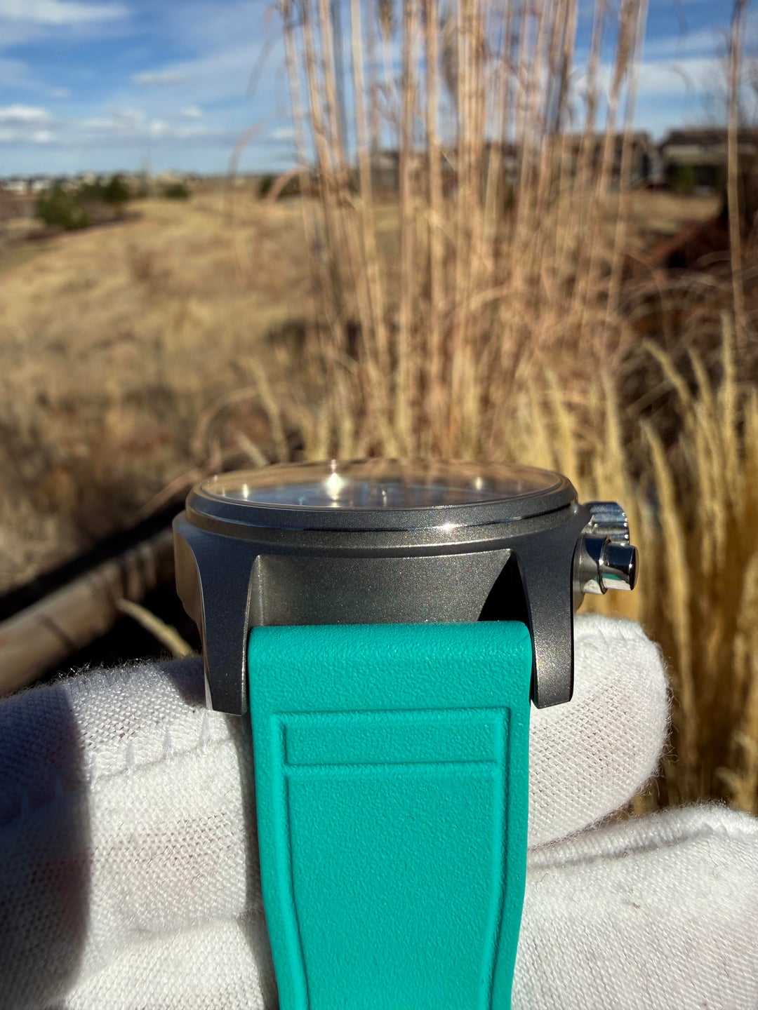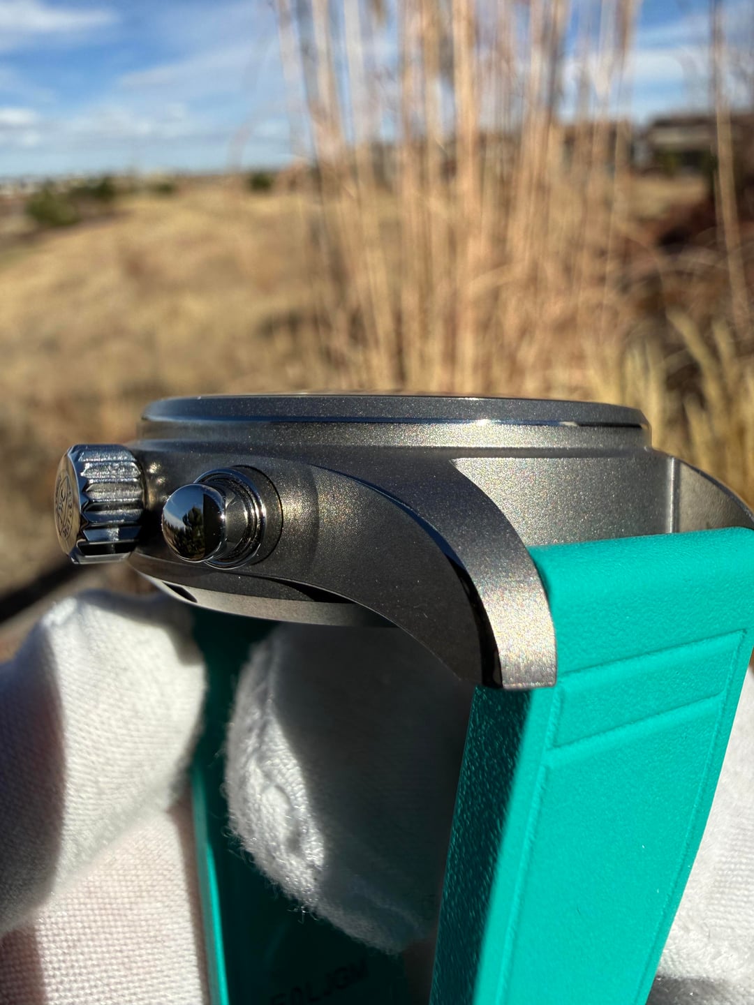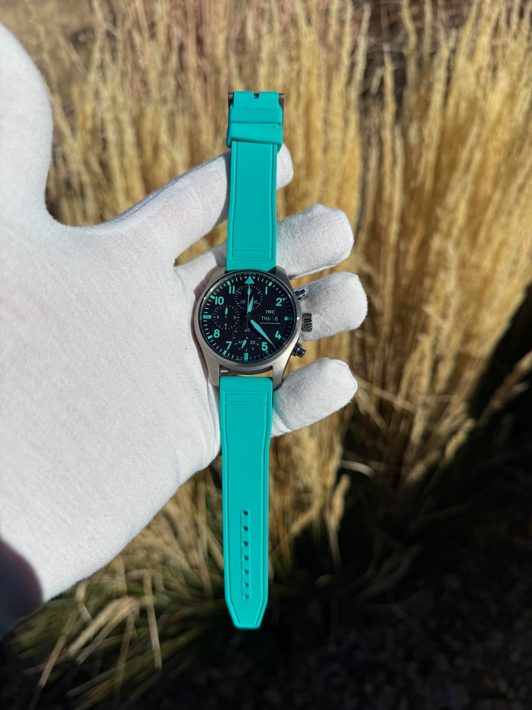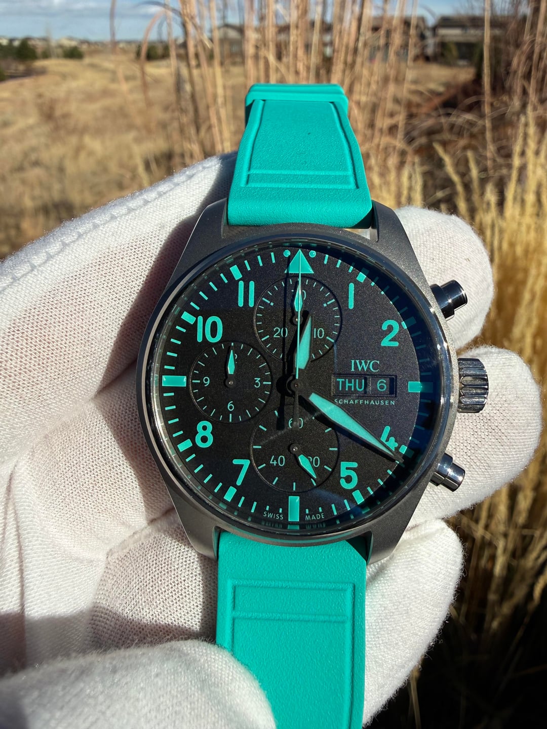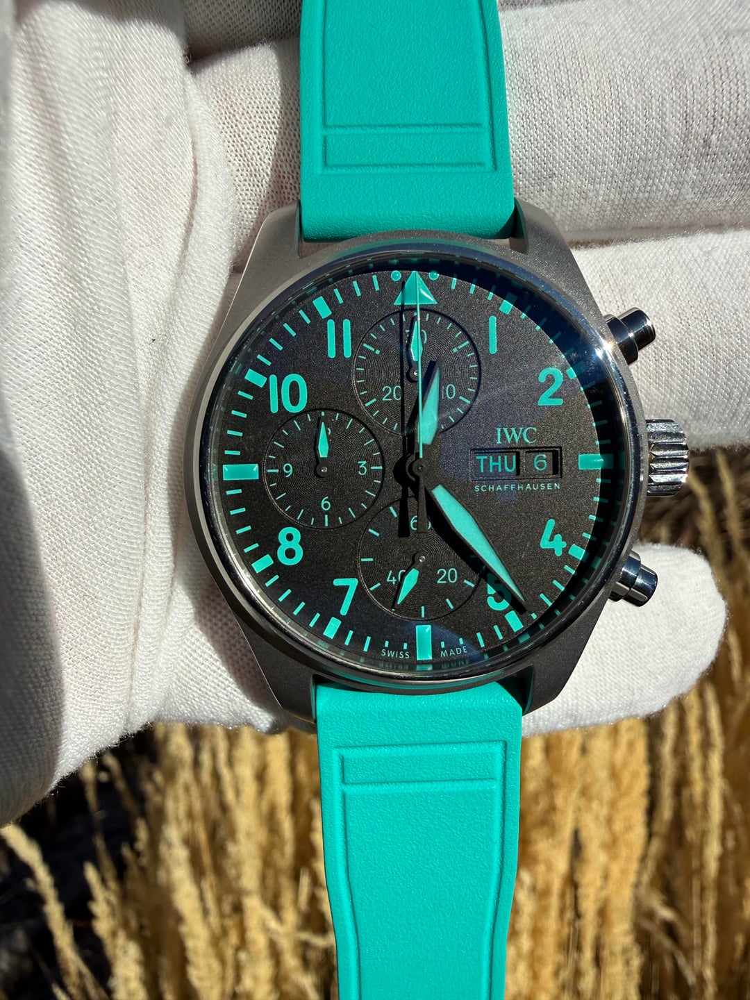 Up for sale is the IWC Pilot's Watch Chronograph 41 Edition "Mercedes-AMG PETRONAS Formula One Team" Crafted from lightweight grade 5 titanium, this 41 mm chronograph features a matte black dial highlighted by the signature Petronas green accents. Inside is IWC's in-house calibre 69385 automatic movement, offering a 46-hour power reserve and precise chronograph timing with day and date display. The design on this one offers a perfect combination of stealth with a pop of color. Equally suited for everyday wear or a day in the paddock at Monaco. Condition: This piece is in mint used condition. Thanks to the Grade 5 Titanium, there are no discernible markings on the case. The crystal and dial are flawless as well. The watch is keeping excellent time according to the timegraph machine. (See included picture) Contents: This will come as a complete set with inner/outer boxes, operating manuals, polishing cloth, black and green EasX-CHANGE straps, and warranty card dated 2023. Shipping: I will include complimentary FedEx, fully insured, shipping in the U.S. Price: $6450 Payment: Wire or Zelle preferred, but can discuss other options with serious buyers. Located in the Denver metro area. Please let me know if you have any questions or would like any further photos. Also more than happy to hop on a FaceTime to show the watch to serious buyers. Thanks for looking. Cheers!