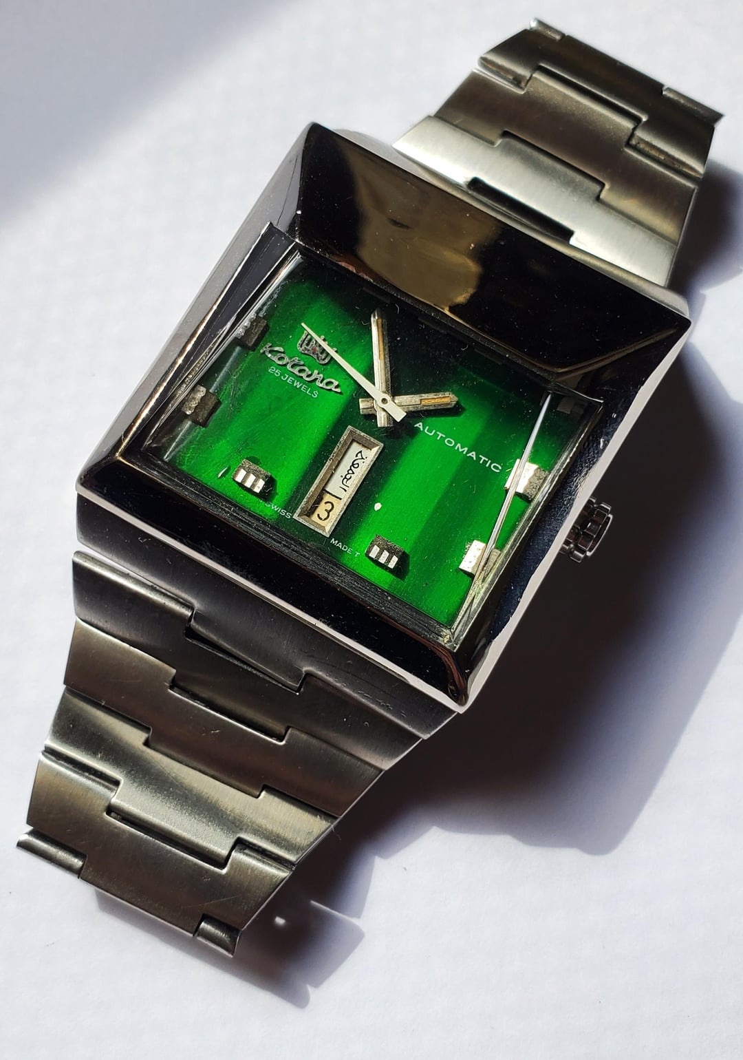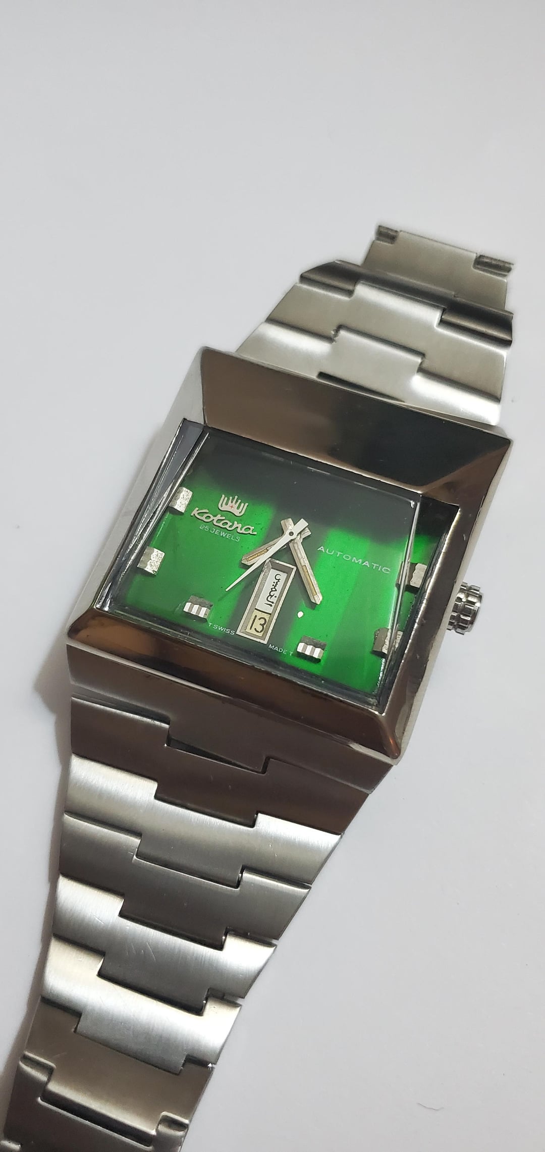 [Timestamp](https://postimg.cc/rDPDpwDG) Hey folks, Putting up for sale this funky Kotana Spaceman Automatic, a seriously cool vintage piece with a bold green gradient dial and a wild angular case design — straight out of the space-age era. Details: Brand: Kotana Movement: Swiss automatic, 25 jewels Dial: Green gradient with silver accents, Vertical Day/Date at 6 o'clock Case: Stainless steel with sharp, geometric lines Crystal: Acrylic Crown: Aftermarket replacement Bracelet: Original Spaceman-signed stainless steel bracelet Condition: Very good overall – minor wear consistent with age, dial pops beautifully in sunlight €220, including worldwide shipping from Egypt Payment via PayPal (FF, GS+Fees) or bank transfer. A super unique vintage automatic that wears unlike anything else — these aren’t easy to come by, especially with the original bracelet. DM for more photos or a wrist shot!