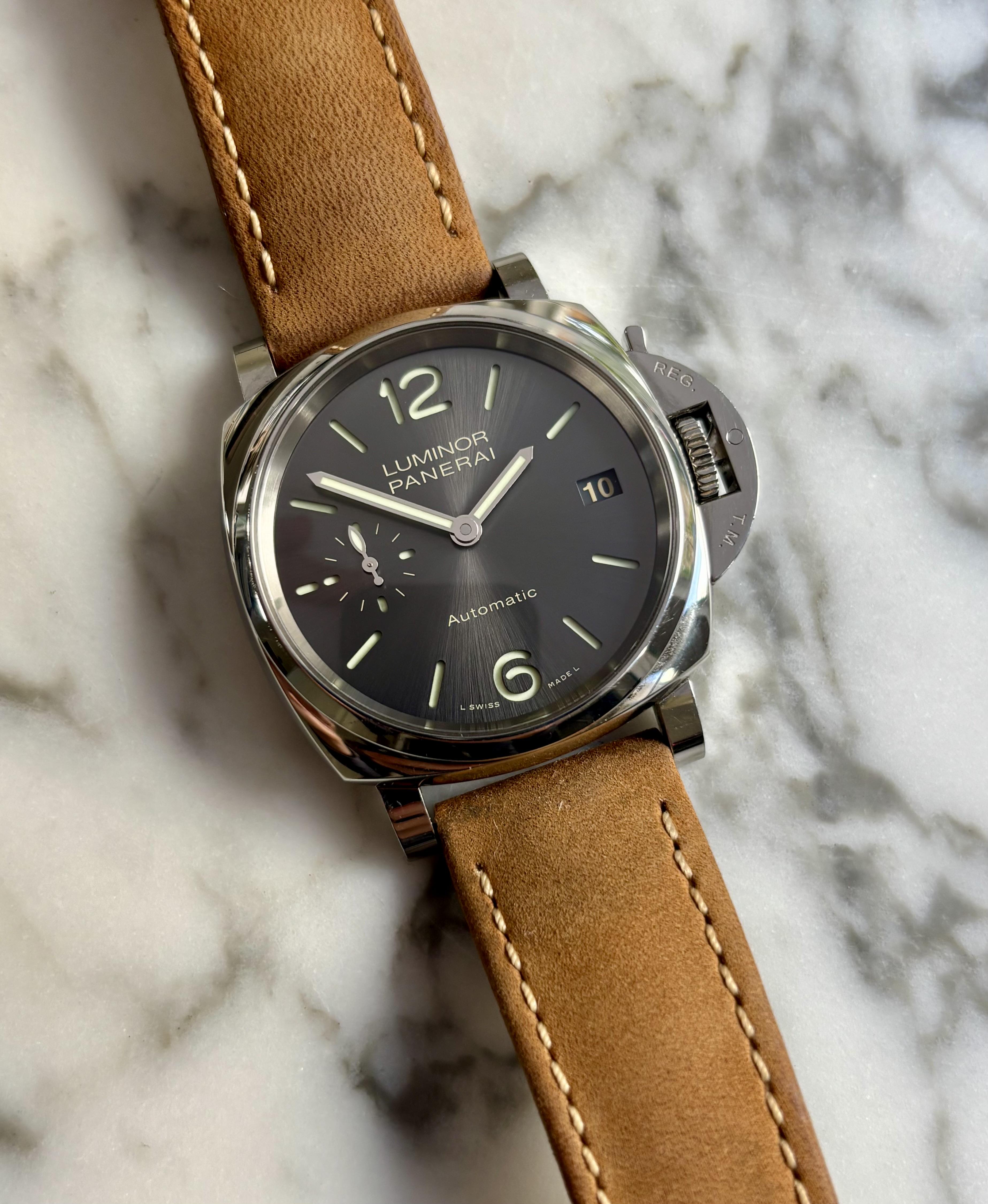 **Panerai Luminor Due 38mm** This Panerai Due retains the classic, iconic Luminor styling but in a smaller, thinner version. 38mm stainless steel case, anthracite sun-brushed grey sunburst 'sandwich dial', matching leather strap on factory buckle. Panerai in-house automatic Calibre P.900 movement. Comes as watch only with Panerai electronic serial registration. Reference PAM755 // PAM00755 // PAM 755 More pics: [https://imgur.com/a/lU8dZ5F](https://imgur.com/a/lU8dZ5F) $3,650 plus shipping 🛫 All watches shipped FedEx fully insured. Local pickup available in Los Angeles area. 💬Positive feedback from hundreds of successful transactions across the watch community, including WUS, Chrono24, eBay, Facebook, and Reddit. I’m always happy to connect by phone or video call to answer questions or verify details. Zelle, Venmo and wire accepted. ⭐100+ five-star reviews on Chrono24 — buy with confidence. ⌚I have a wide range of exceptional watches available, with new pieces added every week.