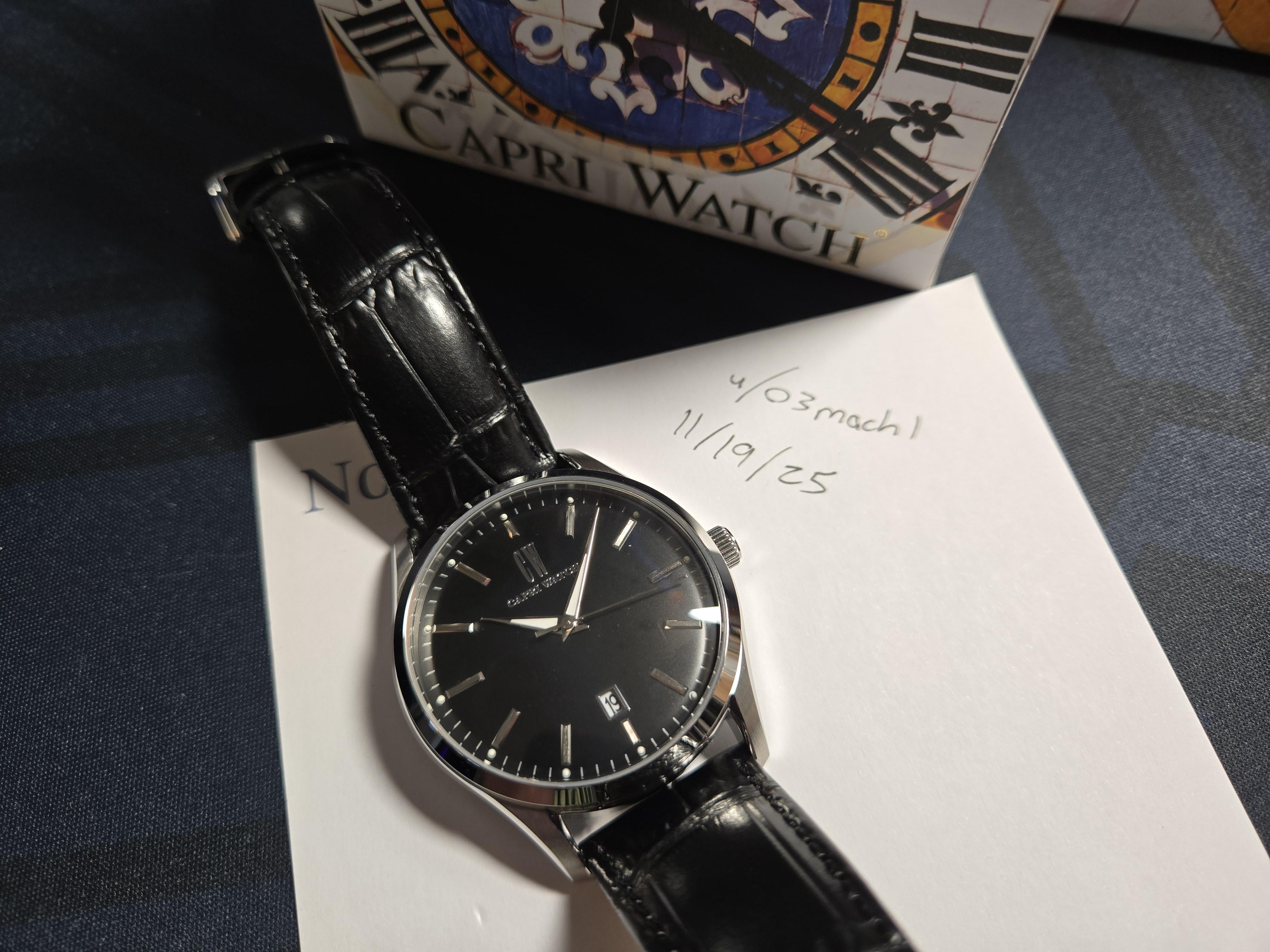Selling a Capri Watch SunRay in black with a Miyota Citizen movement. Ref: CW5521 **Asking for $90 shipped in the US via Zelle or PP F&F.** [Album with timestamp](https://imgur.com/a/Adgg6EQ) website listing: [www.capriwatch.it](https://www.capriwatch.it/shop/orologi/sunray-black-silver-leather/?v=0b3b97fa6688) * Watch Model: Analog * Case Material: Steel * Glass: Mineral * Bezel Diameter: 40 mm * Strap Material: Leather * Lug: 22 mm * Movement: Miyota Citizen * Water resistance: 50 m – 5 atm Purchased in Italy for ~$160 in 2022. Don't wear it often enough to keep.