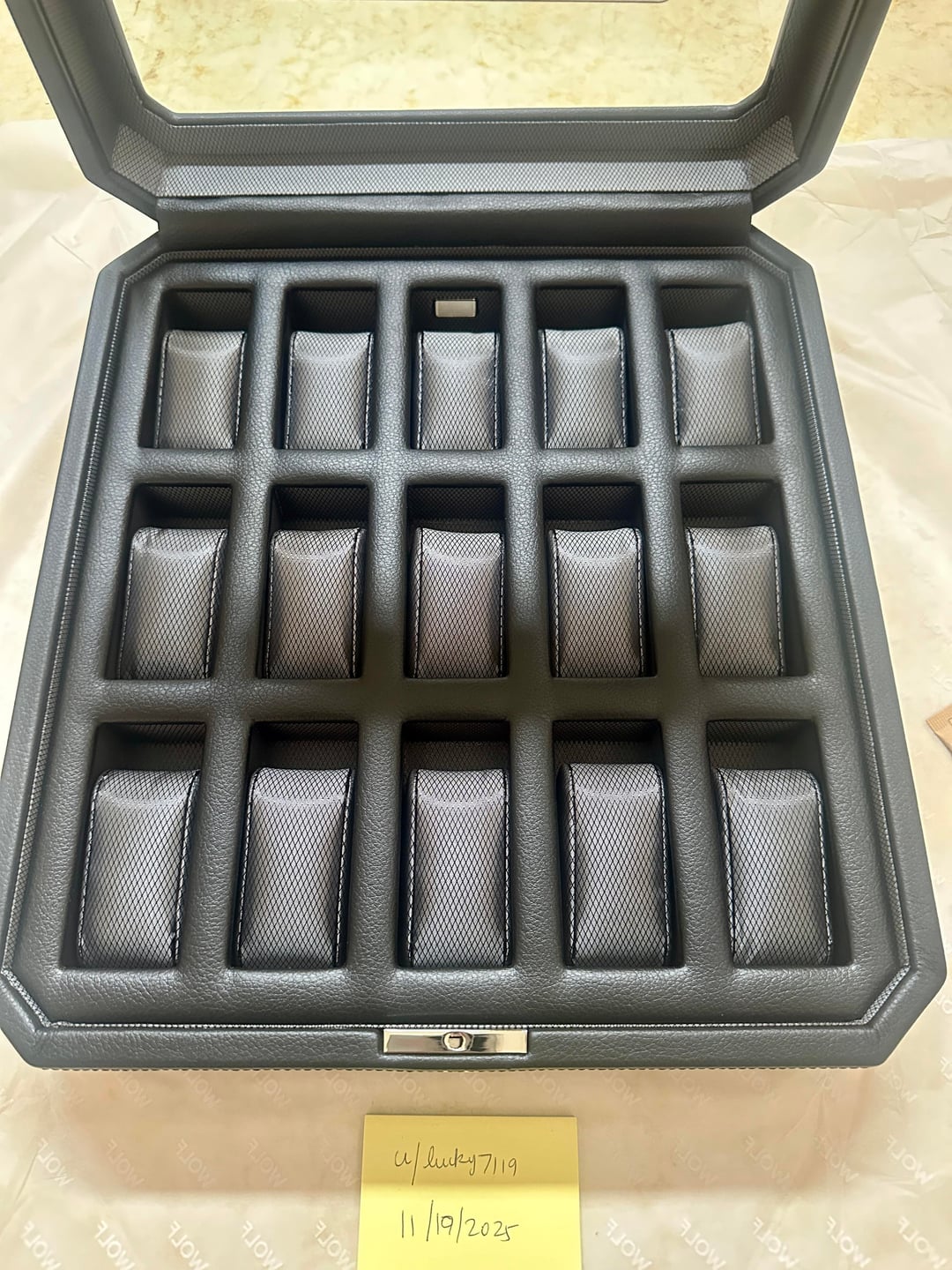 Windsor 15-pc watch box Black/Grey [Product Link](https://www.wolf1834.com/windsor-15-piece-watch-box) Retro shapes and colors make Windsor a perfect companion for your timepieces. Display and organize your collection beautifully with the Windsor 15-piece watch box. Features chrome finished hardware, locking glass cover, smooth vegan leather, lining and 15-piece watch storage. Selling here for $165 BNIB with all original packaging. Free USPS/UPS Shipping within CONUS. Zelle (preferred), Paypal F/F.