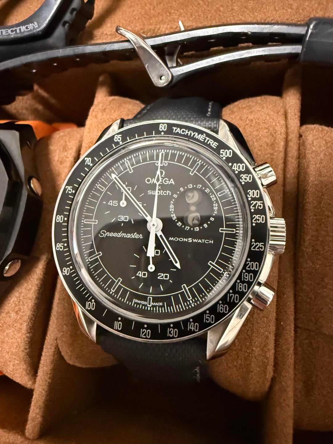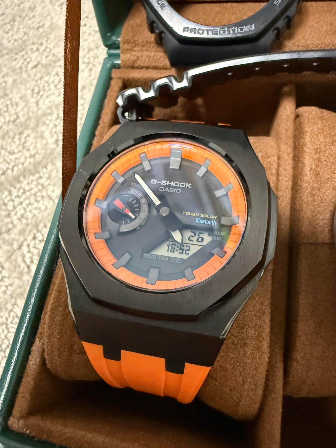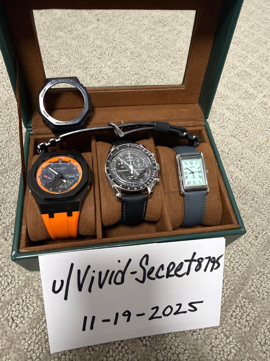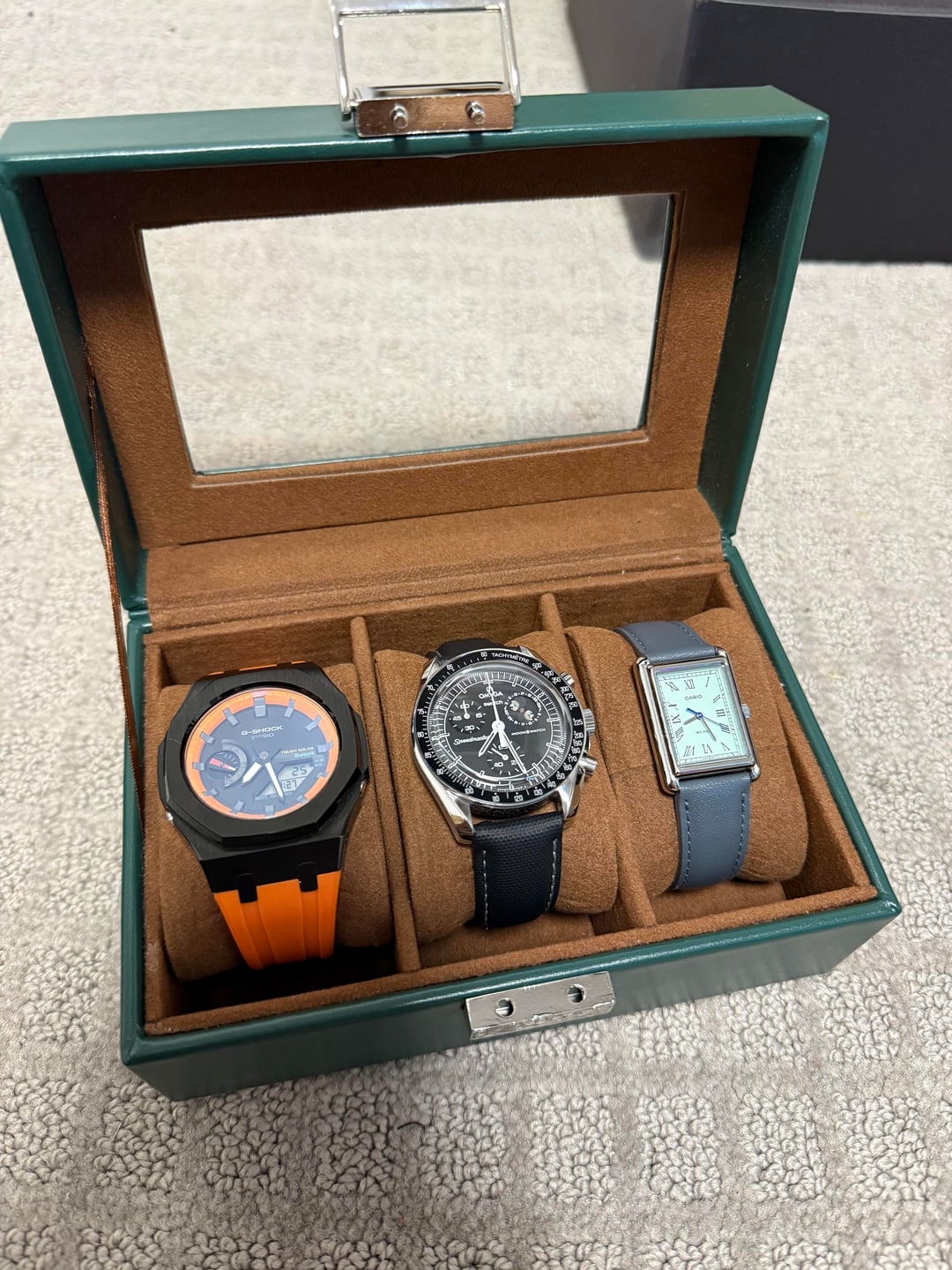 4 watches included: Gshock ga2100 mod with sapphire crystal upgrade Modded Omega swatch Moonphase mod Casio tank Spinnaker GMT With full fits for spinnaker, Casio tank and omega swatch Green case included $899 shipped CONUS Zelle & Apple Pay