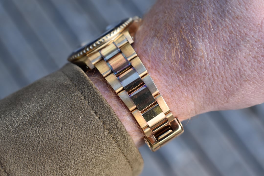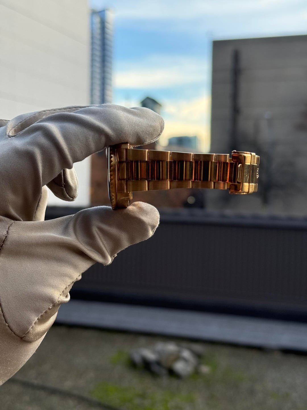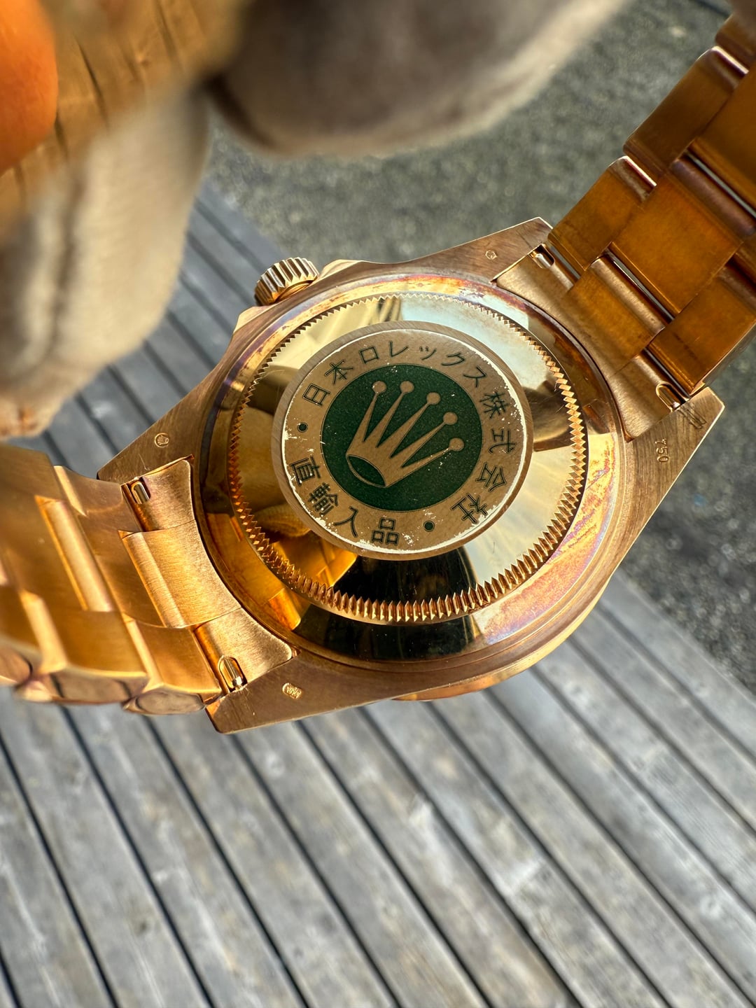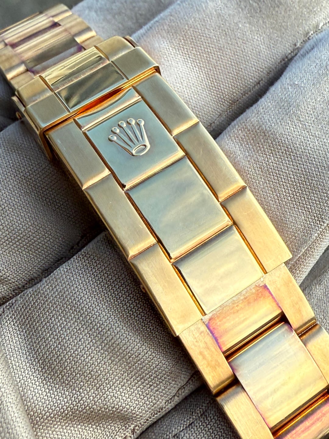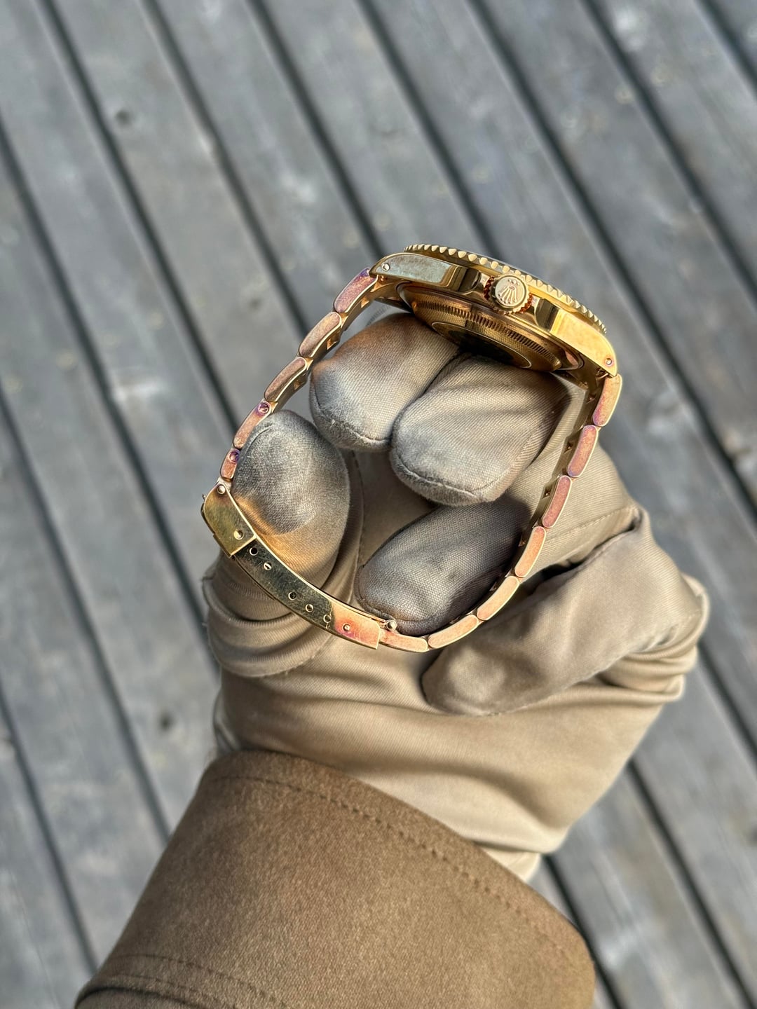 Holy patina! 😍 This thing is absolutely beautiful. Unpolished but not unloved! A true collectors dream! Model: Submariner Date Ref. 16618 Case Material: 18K Yellow Gold Case Dimensions: 40mm Bezel: 18K Yellow Gold Rotating Dive Bezel with Blue Aluminium Insert Dial: Original Blue Dial Band Material: 18K Yellow Gold Oyster Bracelet Max Wrist: 7.5 in. Original Manufacture Date: 2002 Movement: Automatic, Mechanical Accessories: Watch Only Condition: Beautiful preowned condition with mesmerizing gold patina/oxidization. Watch is unpolished with its original case back sticker. Watch has light scratches on the case and bracelet as expected given its age and never being polished. Freshly serviced with a 1-Year warranty! Price: $29,975 shipped! Bank wire price. WA residents subject to sales tax Email: [email protected]
