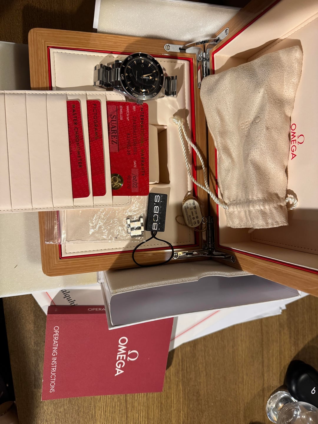 For sale, Omega Seamaster 300 Heritage. Full kit AD purchased 2/22. Priced for quick sale. First come first serve. Great condition. Includes inner wood and outer cardboard box, all cards, hang tags, carrying bag, card wallet, and manual. Sized for 6.75” wrist and includes 2 full links as photographed. $3650 plus shipping USPS Priority fully insured CONUS only. Venmo or PayPal FF only. Please examine photos and ask for more if desired, all sales considered cash and final. Thanks for looking!