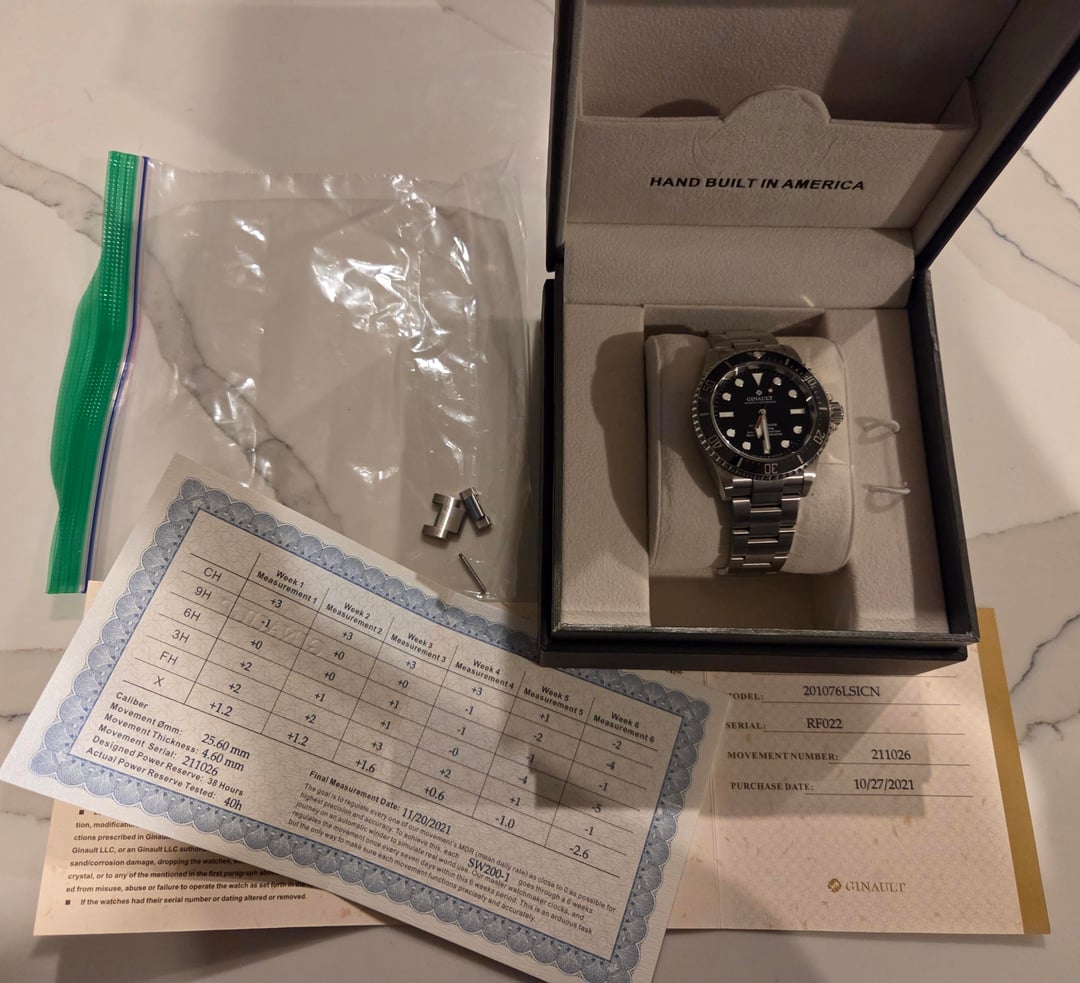 [WTS] Ginault Ocean Rover II No Date - Full Kit Condition - Excellent condition with a some light desk diving scratches on the bracelet and clasp. No scratches on the sapphire crystal or ceramic bezel. Includes - Full Kit with instruction manual, warranty card, all links etc.. Images - https://imgur.com/a/q8Q6XYJ Timestamp - https://imgur.com/a/DYdbMDx Price - $995 with free shipping in the CONUS. Payment via PayPal friends and family, Zelle, or Venmo.