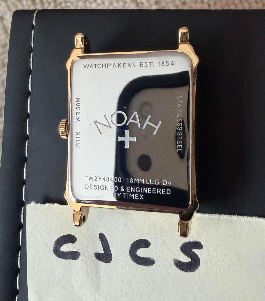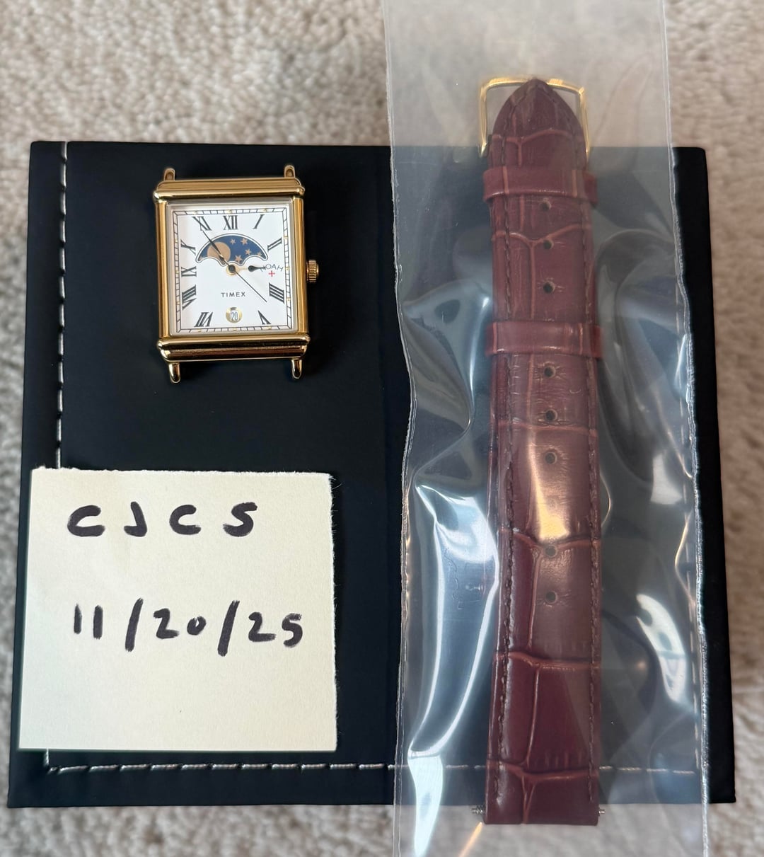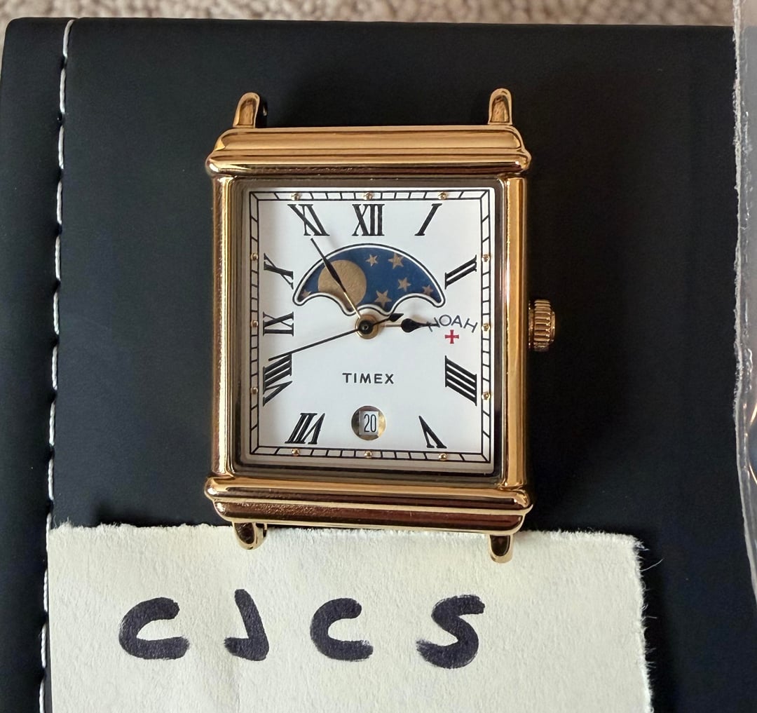 [Noah x Timex Moon Phase](https://noahny.com/products/noah-x-timex-moon-phase-watch?srsltid=AfmBOor3kq2J9SGy5xxd774nAKHVzHQP1vU3v7hPGegUyQtw0EObSAU5) w/ Date in Gold w/ Brown faux alligator leather strap. * Made exclusively for Noah by Timex * Moon Phase dial feature, indicating the current phase of the moon * Genuine leather strap with embossed crocodile pattern * Quartz movement with mineral glass crystal. Hour/minute/seconds hands, and a date window about 6 o'clock. * 50m water resistance * Case Size: 37mm x 25mm. Lug Size: 18mm. These watches are super popular, and supply appears limited due to limited runs requiring pre-order. Timestamp: [https://imgur.com/a/kcnRgcp](https://imgur.com/a/kcnRgcp) Watch is in like new condition. It's been tried on, but hasn't been worn outside. Does not come with original box or papers, but I will ship it in a generic black, padded watch box with a cushion inside. Selling only because it's too similar to my existing dress watch. Asking **$450** shipped to CONUS, via Zelle, Venmo, or PayPal (buyer pays any desired G&S fees). This is not a flip or scalp - selling for essentially what I paid. Local pickup is also a possibility in the San Francisco Bay Area.