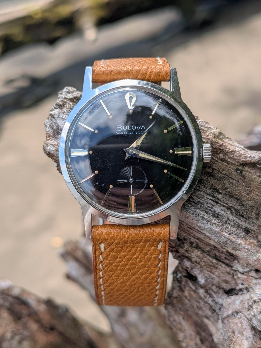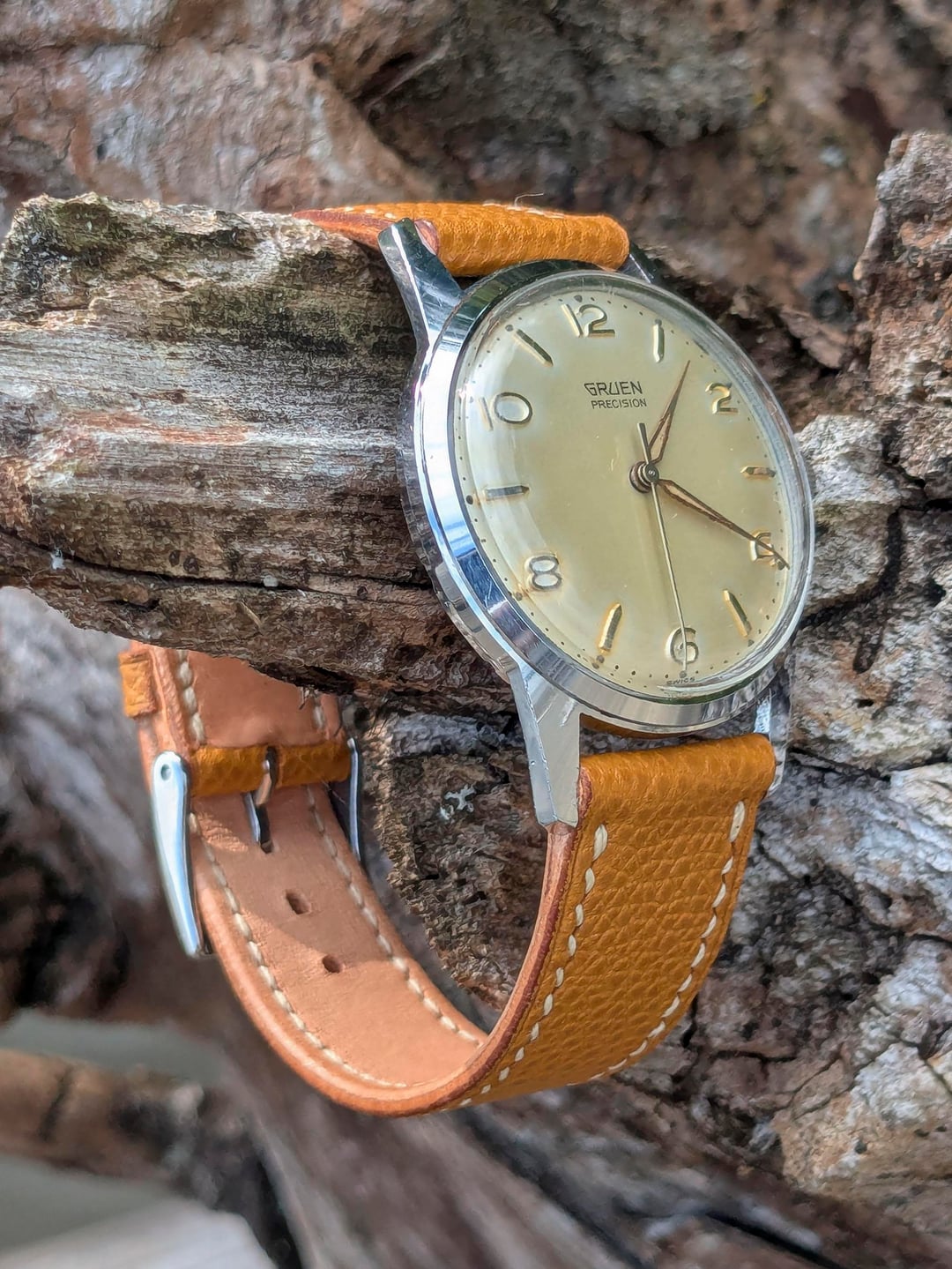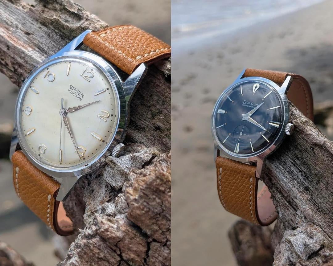 Hello r/watchexchange, I have a couple hand-wound vintage American beauties available. Both are on custom fully hand-stitched Italian leather watch straps that I made myself. Both will fit 6-7in wrists. If you’d prefer a different strap or need a different size, PM me and we can work something out! These watches are both keeping decent time for their age; the Gruen is losing less than a minute per day and the Bulova is a little less healthy at about a 2min loss per day. Service history is unknown. Timestamp: [https://imgur.com/a/dt76gJ2](https://imgur.com/a/dt76gJ2) **1966 Bulova Surf King - Manual Wind** Album: [https://imgur.com/a/rdMjai8](https://imgur.com/a/rdMjai8) This lovely watch is super charming; the deep black dial with the perfectly aged lume really makes it stand out. It would make a great dress watch but totally works in a casual setting, especially on this golden tan strap. Don’t let the 32mm diameter fool you, this watch wears beautifully thanks to its classic proportions. The movement is running well albeit a little slowly losing about 2min per day. The unpolished stainless steel case is in amazing shape, no deep scratches or rounded off edges. Even the flutes on the crown are still nice and sharp, making it very easy to hand-wind. Measurements: 32mm x 38mm x 9mm Price: $195 ($130 head only) **1943 Gruen Precision - Manual Wind** Album: [https://imgur.com/a/HAWBJYb](https://imgur.com/a/HAWBJYb) This gorgeous silver Gruen has survived 82 years and is still going strong! The dial has patinated to a lovely warm antique silver and the hands while tarnished are still holding all their perfectly aged lume. The domed acrylic crystal plays wonderfully with the slightly domed dial underneath. The case is in excellent shape for its age, showing only minor pitting on one the underside edge. Measurements: 34mm x 43mm x 10mm Price: $150 ($95 head only)