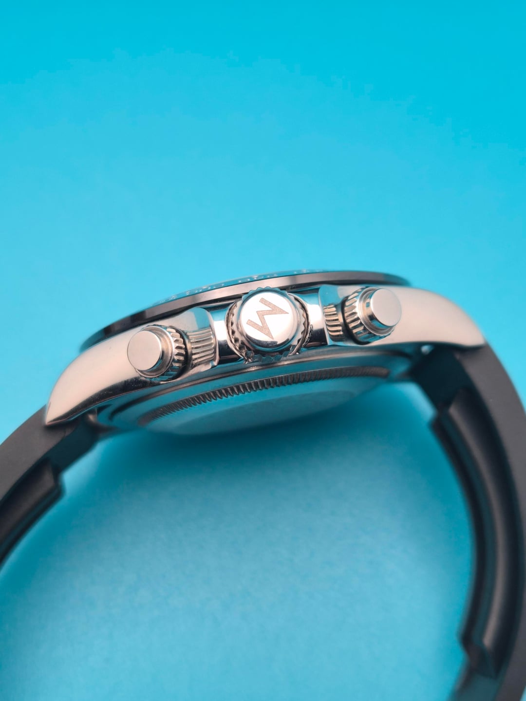 For Sale – Monterey Watch Company Moonstream Chronograph Condition: Pre-owned, in excellent condition. Watch details: Movement: Seiko VK63 Meca-Quartz Case material: 316L stainless steel Case width: 39.5mm Lug to lug: 48mm Case height: 12mm Lug width: 20mm Crystal: Sapphire Dial: Silver/black "panda" dial + 3D printed time scale with hour/minute/seconds sub-dials Handset DLC silver hands, green C3 lume Water resistance: 100 meters Strap: Black FKM rubber strap with micro-adjust strap and security fold-over Includes: Box, card Price: $200 Shipping: Free shipping within the CONUS. Payment: PayPal F&F, Venmo F&F, or Zelle accepted. Location: Fernandina Beach, Florida Thank you for viewing my listing!