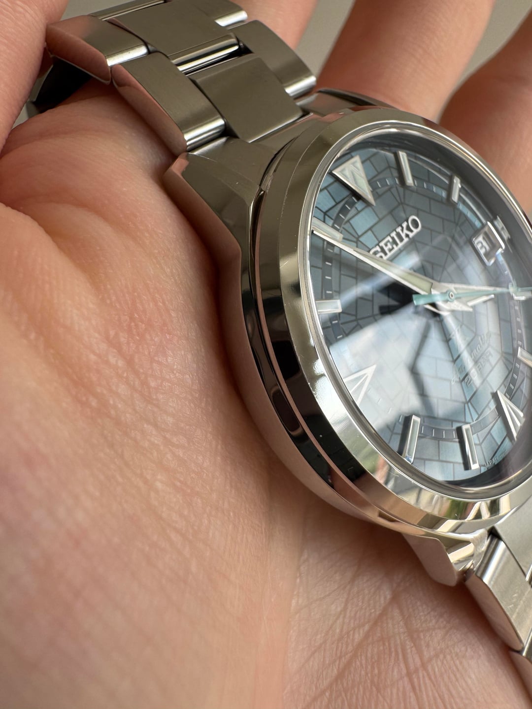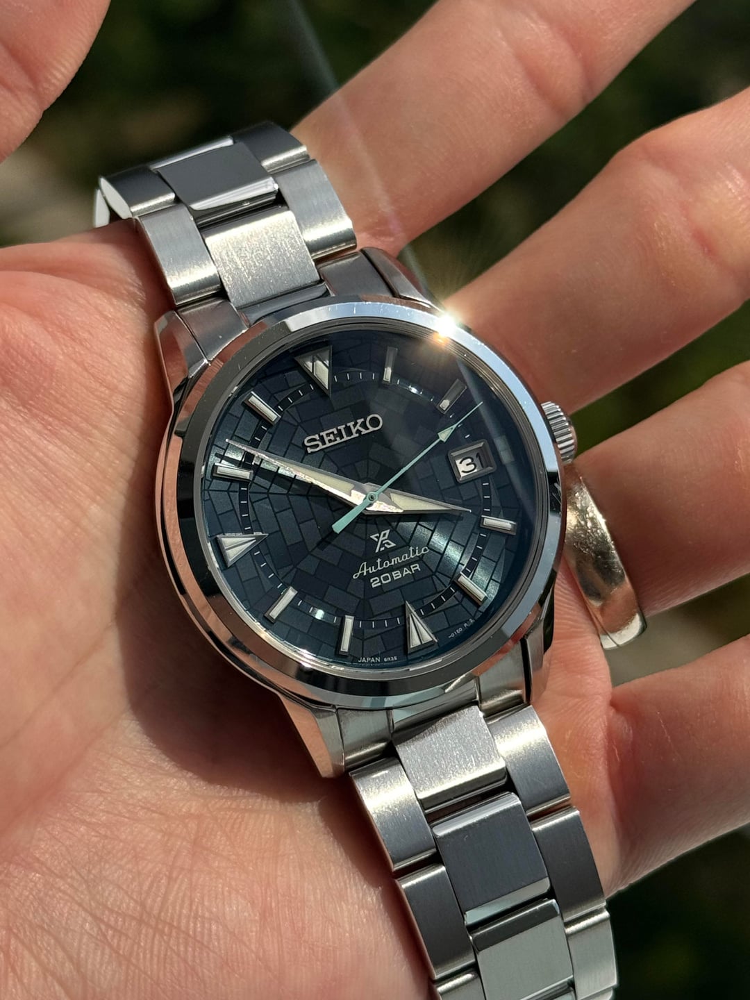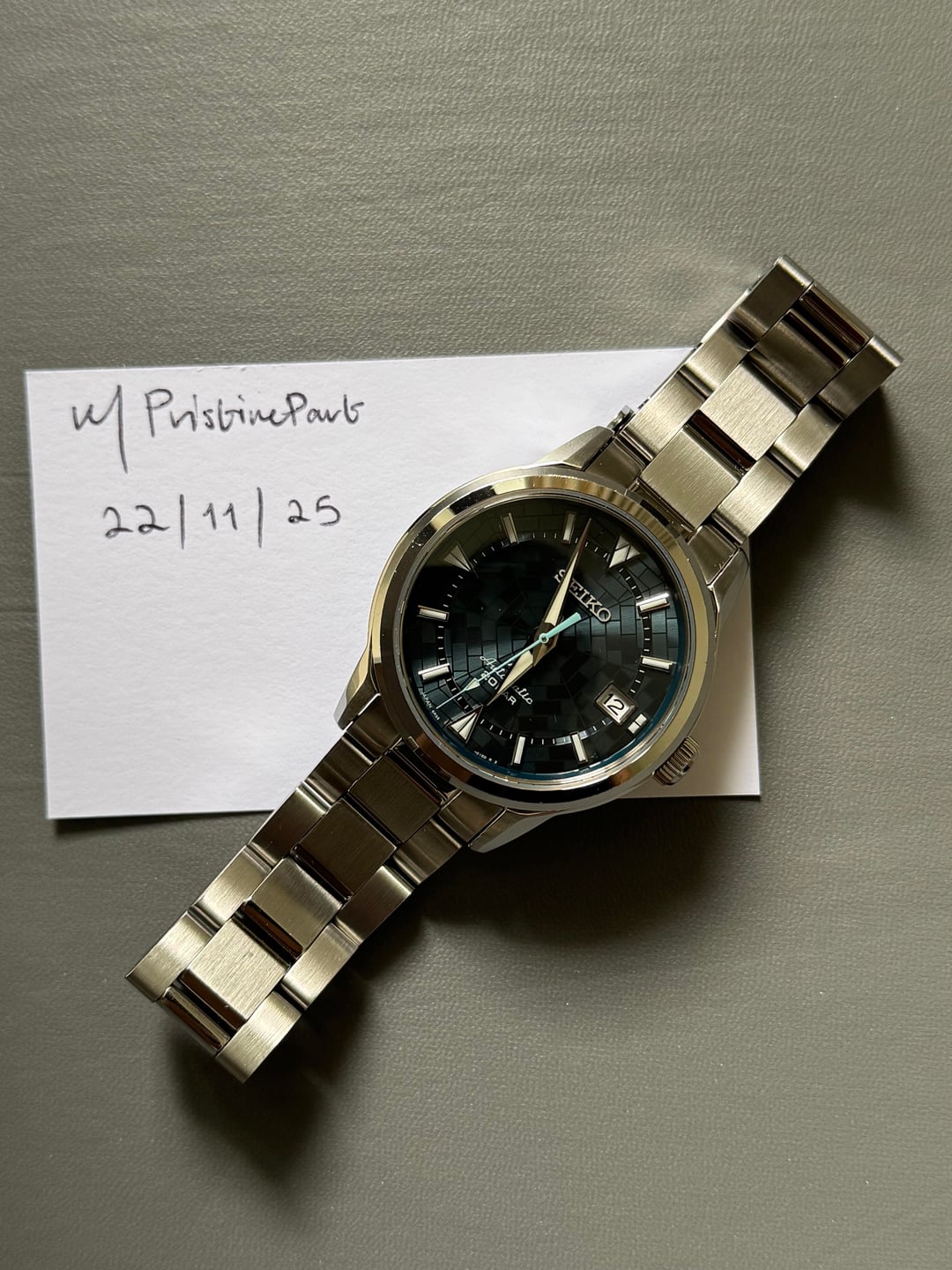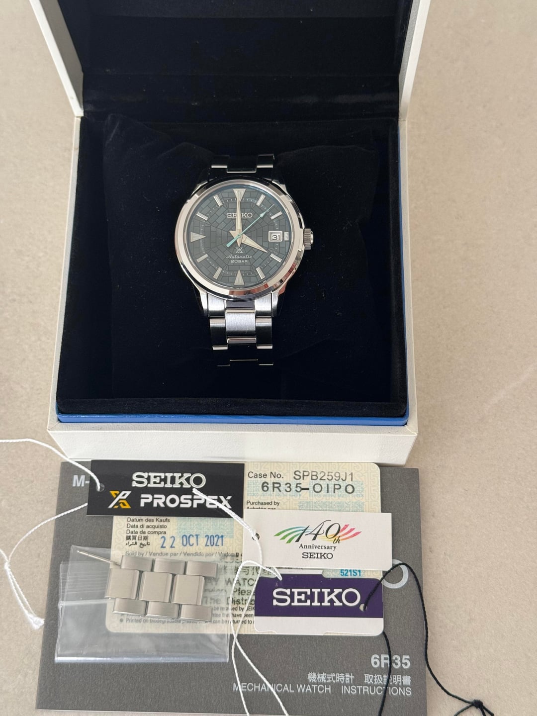 Seiko Prospex SPB259J1 for sale - beautiful dial that really stands out under light. Full set with warranty card (expired), tags, full links and box. Currently sized for a 6" wrist. Watch has some wear from daily use over a year, but nothing major. Most of it is on the bezel, with a couple dings and light scratches - most of what you'd expect from regular wear. A small nick (took me a few tries to capture it at a certain angle) on the sapphire crystal that can be polished off if you want to, hairlines around the watch - bezel, caseback and bracelet. Overall still plenty of life left. Watch has not been serviced since purchase, and I have not noticed anything out of the blue. Manual timekeeping (dial up) gives me a reading of -19 s/d. Asking for $1360 shipped from Singapore to US / Europe / Australia / Asia via FedEx / Aramex Priority. Payment methods: Wise / Revolut preferred due to unfavourable exchange rates on PayPal. * Diameter: 38.0mm * Lug-to-lug: 46.2mm * Case thickness: 12.9mm * Lug width: 19.0mm Do leave a comment before sending a PM, thank you!