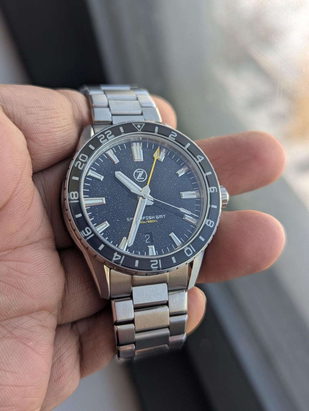 Hi all! **Zelos Spearfish Aventurine GMT - $899 + Shipping** Beautiful watch in almost perfect condition (no scratches or dings on the case or bracelet apart for a few swirls on the case back). Priced very well for a quick sale! **Spec monster:** - **40mm Case** and Bracelet has a **1200Hv hardness coating** which keeps it looking like new even after regular use. - Swiss Caller's GMT with customized Rotor - Sapphire Bezel Insert, bi-directional - Bracelet with tool-less micro-adjust and quick release - Beautiful Aventurine Dial! Link to product: https://zeloswatches.com/products/spearfish-gmt-aventurine Happy to answer questions!