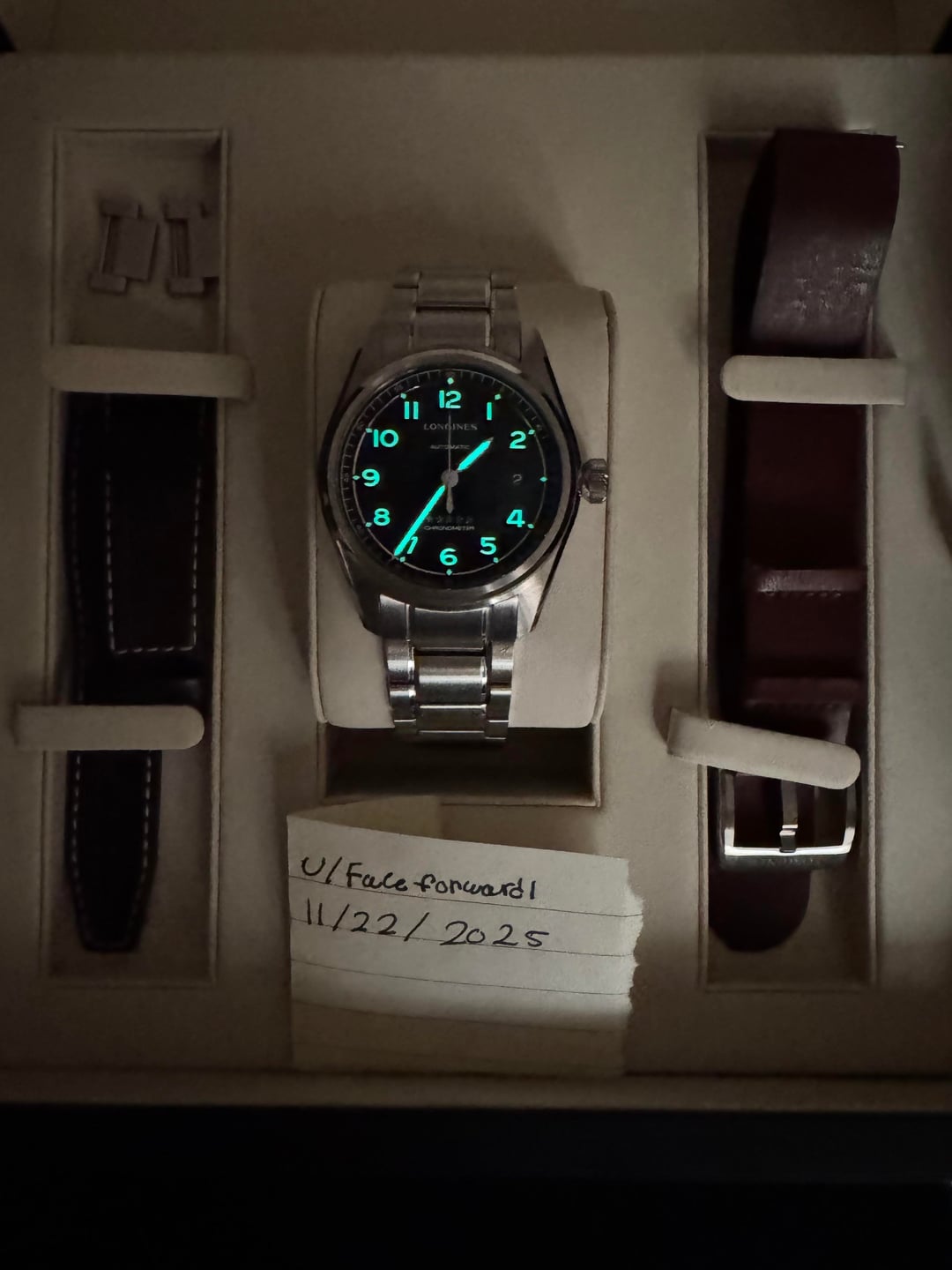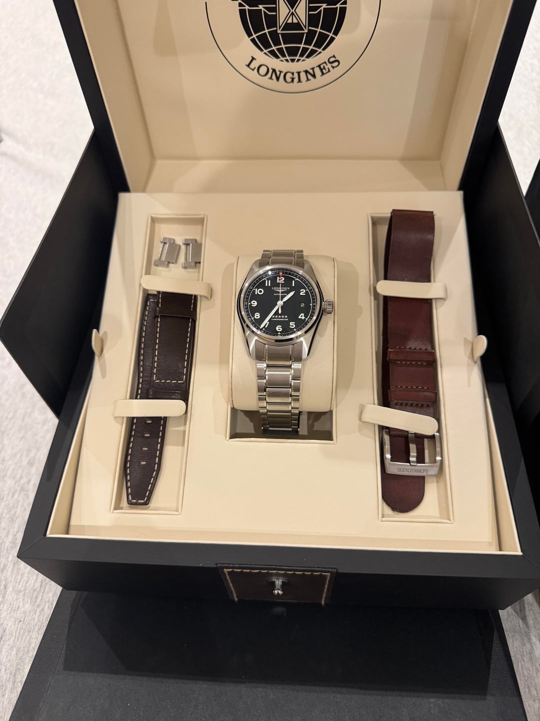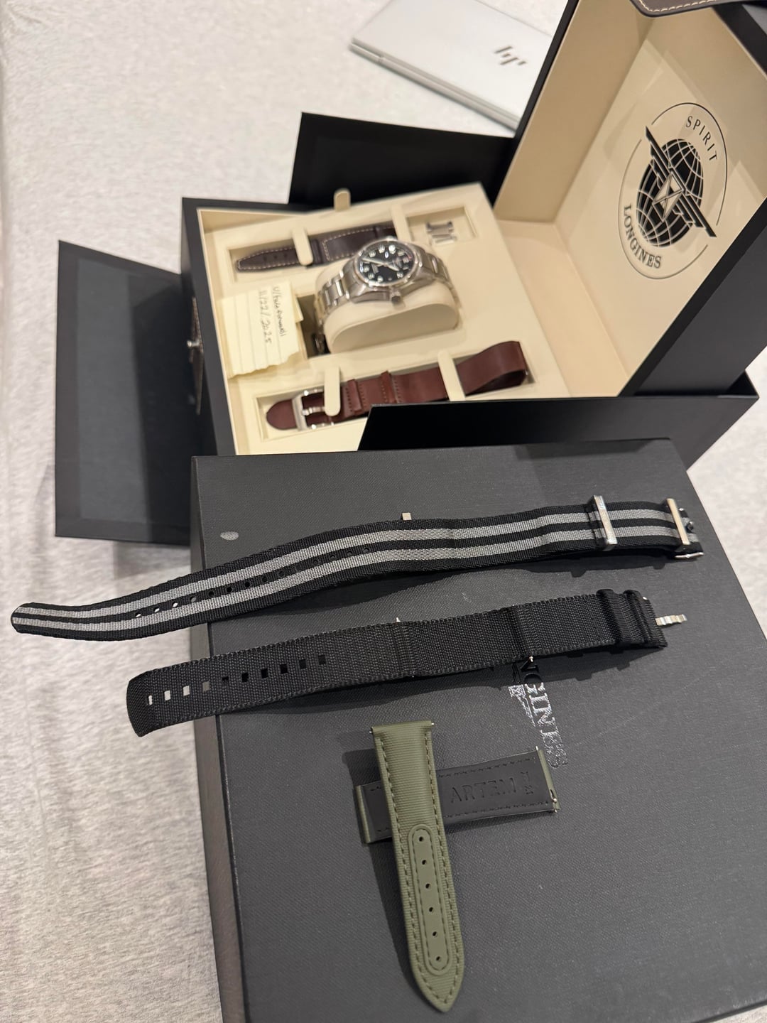 Hello Everyone, I'm putting for sale the Longines Spirit *Prestige Edition* 40mm, purchased directly from the boutique. **Details:** * **1750 USD + Shipping (Wire or PP F&F)** * **Condition:** Near-mint with minimal wear, no dents or deep marks. Crystal is flawless. * **Set:** Complete Prestige Edition box set with all original accessories. * **Includes:** * Watch on stainless steel bracelet * Two Longines quick change leather straps (brown & dark brown) * OEM extra bracelet links (2 pcs) * Prestige presentation box, Warranty card, booklet, papers, and original purchase receipt * **BONUS:** Three extra aftermarket straps (grey/black NATO, black nylon, green rubber segment) **Note:** * Some links are missing, but I’m including two original longines links that add about 14mm of length. With the clasp micro-adjust, the bracelet fits wrists up to roughly 7 inches and is currently sized around 6.3–6.4 inches. The included straps ensure full flexibility for any wrist size. * Not interested in trades at the moment!