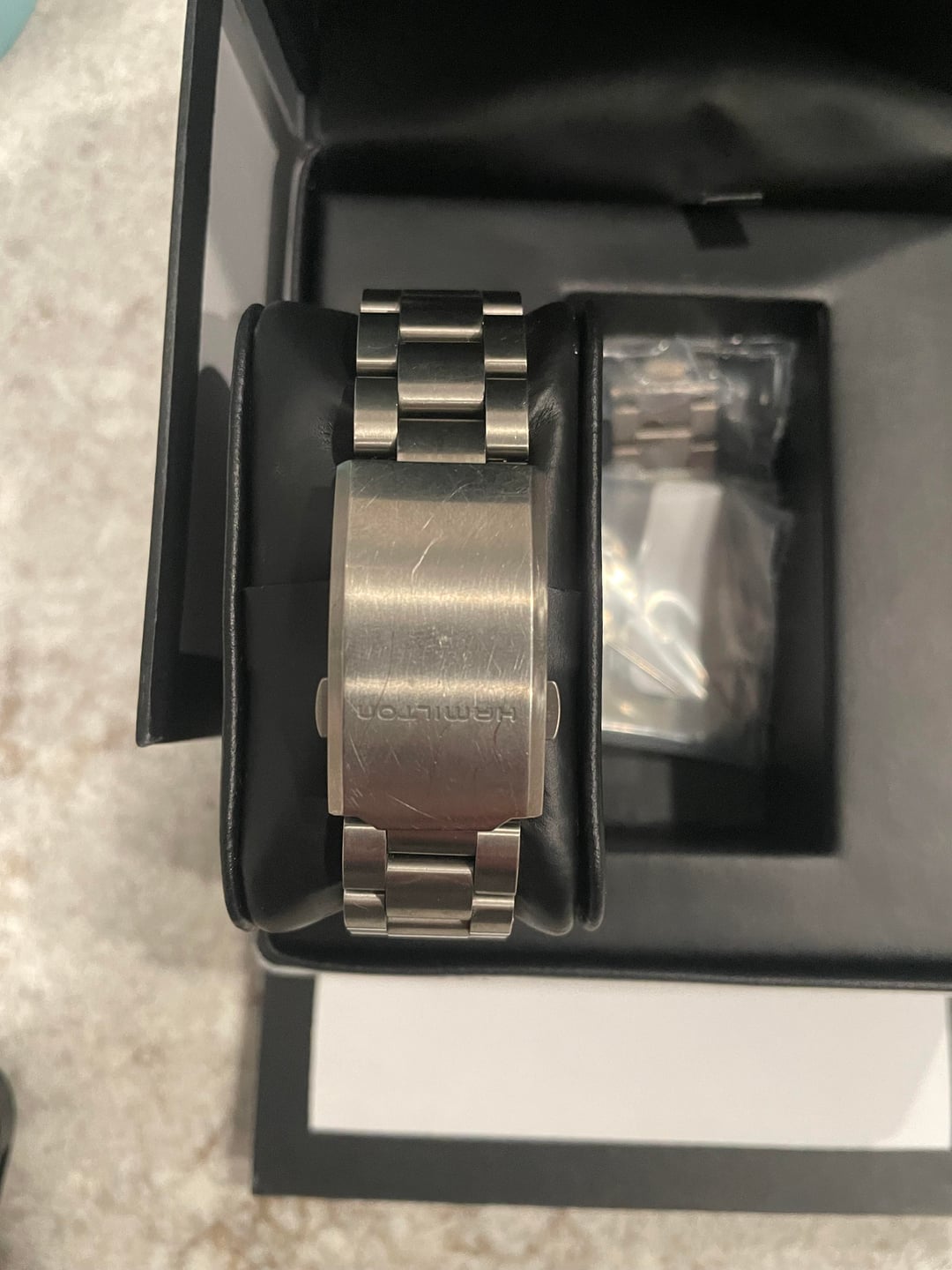 Good condition, just desk rash to the clasp and band from normal use Comes in the older style white Hamilton box and includes additional links for the bracelet $700 shipped, no trades please