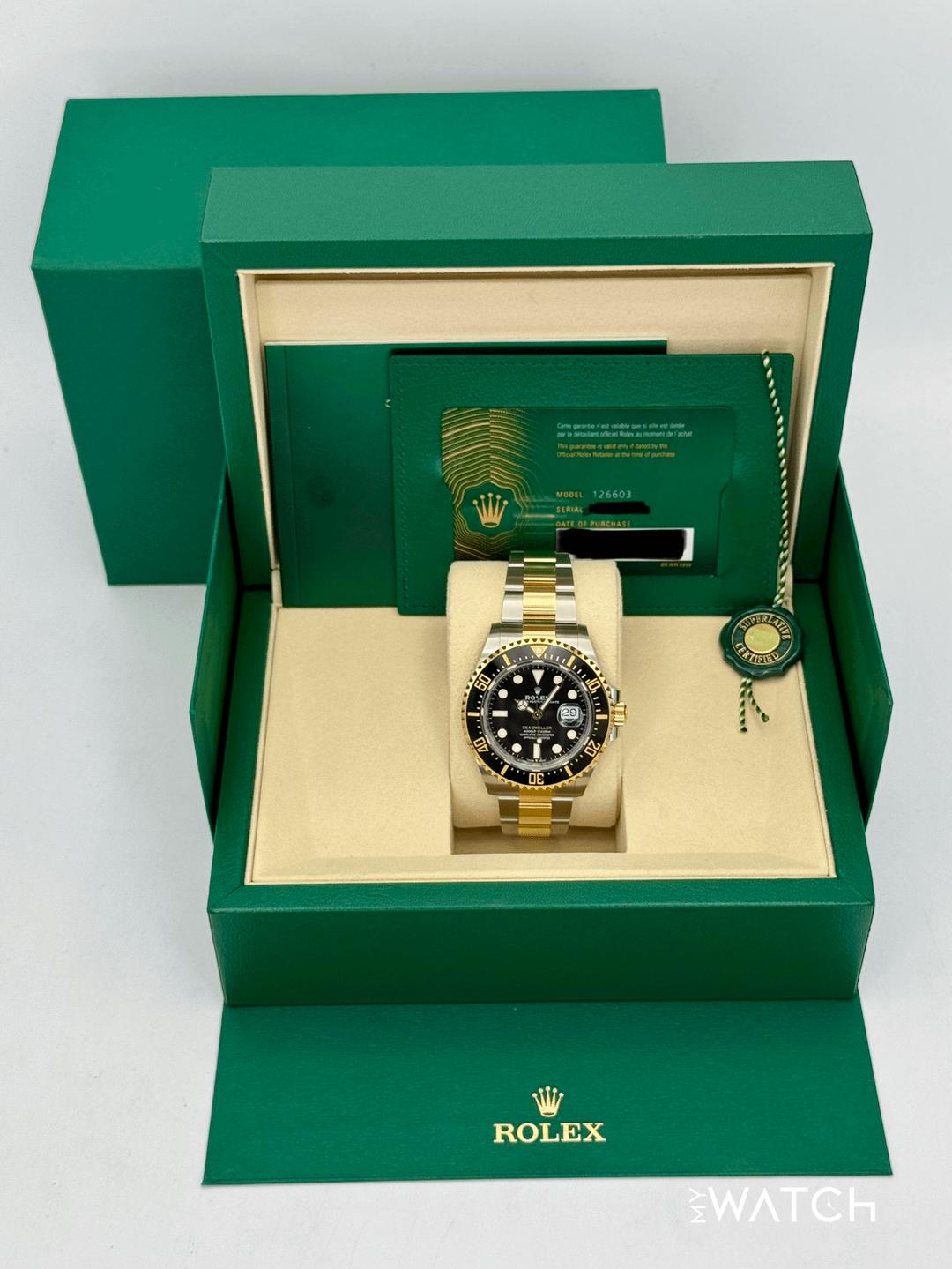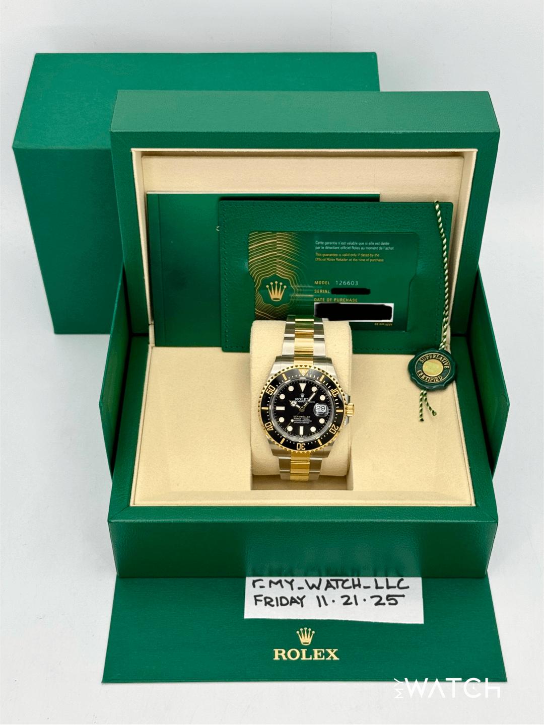 🔵**2025 Rolex Sea-Dweller 43mm 126603 Two-Tone "Yellow Rolesor" Oystersteel and 18kt Yellow Gold with Oyster Bracelet and Black Dial** 🔵**TRADE or SELL us your luxury watch, all brands considered. Message me details.** **Includes the following:** **✔️BRAND NEW 2025 UPDATED ROLEX BOX (DOUBLE BOXED)** **✔️Box and Papers - Yes** **✔️Warranty card dated October 2025** **✔️5 year manufacturer warranty** **✔️Manual and Warranty booklets** **✔️Green Hang Tag included** **✔️Size: 8.5inch wrist (Full Links)** **✔️Watch is in excellent overall condition. Please see photos for details.** **✔️**[**Trades**](https://mywatchllc.com/pages/sell-rolex-watch) **welcome** Business Name: **My Watch LLC** LOCATION: Oak Park, Michigan ✔️[MyWatchLLC.com](http://mywatchllc.com/) for current inventory ✔️Google Business Listing [https://g.co/kgs/Cmd6FPW](https://g.co/kgs/Cmd6FPW) ✔️Business Hours M-F 9-6 ✔️Facetime/Video chat/calls welcome to view the watch interested. ✔️Contact: 248-422-0909 via text or call for quickest response. 🟢TERMS: Visit [MyWatchLLC.Com](http://mywatchllc.com/) for payments accepted 🟢REFERENCES/REVIEWS: We are well reviewed on all platforms from google, trust pilot, rolexforums, additionally we have 300+ reference in multiple FaceBook watch groups, reference checks welcome. 🟢SHIPPING: If you are not local, we offer Fully Insured FedEx overnight shipping in the USA for a fee. International shipping available.