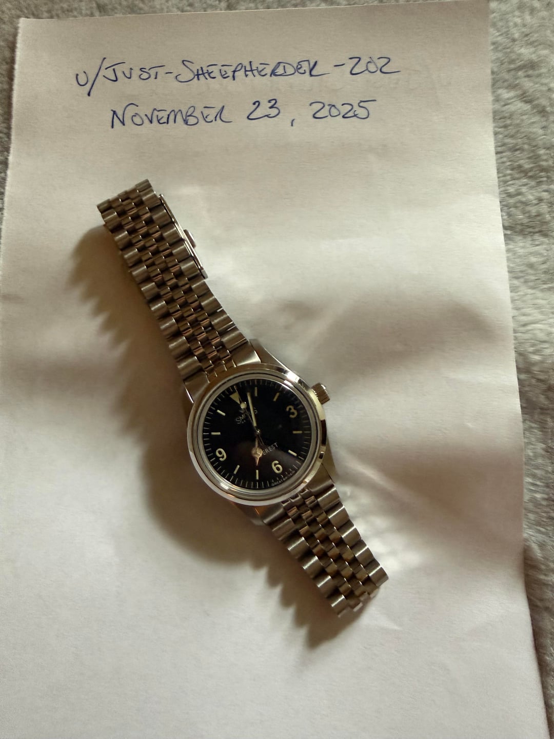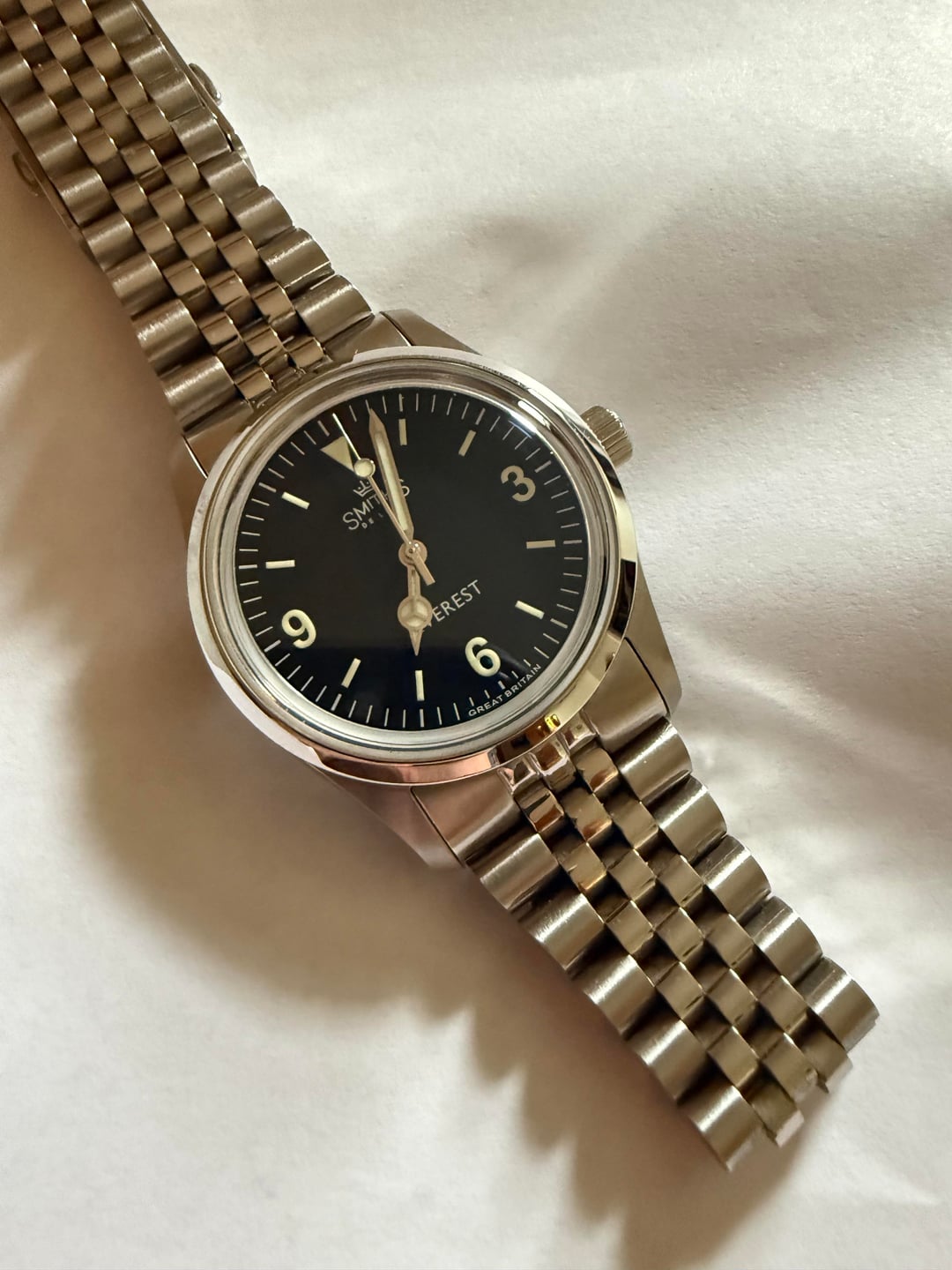 Up for sale is my Smith’s Everest Case• 316L stainless steel, brushed top with polished sides• Diameter 36mm, 39.3mm including crown• Lug to lug height 43.5mm• 11.4mm to the top of the sapphire crystal• Lug spacing 20mm• Anti-magnetic 20,000A/m with anti-magnetic movement cover• Water Resistance 10ATM/100 metres/330 feet• 140 grammes including bracelet• Screw back, screw down crown, drilled lugs• Everest caseback designDial• Satin black • Triangle, numbers and indices SuperLuminova X1-C3Hands• Mercedes hands, polished steel• Luminous: SuperLuminova X1-C3Crystal• Sapphire with anti-reflective coating on the underside , 30.4mm diameter x 2.5mm thickMovement• Miyota 9039, 24 jewel automatic, 28,800 BPHBracelet• Stainless steel jubilee bracelet tapering from 20mm to 16mm with screwed links, solid end links and signed push-button clasp. Price is $425 shipped to CONUS No wait and no tariffs! See pics for full details. Comes with extra links and case.