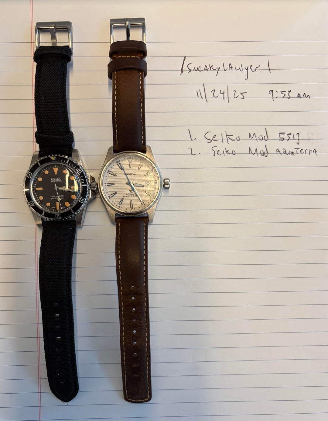 Two Seiko mods for sale: 1. Aqua Terra mod. Great condition, Runs perfectly. 2. 5513 mod. Good condition, except the bezel does not rotate easily. Also runs perfectly. $225 each or $400 for both. Shipping CONUS included!