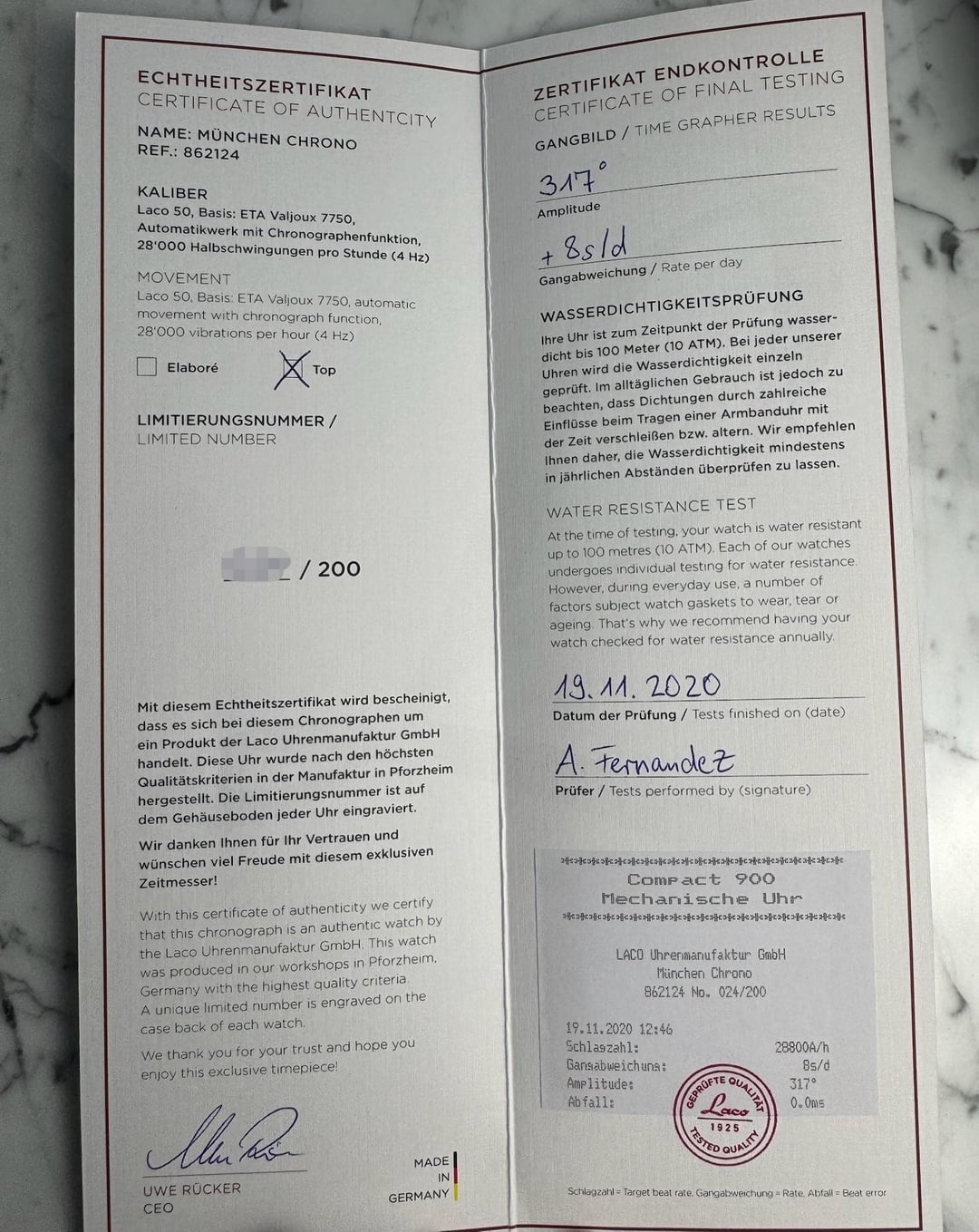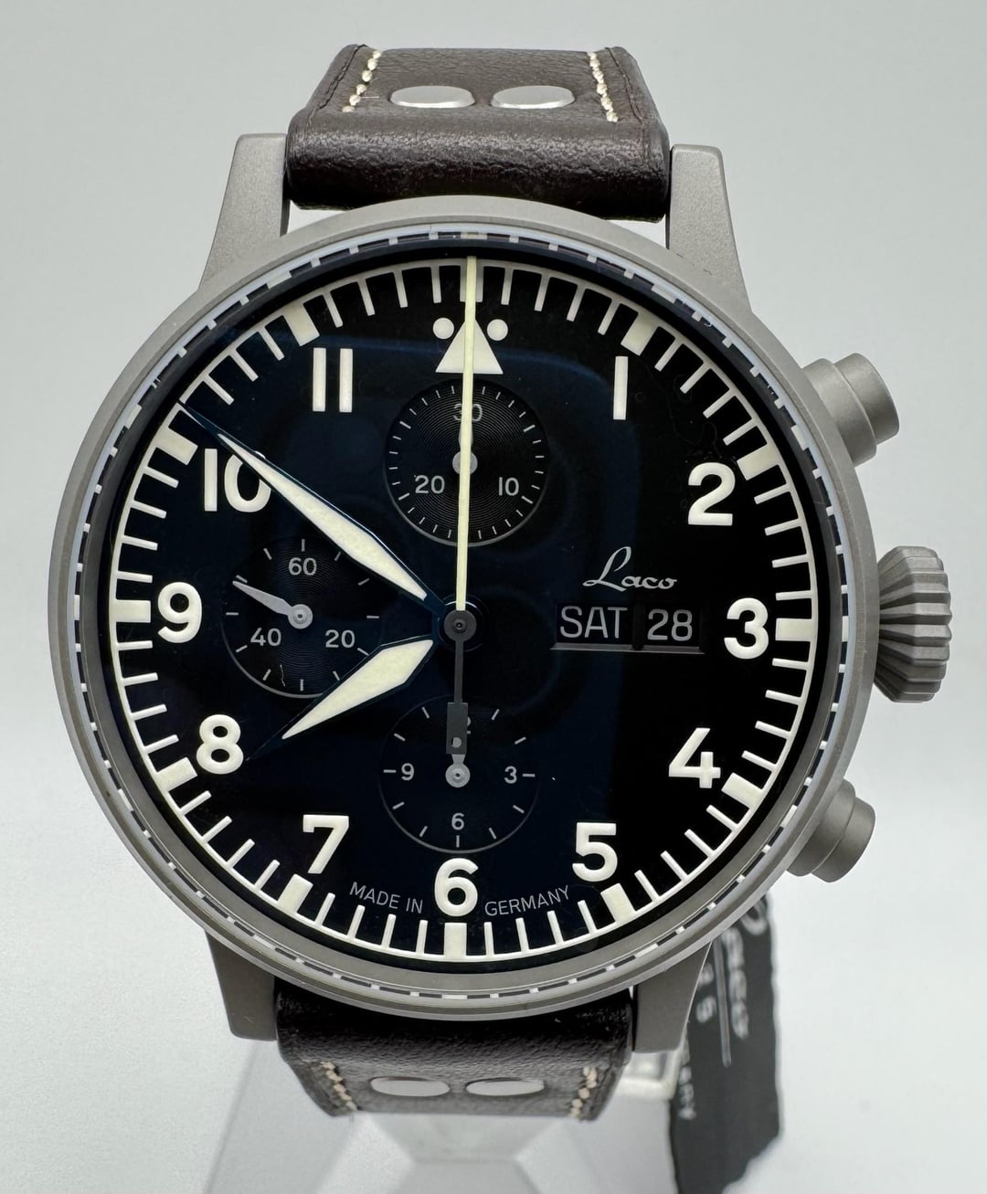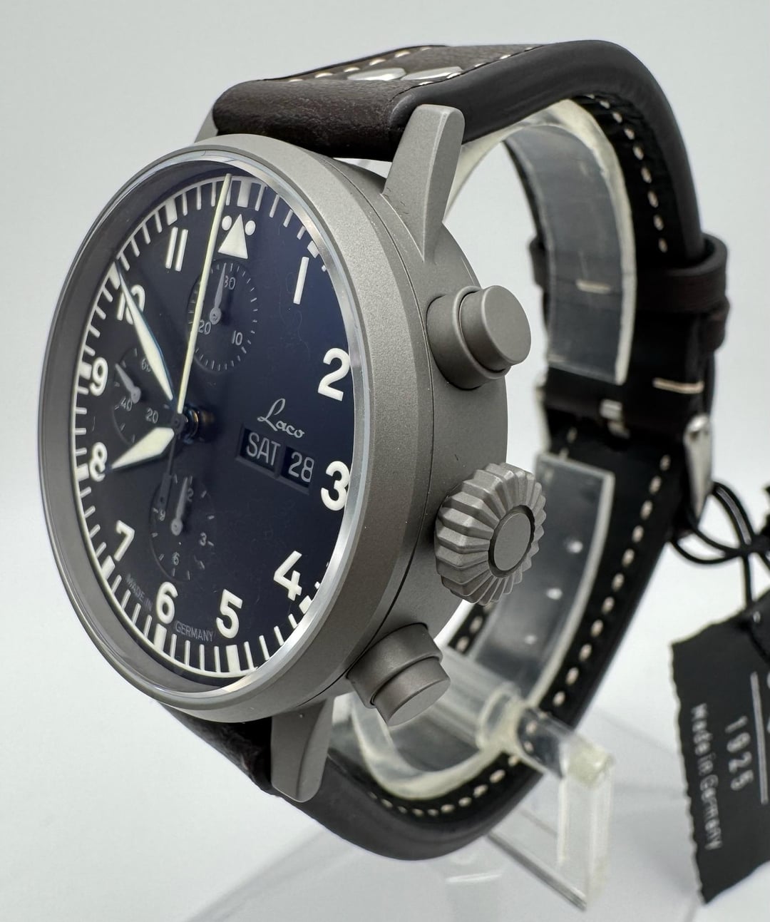 Laco Pilot München Chronograph Ref. 862124 presented in all-original, new and unworn condition. The 42mm stainless steel case is crafted with Laco’s signature pilot design language, reflecting the brand’s deep aviation heritage. This limited edition model was produced in a run of only 200 pieces worldwide and has been completely sold out, making it a highly sought-after collector’s item. Powered by a precise automatic chronograph movement, the watch combines functionality with refined craftsmanship. Offered as a full set, it comes complete with its original boxes, certificate, papers, and an additional strap. A rare opportunity to own a modern Laco pilot chronograph in untouched condition. **Reference:** 862124 **Size:** 42mm **Year:** 2020 📜 Includes: Original box, papers, booklets 💵 Price: $2,075 + FREE overnight shipping with FedEx fully insured. [Timestamp](https://imgur.com/a/dGMWk8a) 🔥 Follow us on [Instagram](https://www.instagram.com/bogossiajewelers) 📍 Location: New York 🔒 Authenticity: 100% guaranteed, buy with confidence. We have 150+ reviews on Chrono24 with 180+ transactions, and Excellent rating score on Trustpilot. Visit our [profile](https://www.reddit.com/u/BoghossianJewelry/s/vm81HAdB7o) for links and references. 📦 Domestic Shipping: Ships with FedEx overnight, within 24 business hours of payment, from New York, NY to CONUS. The shipment is fully insured against damage, loss or theft. 🌍 International Shipping: Incurs an additional $100. 💳 Payment: PayPal/CC (+4%), Web, or Face-to-face deal in NY. 🔐 [Seller References](https://bogossia.com/authenticity) 🔗 [Other Listings](https://www.reddit.com/u/BoghossianJewelry/s/vm81HAdB7o) 📸 [IG: @bogossiajewelers](https://www.instagram.com/bogossiajewelers)