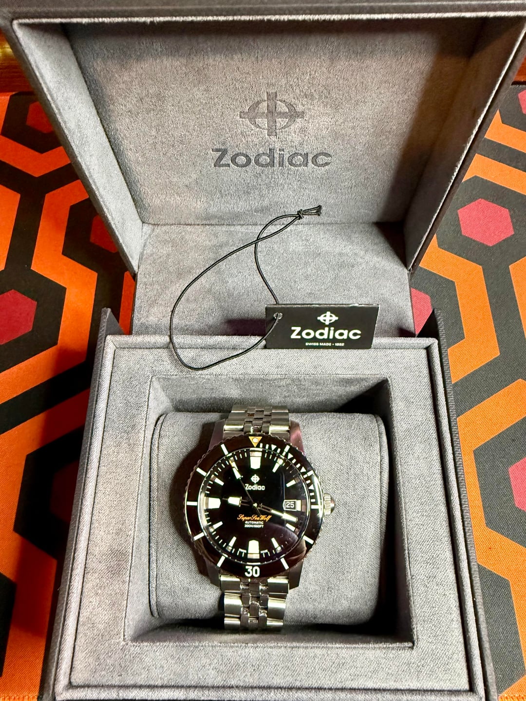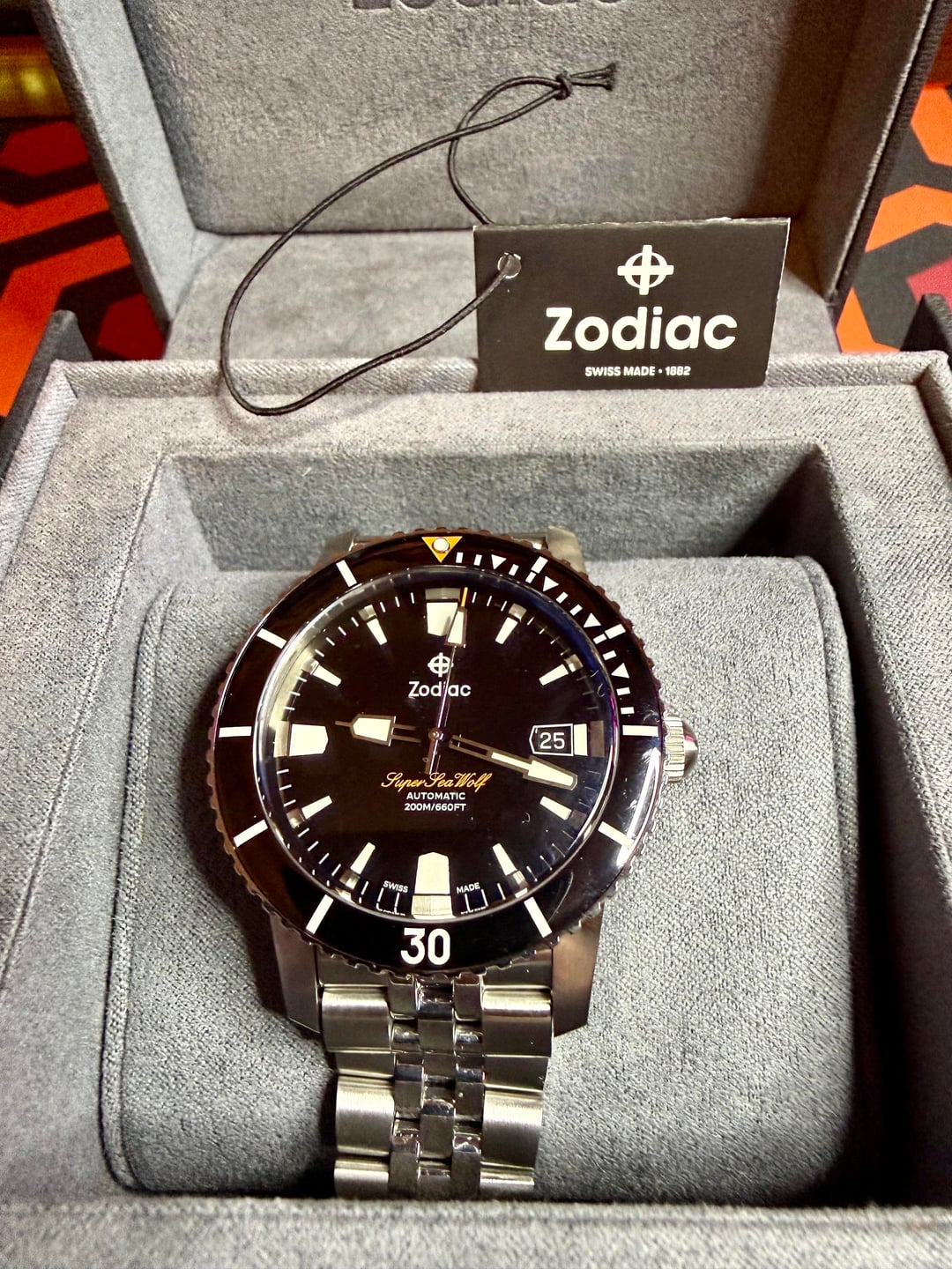 Zodiac ZO9296 - 40mm Super Sea Wolf 53 Compression - featuring a black glossy dial, stainless steel case and bracelet, and a Swiss-made automatic STP 1-11 movement. It has a sapphire crystal, 200 meters (20 ATM) of water resistance, a 44-hour power reserve, and a unidirectional rotating bezel with luminous markers. Comes with box and hang tag. **Asking $650 Shipped** This was a catch and release. It came out of the plastic and was worn twice. Only once outside of my home. Perfect condition. Can do more photos, video call, whatever you need. If payment clears before 4pm, I will ship same day, anywhere in CONUS. Thanks!