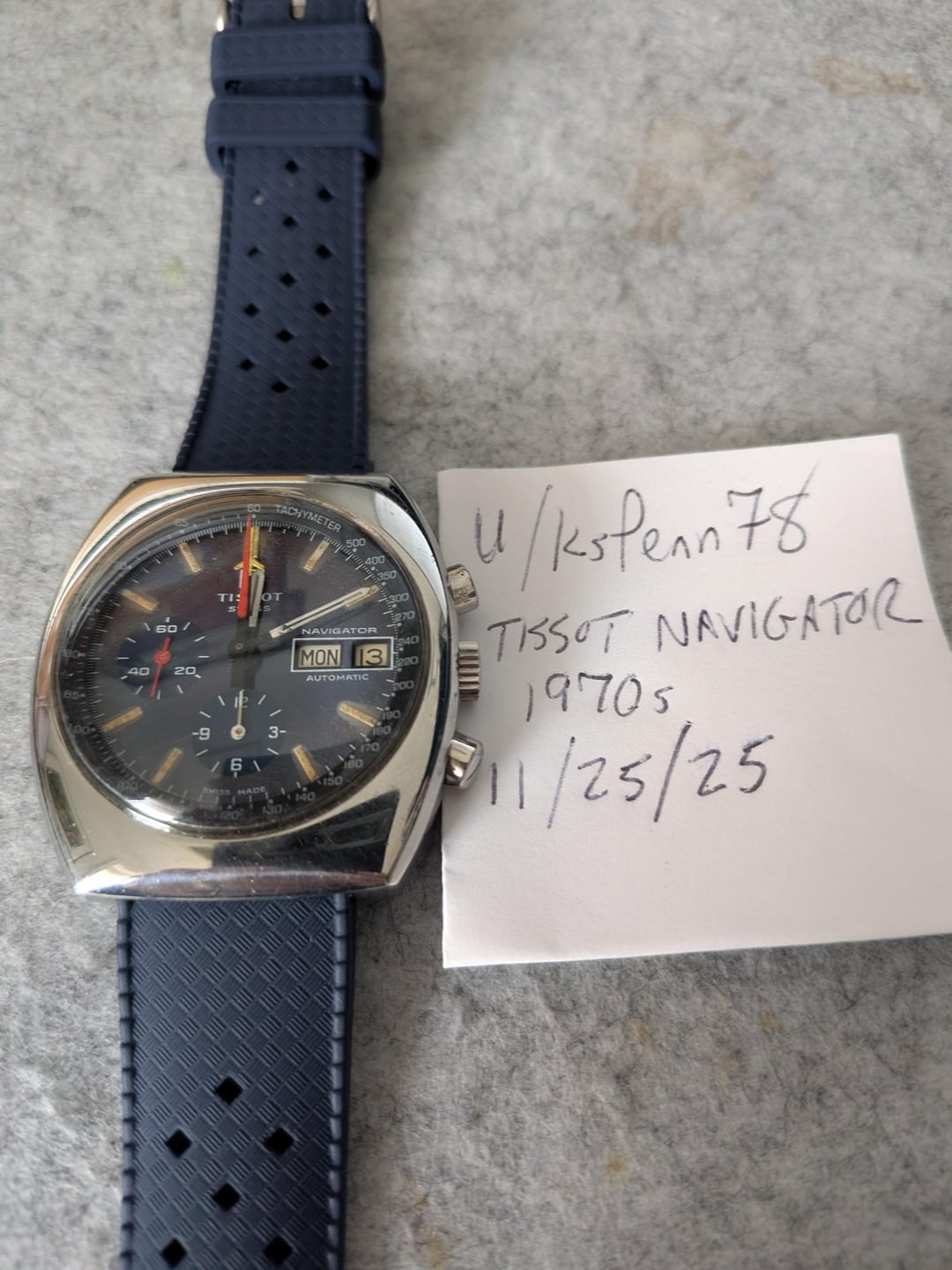 I am selling my vintage Tissot Navigator with the Lemania movement. The internals of the watch were completely cleaned and overhauled in July / August 2025 at Watch Repair & Co. on 47th Street in NYC - they provided a 1-year warranty (not sure if transferable, but I can provide the information). Tissot - Ref. 11003 - Cal. Lemania 5012 - Tissot 2920. Case reference is number 11003. Day and date wheels are in German. Subdial at 6 is for the chrono hours, at 9 is the running seconds. The airplane hand is for the chrono minutes, on the main dial itself. Size is 44mm top to bottom, 40mm side to side. This watch is in very good condition for being 50+ years old, and as noted above all time and chronograph functions are working perfectly. The blue tropical strap is new /unbranded. I'll throw in two leather straps in brown and black. Asking $1050 shipped (Venmo, Paypal). I am looking to pick up something else on this forum and need to sell a few things first! I have limited flair here but over 1,000 sales on eBay since 2000(!) with 100% positive feedback. I am comfortable on video chat or whatever.