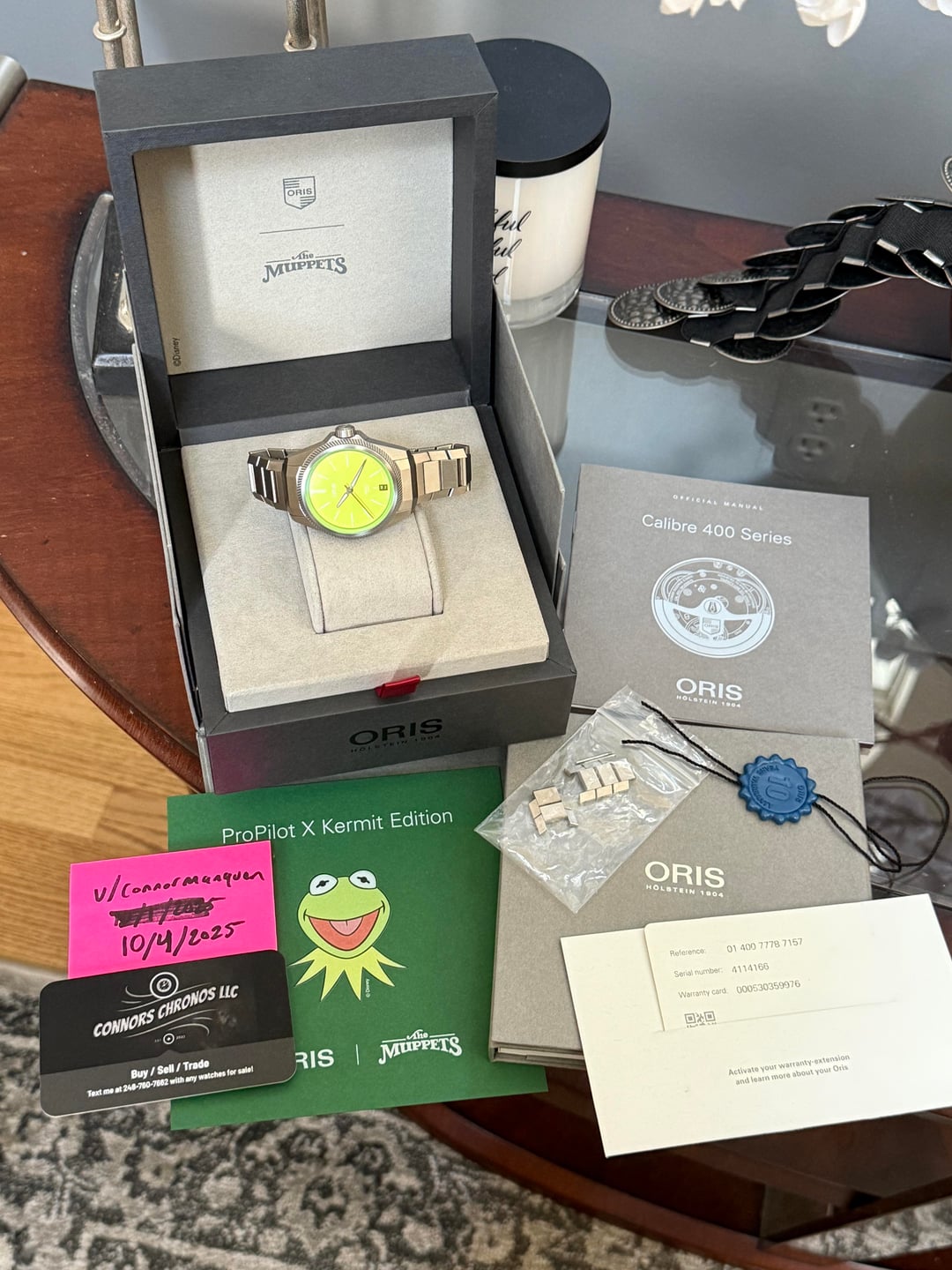 Oris Pro Pilot x Kermit Edition - Titanium Automatic Who doesn't love the Muppets and Kermit the Frog, a favorite of the muppets. This watch not only is a tribute to Kermit, but has one of the most unique and interesting green dials that takes on different hues. Its a green like no other. 39mm titanium case on titanium bracelet. Calibre 400 automatic, with five-day power reserve. Oris promises high accuracy and reliability with 10-year service intervals. Comes complete with boxes, booklets, extra links and papers. Reference 01 400 7778 7157-Set Price - $2,495 Shipped CONUS! This is one of the cheapest kermit’s i’ve seen on the market. Scoop it up while you can! Local pickup available in metro detroit area. Payment preferred is zelle, paypal f&f or wire! Thanks for looking.