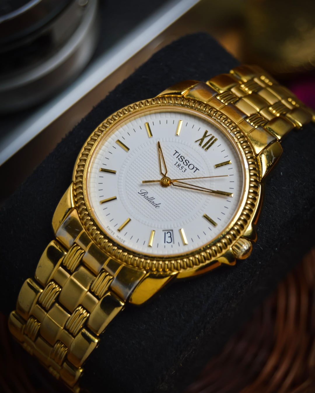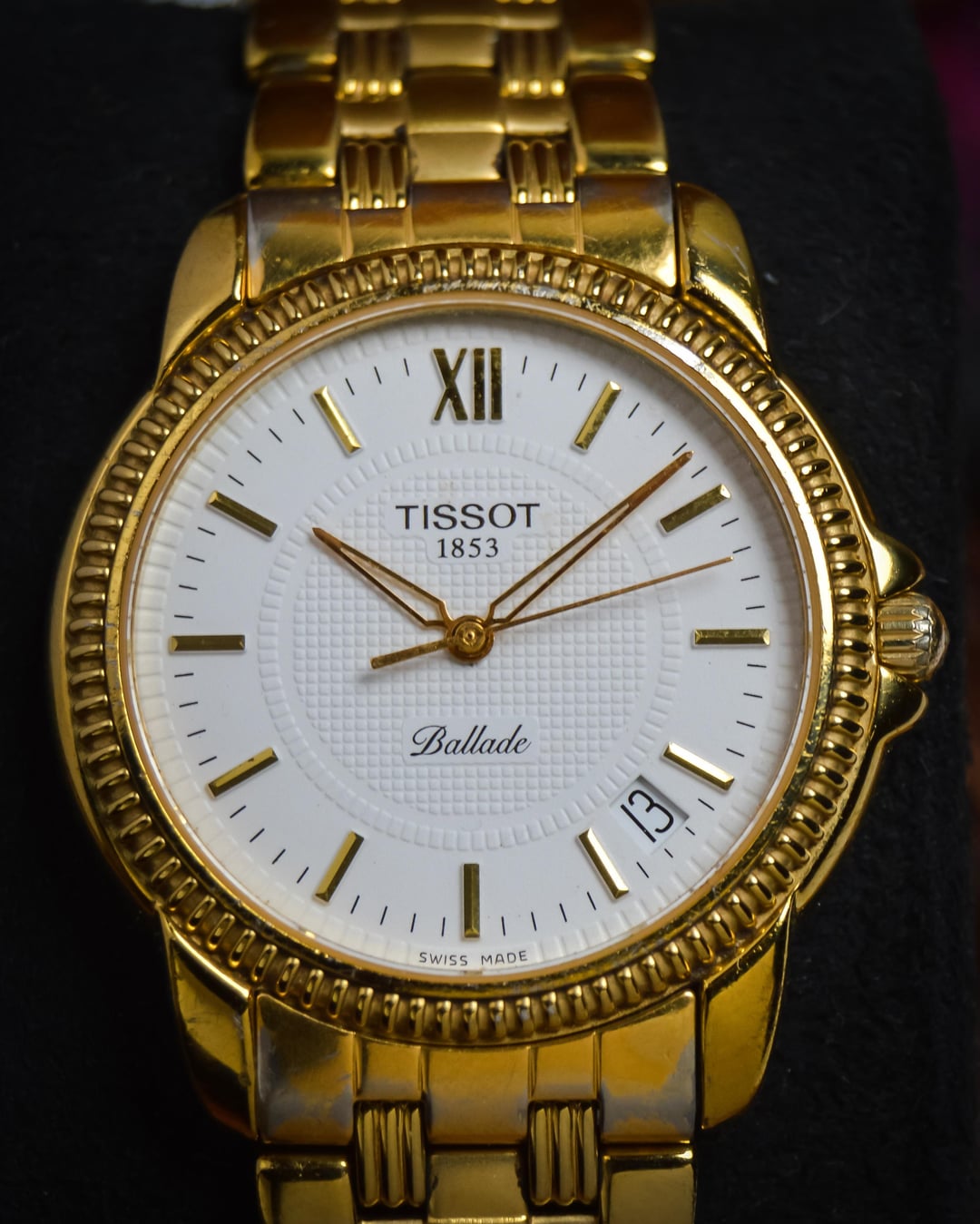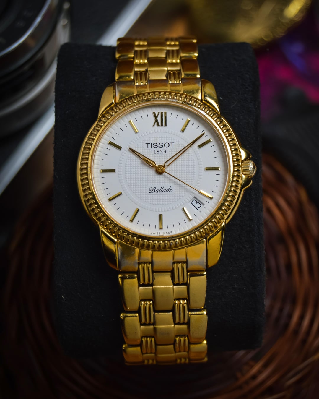 [Timestamp](https://postimg.cc/pyxnt8Ly) An embodiment of classic Swiss elegance, this vintage 1990s **Tissot Ballade (Ref. C277/377W)** boasts a refined gold-plated case and stainless steel bracelet with a timeless Roman-accented dial. The crisp white dial is adorned with golden applied indices and a bold Roman “XII,” while the central guilloché-style texture adds a quiet sophistication through its delicate interplay of light and detail. Powered by the reliable **7-jewel ETA Cal. 955.122 quartz movement**, this watch combines precision with enduring style. The sapphire crystal keeps the face clear and scratch-free, while the gently beveled gold bezel frames the dial with a subtle touch of flair. A practical date window rests between the 3 and 4 o’clock markers—discreet and functional. Despite its age, the watch exhibits minimal signs of wear. A beautiful statement piece, ideal for both collectors and those seeking a dependable dress companion. **Dimensions:** • Case Diameter: 36mm • Thickness: 10mm • Lug Width: 18mm I'm asking for **$199 shipped (or Best Offer)** via **UPS**. Payment methods: **PayPal F&F**, **PayPal G&S (+4.5% International PayPal G&S Fees)**, or **bank wire (US banks accepted)**. Feel free to ask for a custom timestamp, and be sure to check out the other watches in my collection. Follow my **Instagram** through the link in my **Reddit profile** for more vintage finds and upcoming listings. Elevate your wrist game with this vintage Tissot—**Swiss precision meets classic charm.**