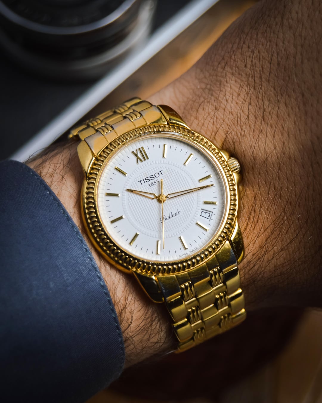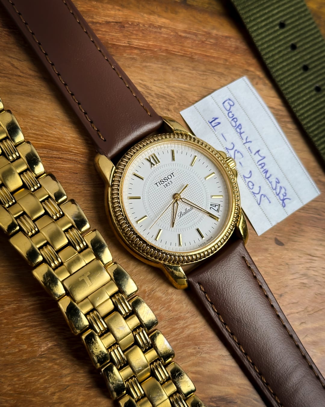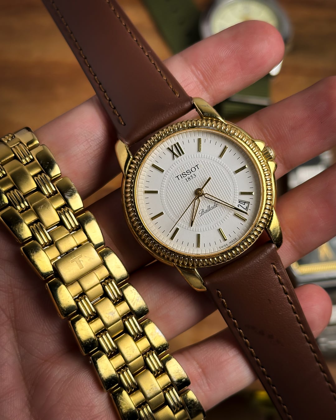 [Timestamp](https://postimg.cc/pyxnt8Ly) An embodiment of classic Swiss elegance, this vintage 1990s **Tissot Ballade (Ref. C277/377W)** boasts a refined gold-plated case and stainless steel bracelet with a timeless Roman-accented dial. The crisp white dial is adorned with golden applied indices and a bold Roman “XII,” while the central guilloché-style texture adds a quiet sophistication through its delicate interplay of light and detail. Powered by the reliable **7-jewel ETA Cal. 955.122 quartz movement**, this watch combines precision with enduring style. The sapphire crystal keeps the face clear and scratch-free, while the gently beveled gold bezel frames the dial with a subtle touch of flair. A practical date window rests between the 3 and 4 o’clock markers—discreet and functional. Despite its age, the watch exhibits minimal signs of wear. A beautiful statement piece, ideal for both collectors and those seeking a dependable dress companion. **Dimensions:** • Case Diameter: 36mm • Thickness: 10mm • Lug Width: 18mm I'm asking for **$199 shipped (or Best Offer)** via **UPS**. Payment methods: **PayPal F&F**, **PayPal G&S (+4.5% International PayPal G&S Fees)**, or **bank wire (US banks accepted)**. Feel free to ask for a custom timestamp, and be sure to check out the other watches in my collection. Follow my **Instagram** through the link in my **Reddit profile** for more vintage finds and upcoming listings. Elevate your wrist game with this vintage Tissot—**Swiss precision meets classic charm.**